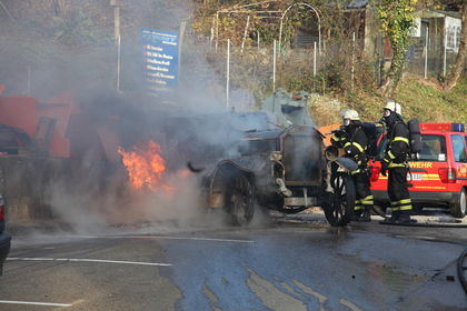 Die Feuerwehr Wolfach musste sich gestern beim Einsatz im Gewerbegebiet am Straßburgerhof von ihrer Oldtimer-Kraftfahrspritze verabschieden. Das Fahrzeug parkte in der Lagerhalle die in Flammen stand. Für den historischen Benz der Wolfacher Wehr kam jeder Rettungsversuch zu spät.