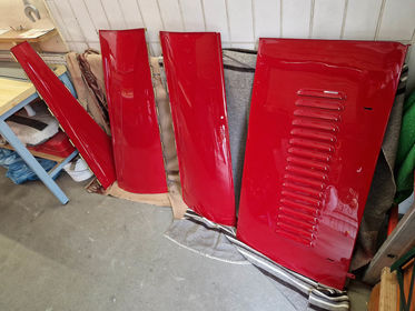 Mit der Motorhaube konnten wir nun die letzten Teile beim Lackierer abholen. Auch die Haube erstrahlt jetzt wieder in ihrem glänzenden rot.