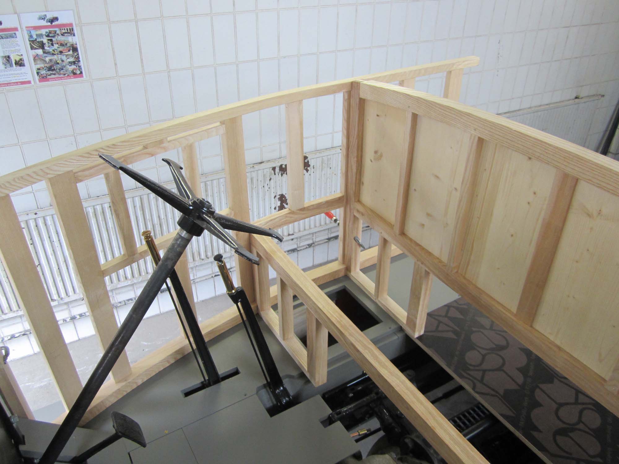 Der Aufbau wurde anhand einer Schablone erstellt, passt aber nun auch exakt auf das wirkliche Fahrzeug. Bis der vordere Teil des Aufbaus (bis zu den Mannschaftsraumtüren)fertig ist muss nun noch die Sitzbank und die Innenverkleidung hergestellt werden. Auch im Bereich der vorderen Sitze muss der Kraftstofftank noch eingepasst werden. Fast der ganze Aufbau musste rekonstruiert werden, da bis auf einige Teile der Sitzbänke nichts übrig geblieben war. Durch die alten Profilleisten konnten wir die frühere Höhe feststellen und die Form ergibt sich aus der unteren Konstruktion. Der Rest wurde anhand von zahlreichen Fotos nachgefertigt. Vor der Herstellung des Holzaufbaus wurde zuerst ein 3D-Modell des Holzaufbaus gezeichnet um eine bessere Vorstellung der Konstruktion zu bekommen und noch Details zu klären.