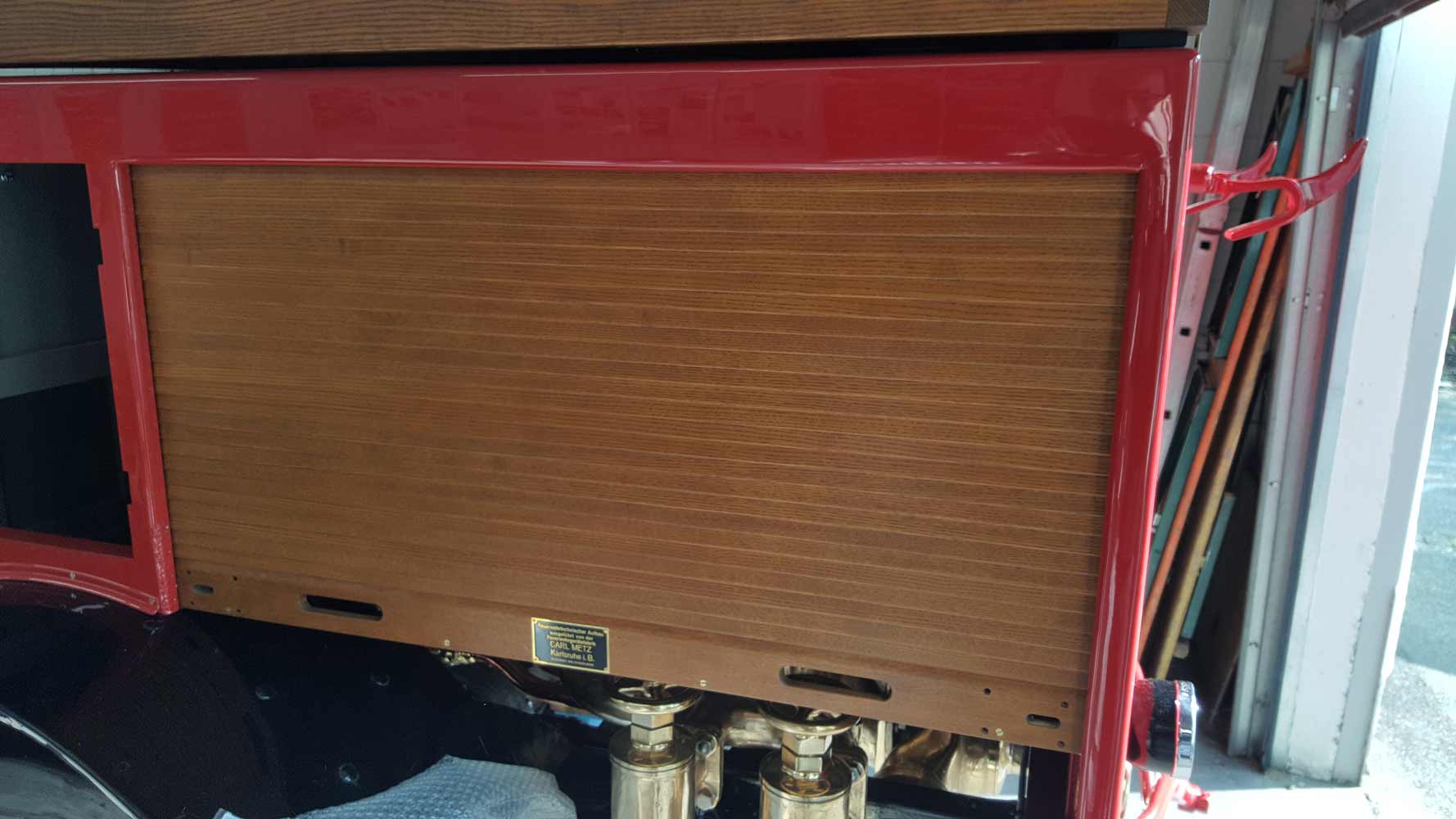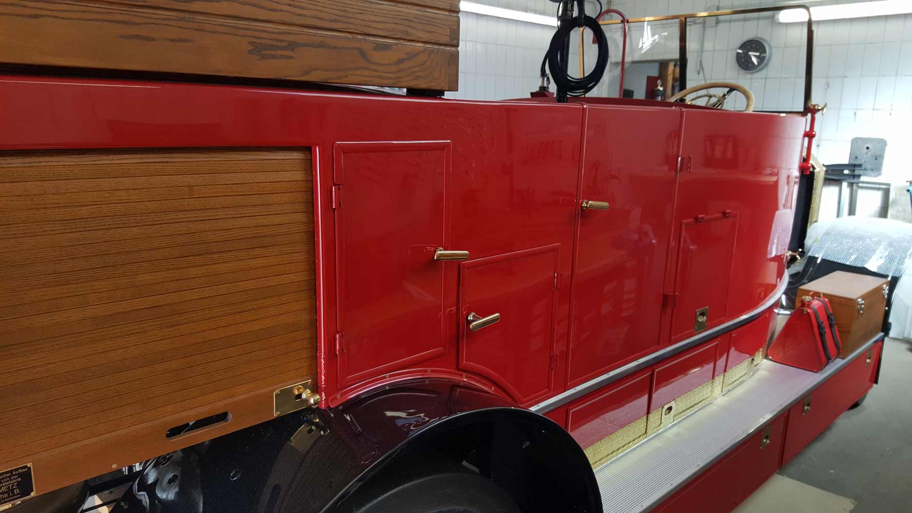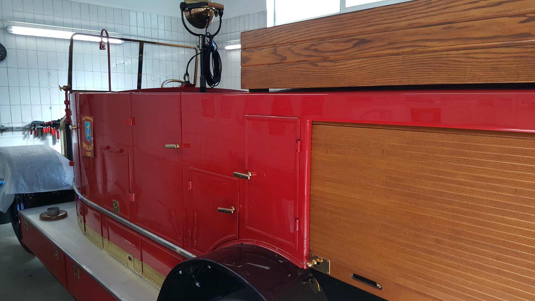 Mit den hinteren Geräteraumtüren, sind nun auch die letzten Klappen des Aufbaus wieder montiert. Auch der Rollladen aus Holz, der auf beiden Seiten die tragbaren Schlauchhaspeln schützt, ist wieder fest eingebaut und lässt sich wieder öffnen und schließen.