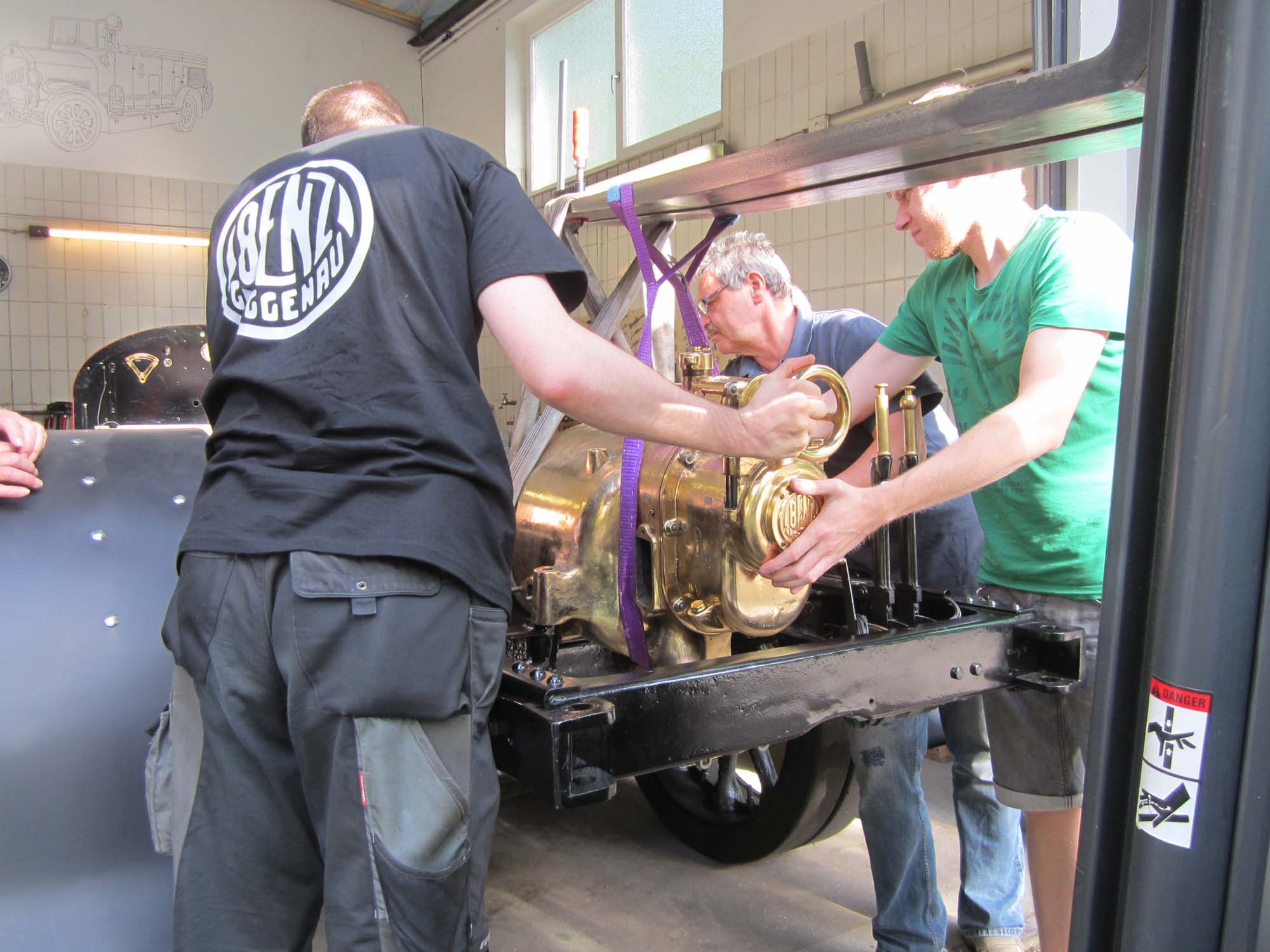 Um die dreistufige Feuerlöschkreiselpumpe im Heck einzubauen, haben wir das Fahrzeug gedreht. So konnte der Benz die Halle das erste Mal auf eigenen Räder verlassen – allerdings noch durch Muskelkraft angetrieben.
