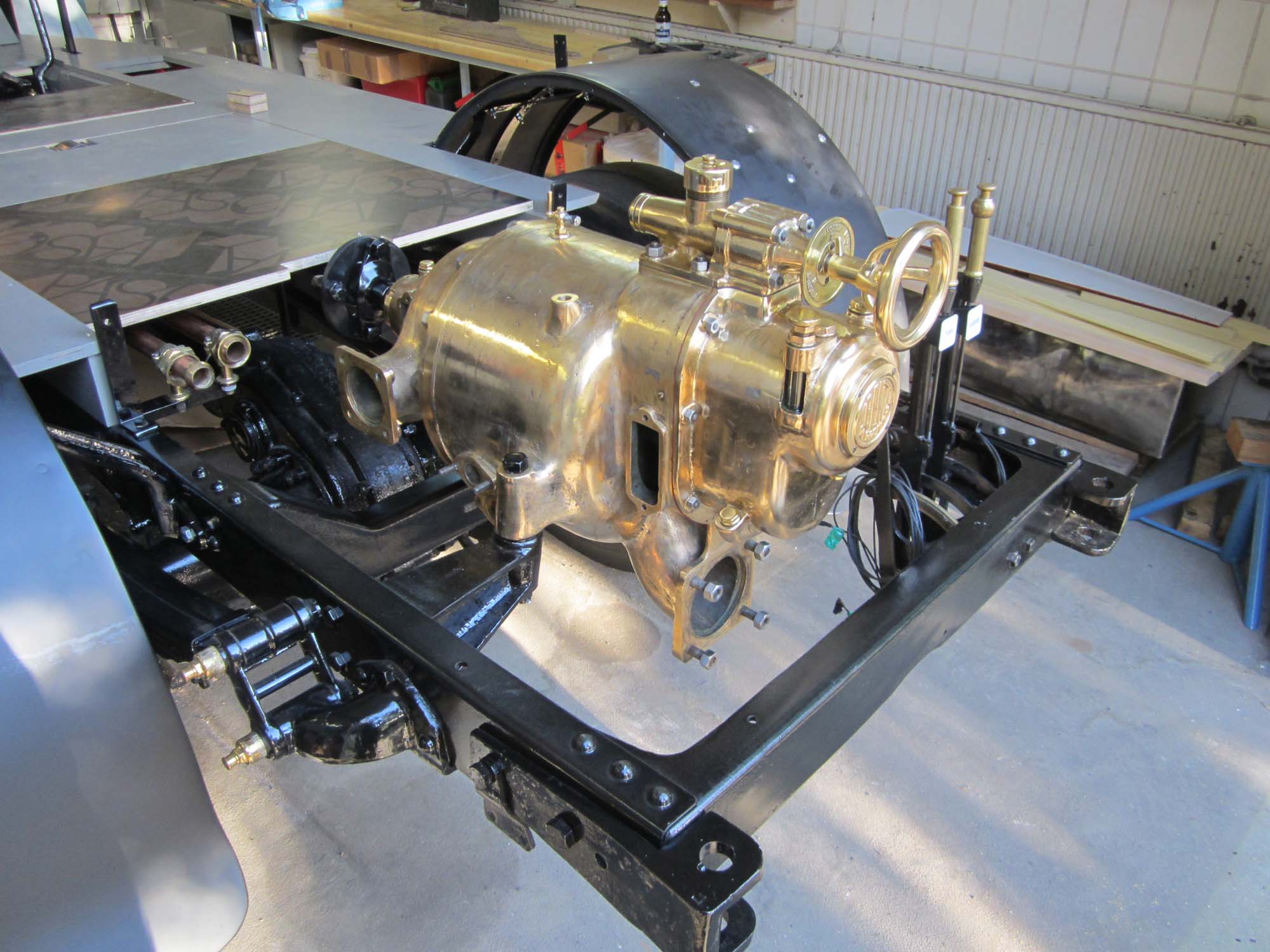 Mit einem Gabelstapler wurde die Pumpe dann vorsichtig an die entsprechende Stelle im Heck des Rahmens gelupft und befestigt. Auch die Antriebswelle, mit der die Pumpe vom Fahrzeugmotor angetrieben wird, wurde angeschlossen. Es fehlen jetzt noch die Pumpenabgänge, Ansaugrohr sowie die Anschlüsse des Kühlkreislaufes. Diese Teile sind schon alle poliert und lackiert und müssen nur noch montiert werden.