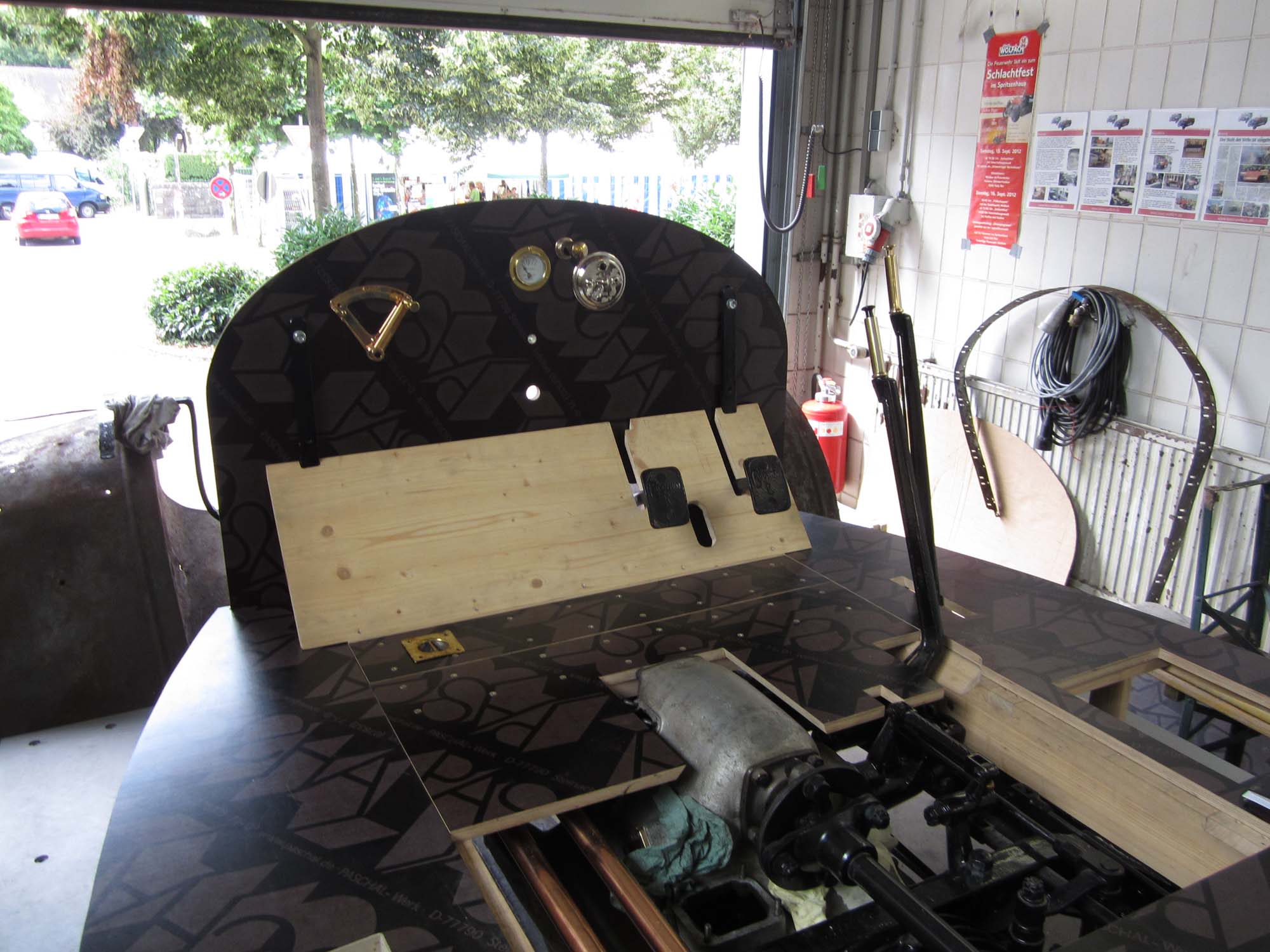 Auch das Armaturenbrett nimmt langsam Formen an. Die Außenkonturen sind fertiggestellt und die Aussparungen für die Armaturen sind auch gefräst. Da vom alten Armaturenbrett nach dem Brand nichts übrig blieb mussten die gesamten Maße neu konstruiert werden. Die Position der Instrumente ließ sich nur anhand vorhandener Fotos ermitteln. Diese Teile mussten übrigens alle neu beschafft oder nachgefertigt werden. Arbeiten an einzelnen Teilen, wie zum Beispiel dem Ölschauglas sind noch im Gange.