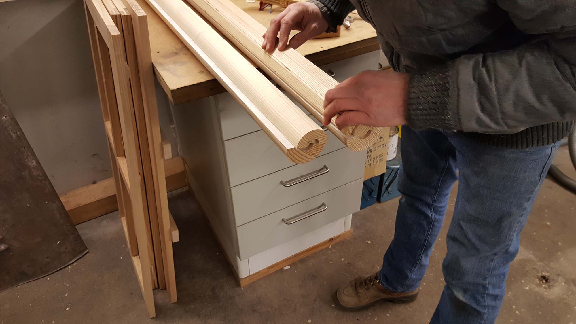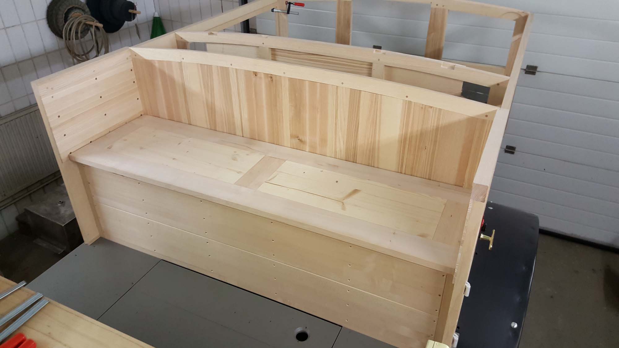 Die Seitenteile, die Rückwand, die Mittelwand sowie die Sitzbank wurden positioniert und miteinander verschraubt. In der Rückwand und der mittleren Wand wurde die Nut für den Rollladen und die Aussparung für die Rollladenwelle gefräst. Die Lamellen für den Rollladen sind ebenfalls gefräst und müssen nun noch zusammengebaut werden. Auch die Rollladenwelle, die aus zwei halbrunden Profilen mit unterschiedlichem Radius besteht, wurde auf der Drehmaschine hergestellt.
