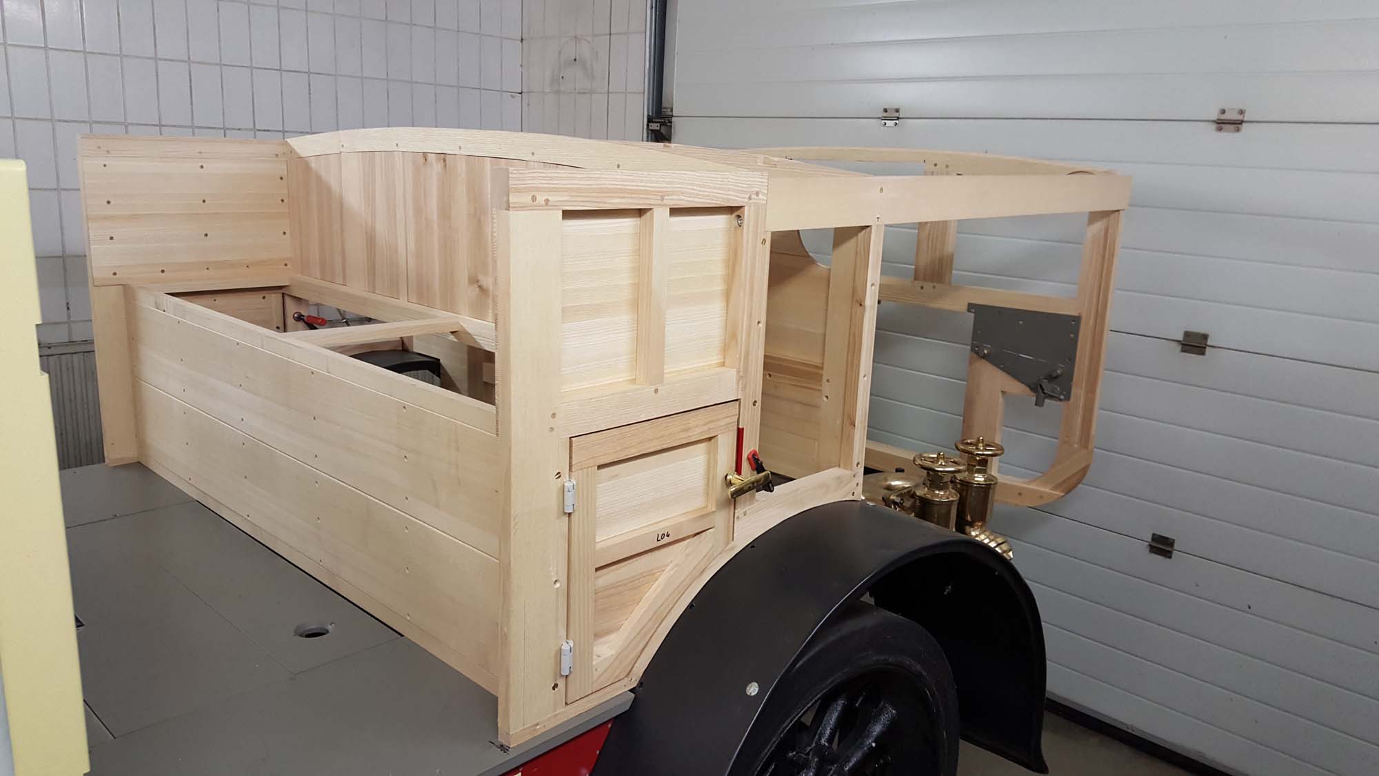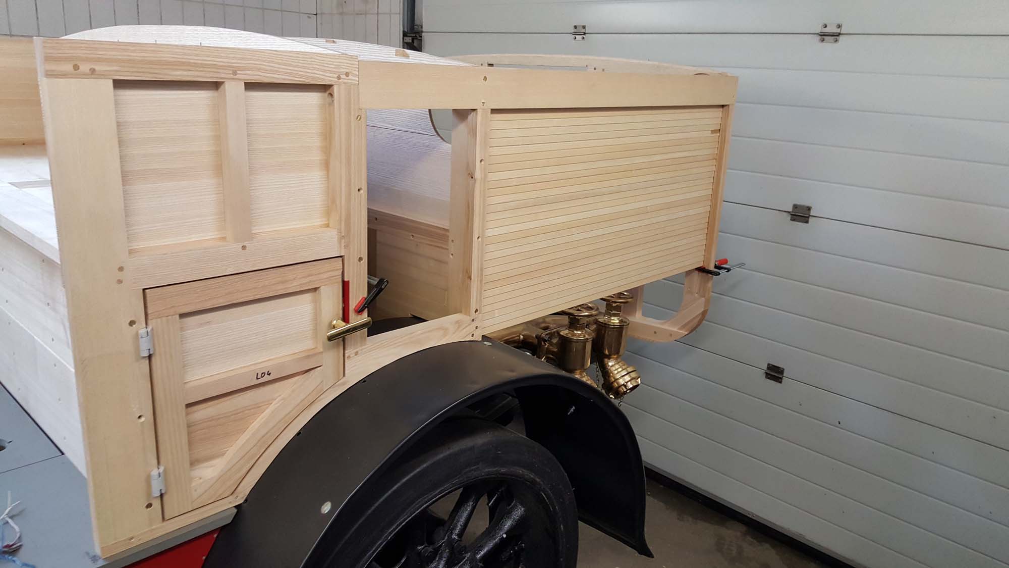 In den Seitenwänden wurden die ersten Türen angepasst. Dabei müssen die Ausschnitte für die Scharniere und Schloss gefräst werden. Die Türen haben dabei auch eine hölzerne Innenverkleidung erhalten. Auf der Außenseite werden diese dann nach der Grundierung mit Blech beplankt.