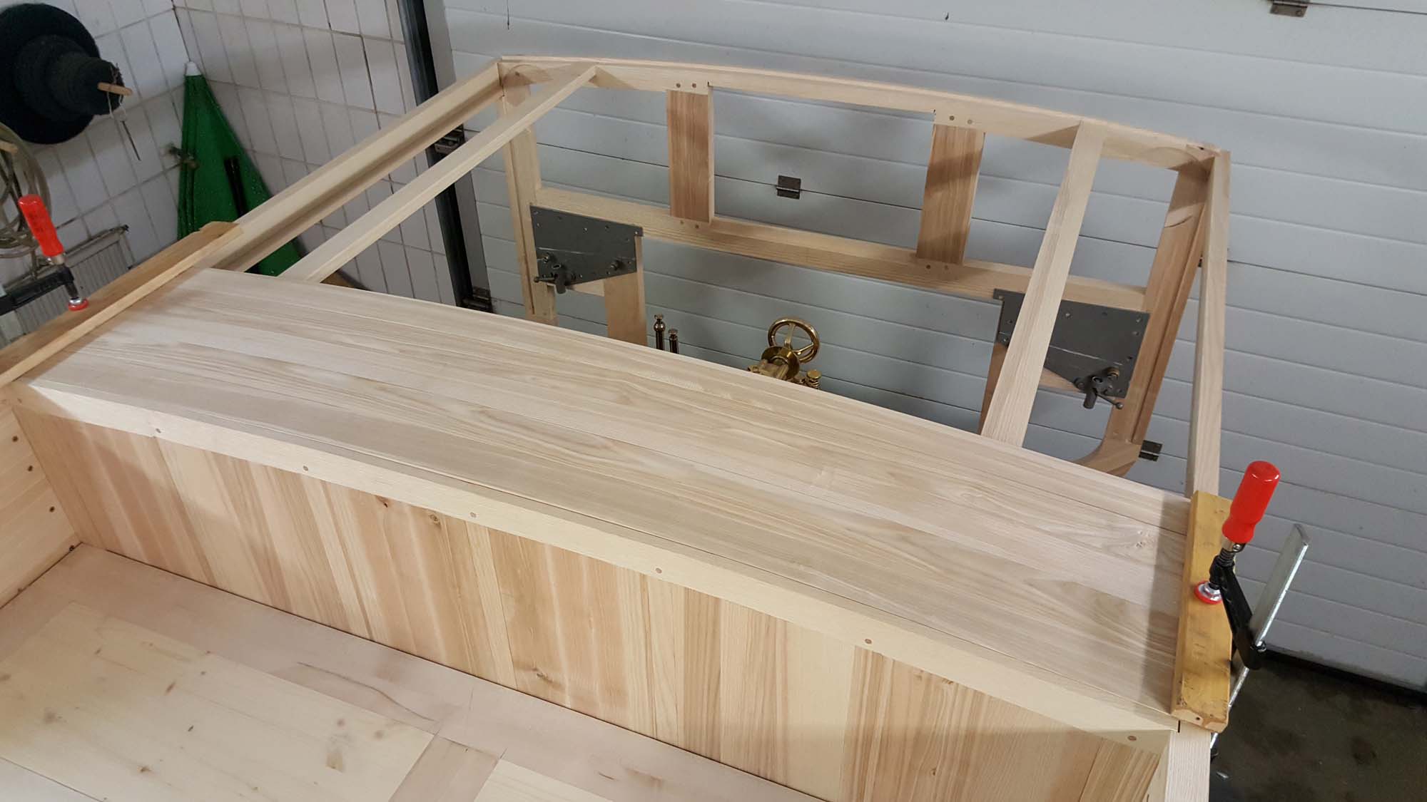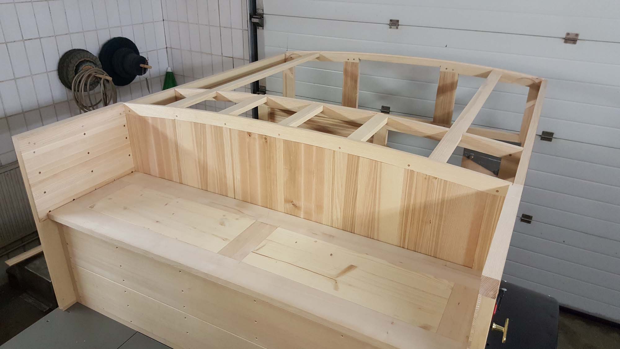 Mittlerweile gehen die Arbeiten am hinteren Teil des Holzaufbaus gut voran.