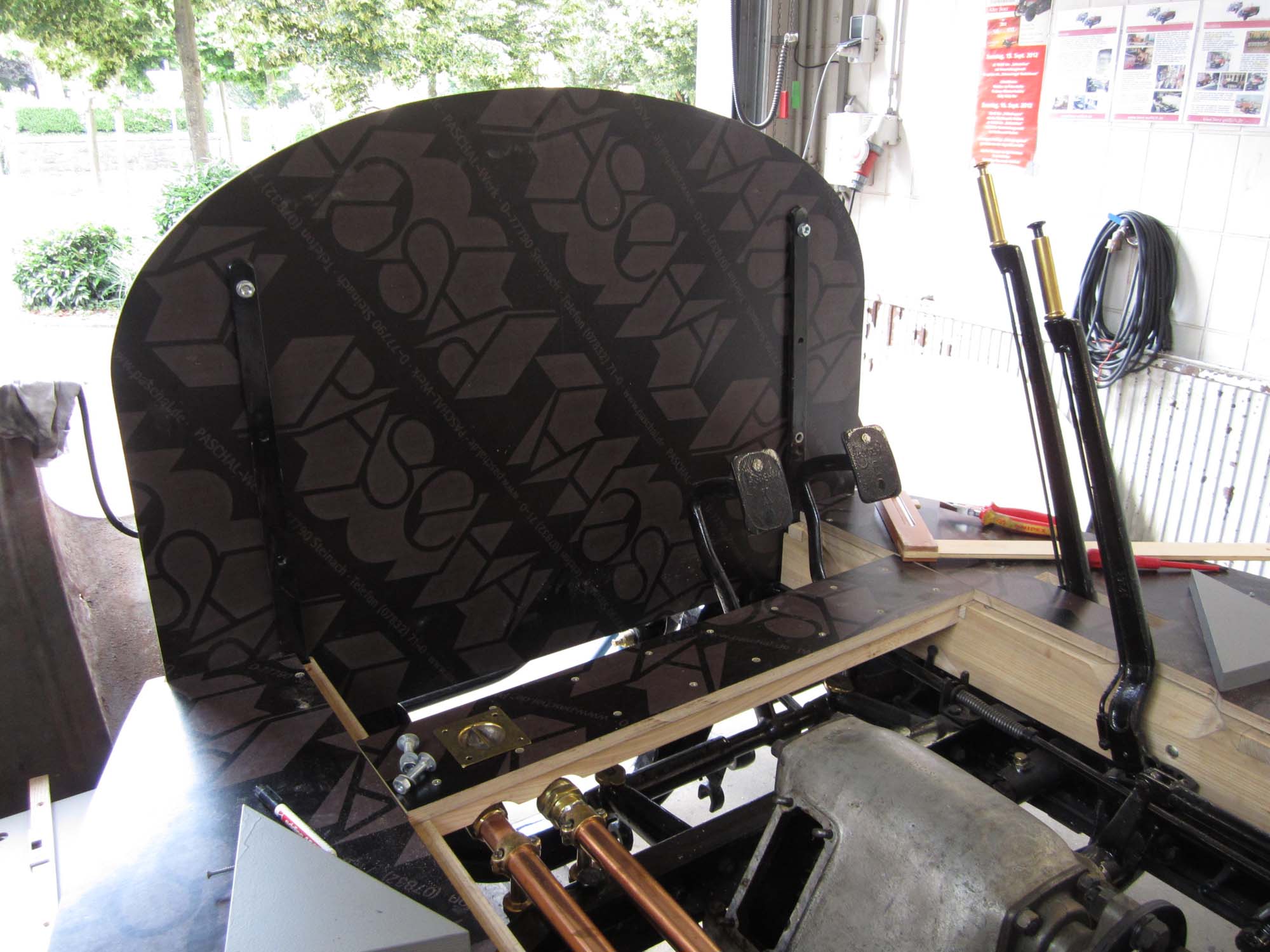 Um sicherzustellen, dass der Übergang von Motorhaube zum Aufbau später keine Probleme bereitet, wurde für das Armaturenbrett (Spritzbrett) zuerst ein Modell erstellt. Mit leichten Korrekturen wurde jetzt das endgültige Armaturenbrett gesägt. Eine besondere Schwierigkeit stellt hier die gebogene Form dar. Da nach dem Brand von diesem Bauteil nichts übrig blieb, muss alles neu konstruiert werden. Der Bogen kann nur anhand von noch vorhandenen, aber stark deformierten Blechteilen und Bildern rekonstruiert werden. Ebenso die Anordnung der Armaturen. Auch diese müssen auf Grundlage von Fotos positioniert werden. Um den Grundrahmen für den Aufbau zu fertigen, wurde eine Schablone mit den genauen Ausmaßen des Fahrzeuges erstellt. Dieser Rahmen wird in den nächsten Monaten erstellt werden.