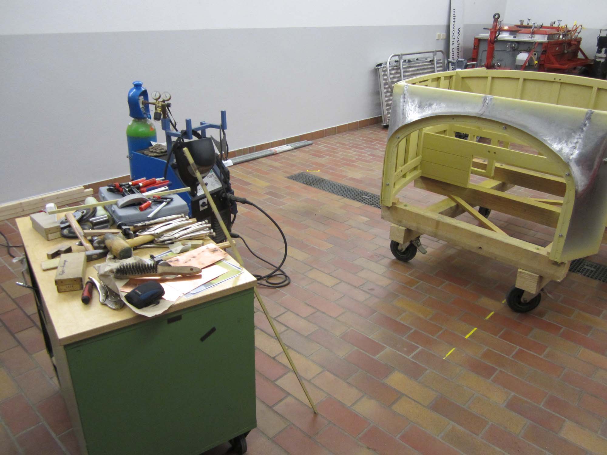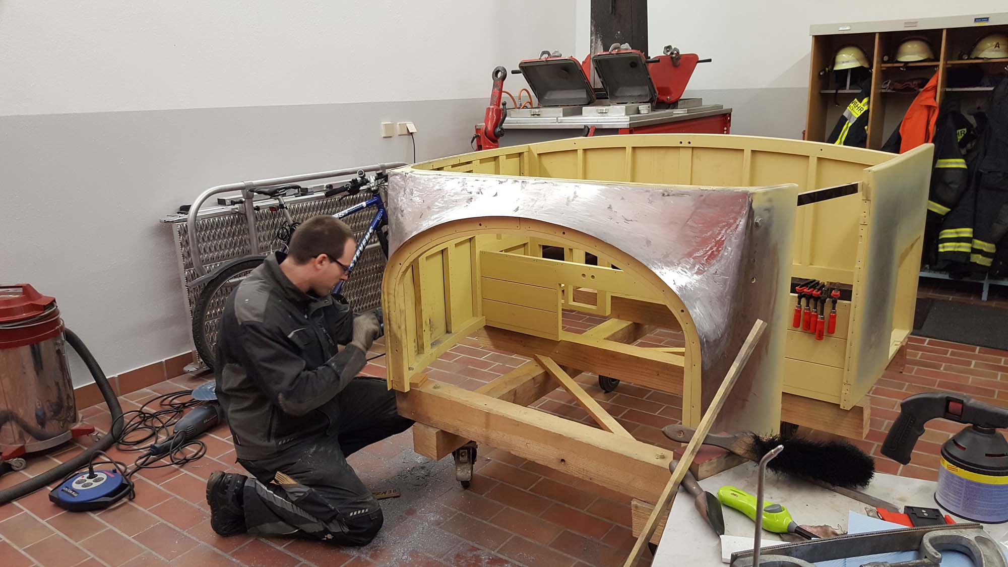Die Arbeiten an der Karosserie haben vom ersten Zuschnitt bis zur Grundierung insgesamt 232 Arbeitsstunden in Anspruch genommen. 160 Stunden fielen dabei allein auf den vorderen Teil. Ein besonderer Dank gilt dabei Andreas Göhring und Winfried Fritsch, die bei den Arbeiten unterstützt haben.