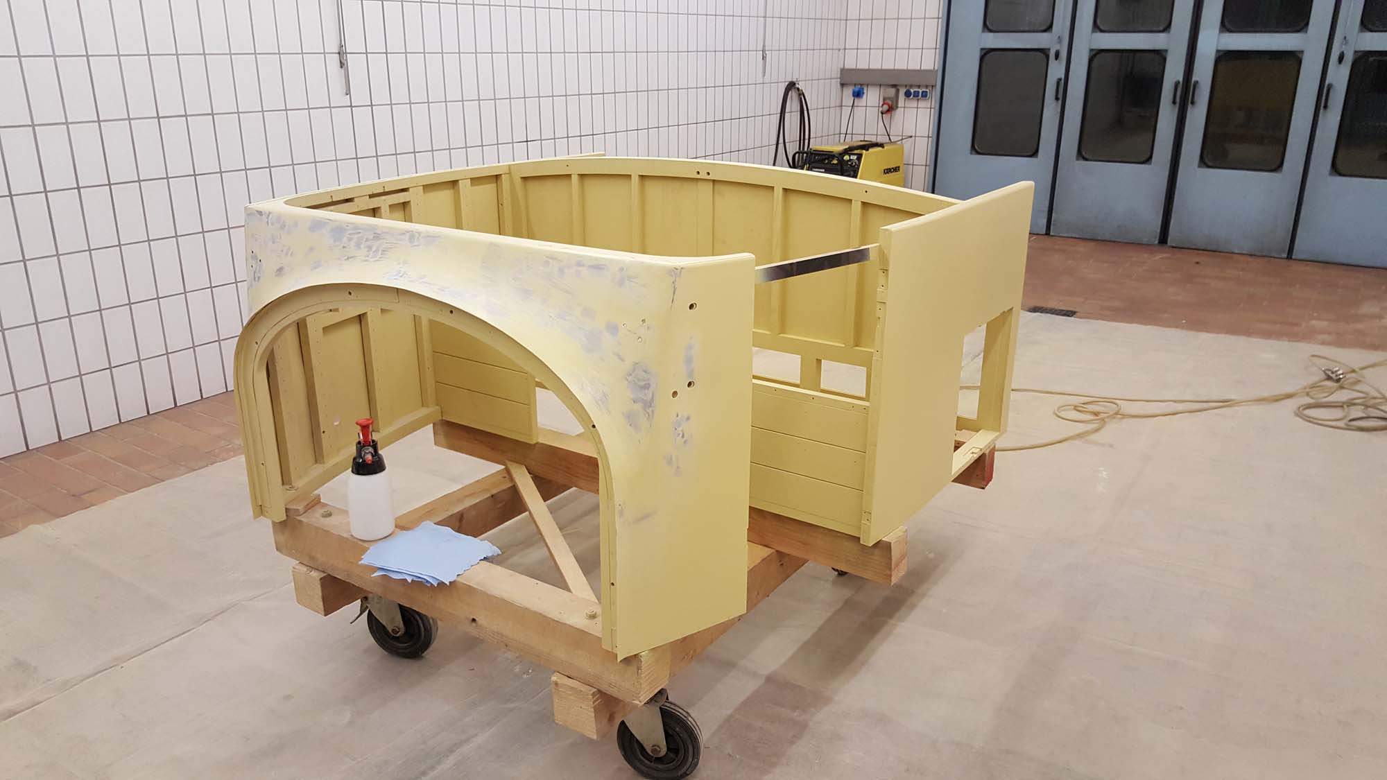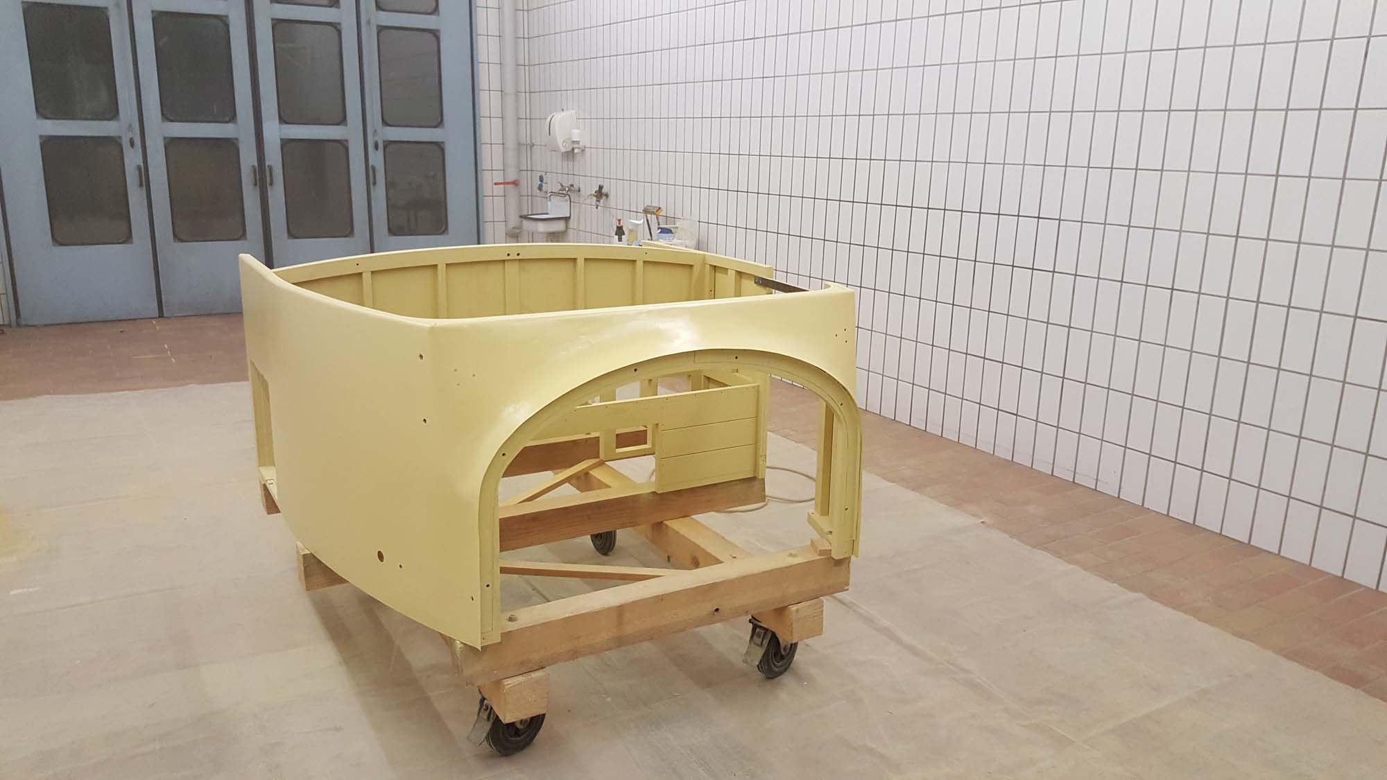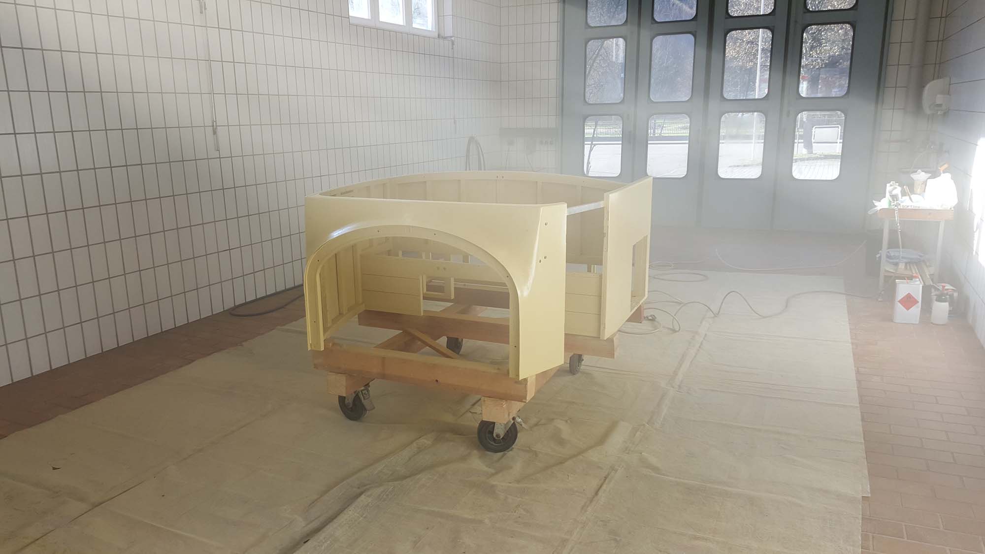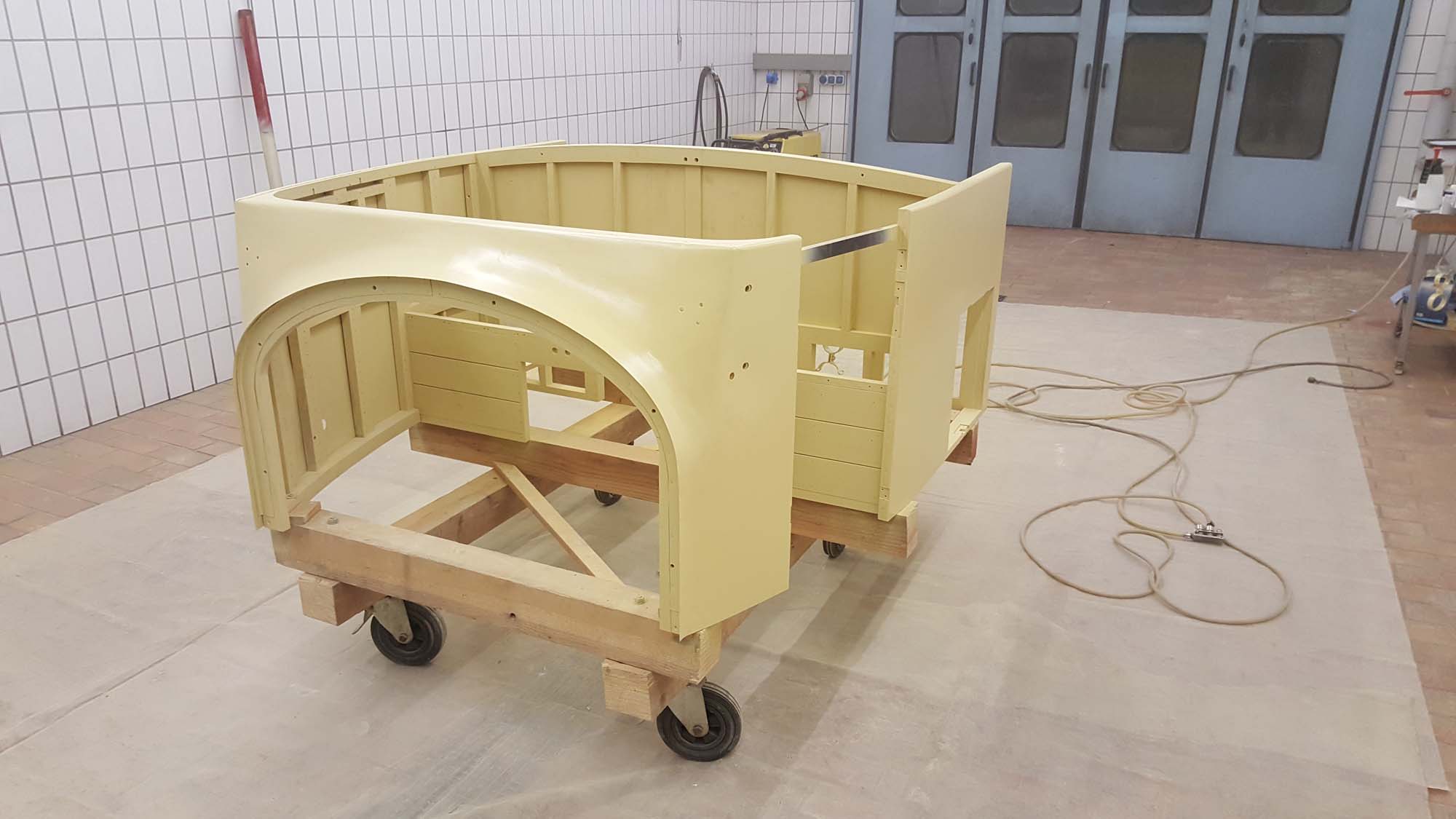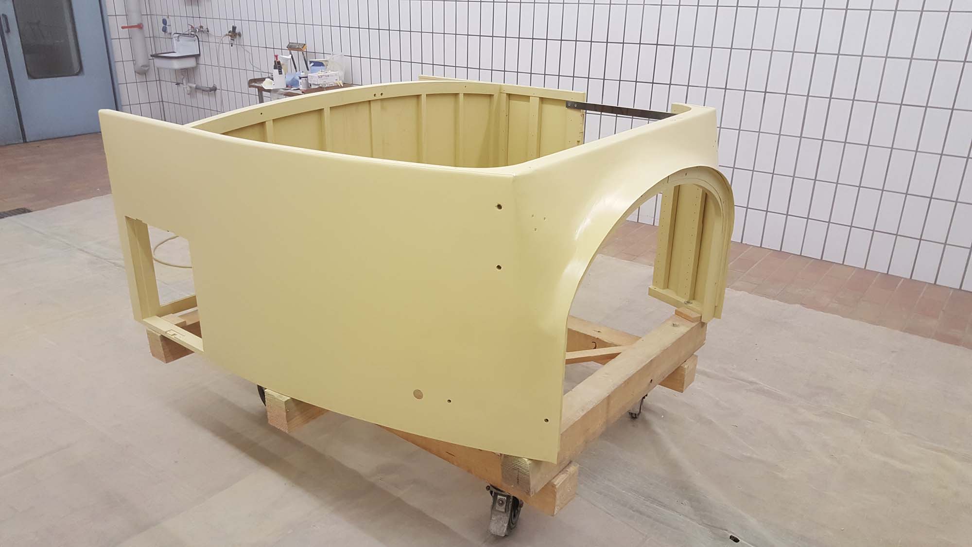 Die aufwendigen Arbeiten an der Karosserie des vorderen Aufbaus sind nun abgeschlossen. Somit ist einer der schwierigsten Teile des Wiederaufbaus überwunden. Besonders der vordere Teil, bei dem die Form des Aufbaus in die Form der Motorhaube übergeht, war hier eine besondere Herausforderung.