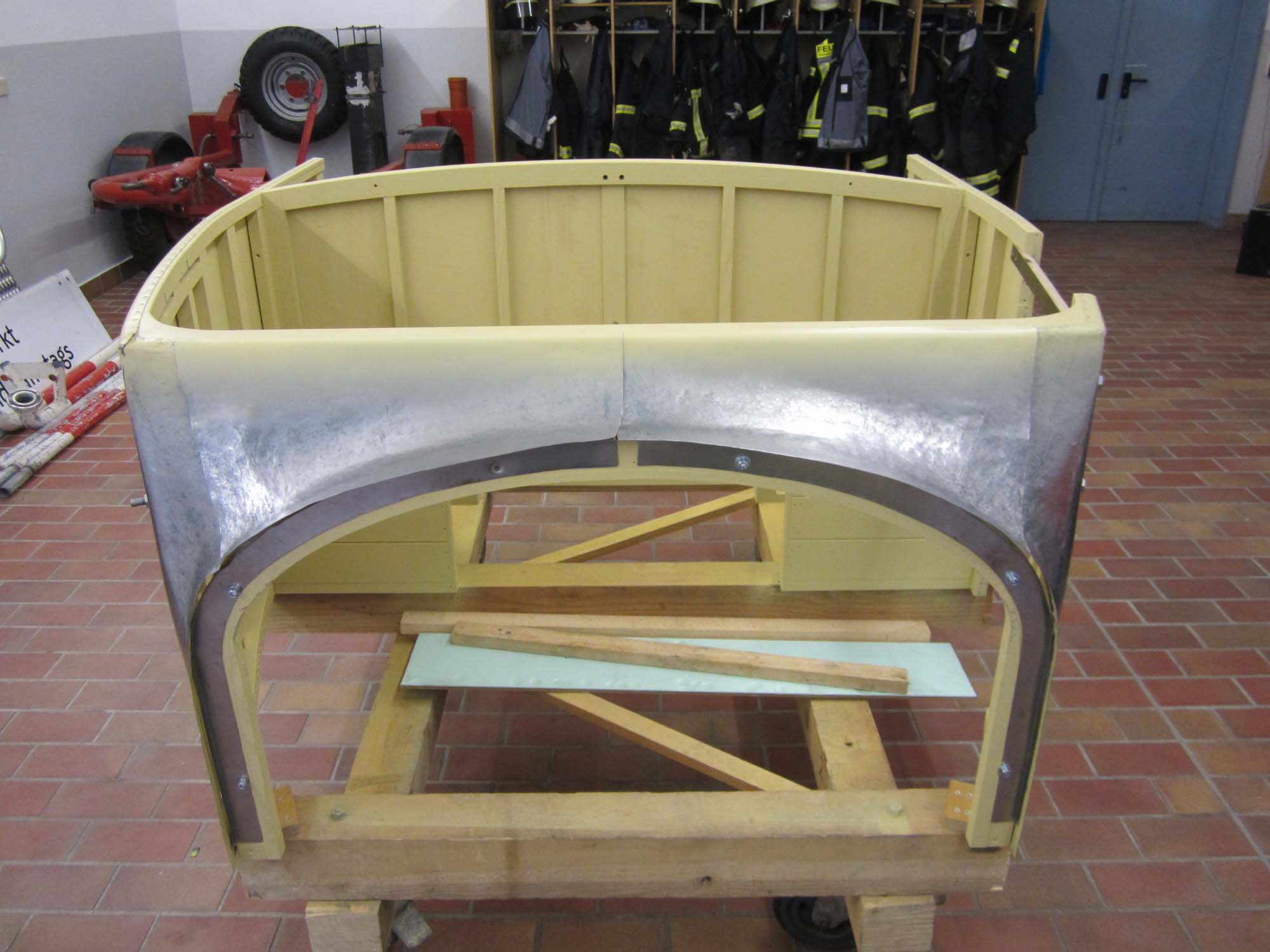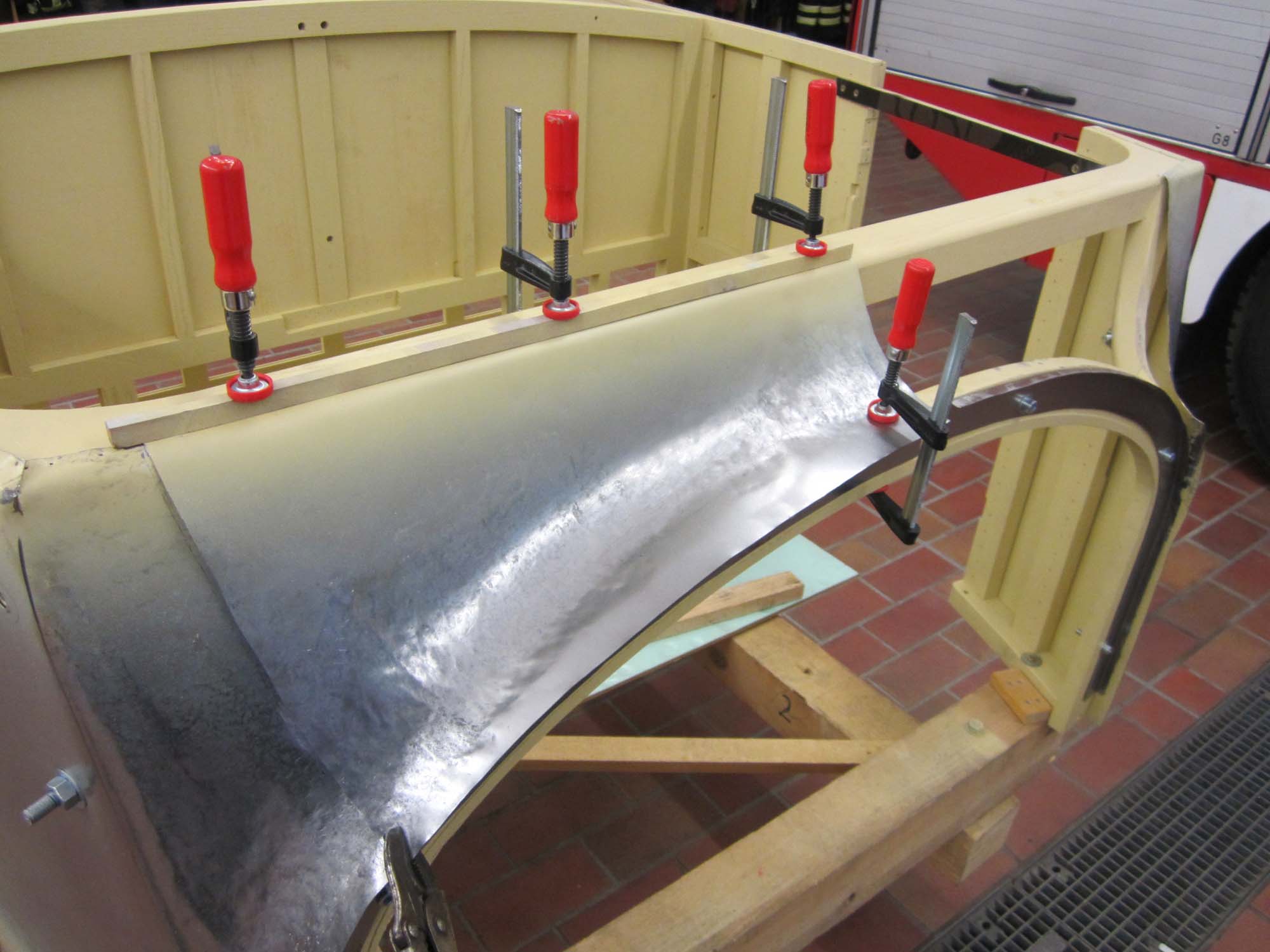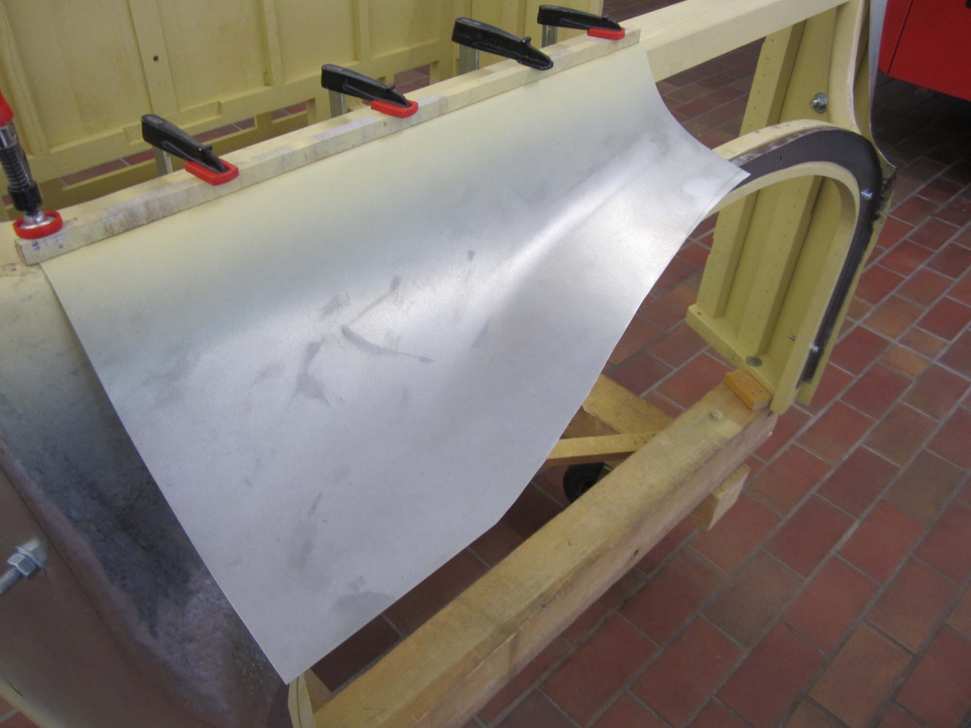 Dabei besteht der vordere Teil nicht nur aus einem Blech sondern aus zwei Teilen, die dann an den  beiden Seitenwände anschließen. So war es auch schon beim Originalblech gemacht. Das zuvor auf den Holzaufbau aufgenagelte Karosserieblech musste dazu erst einmal grob in Form gebracht werden. Dies wurde mit einem speziellen Holzhammer durchgeführt. Die vorderen Teile der Seitenwände wurden dabei grob in Richtung Mitte umgebördelt. Überschüssiges Blech konnte dann mit der Blechschere entfernt werden. Die Seitenbleche laufen dabei etwa 10 Zentimeter auf der Vorderseite in Richtung Aufbaumitte. Aufgrund der großen Formänderung des Blechs kann das seitliche Blech nicht bis in die Mitte geführt werden. In diesem Bereich sind dann zwei extra Blechteile eingesetzt. Auch diese wurden mit Hilfe des Holzhammers in die entsprechende Form gebracht. Besonders schwierig wird dies dadurch, dass das Blech hier in zwei Richtungen gebogen werden muss. Nach der Herstellung der groben Form, wurden die beiden mittleren Blechteile in der Mitte zusammengeschweißt und verschliffen. Im Anschluss daran folgte die Grundierung der Innenseite. Danach folgte noch einmal eine Bearbeitung mit dem Holzhammer um die Form weiter zu verbessern. Um das Blechteil zwischen die beiden Seitenteile einzusetzen wurde der überlappende Rand so abgeschnitten, dass die Bleche stumpf verschweißt werden können. Nach dem Punkten folgte dann das Schweißen, womit die Karosserie dann zu einem Stück zusammen gewachsen ist. Für die endgültige Form wurde das Blech dann noch einmal mit dem Holzhammer bearbeitet. Um die restlichen Unebenheiten zu entfernen und das Blech zu stabilisieren folgte dann die Verzinnung mit Karosseriezinn. Hierbei wird das Blech erwärm und mit dem zähflüssigen Zinn überzogen. Auch die Form kann dadurch noch etwas modelliert werden. Nachdem das Zinn erkaltet ist, folgte die mechanische Bearbeitung mit der Karosseriefeile. Die endgültige Oberfläche erhält man dann durch Schleifen. Nach dem Schleifen folgte dann die Grundierung der Karosserie. Kleine Unebenheiten wurden danach noch mit Spachtelmasse korrigiert, bevor dann die zweite und letzte Grundierschicht erfolgt.