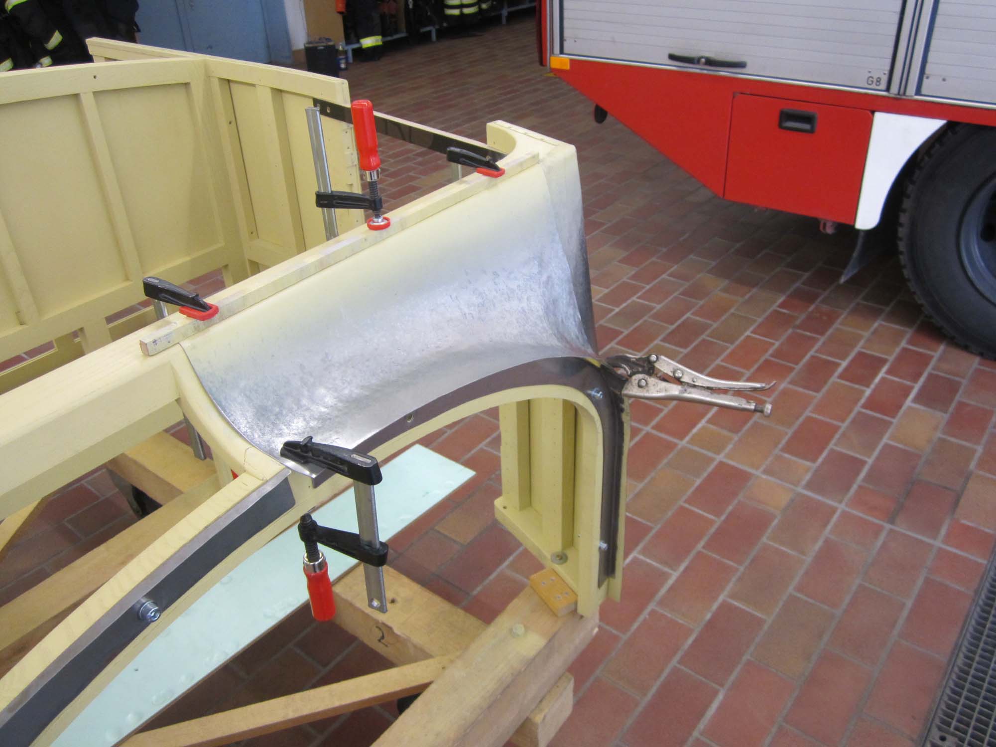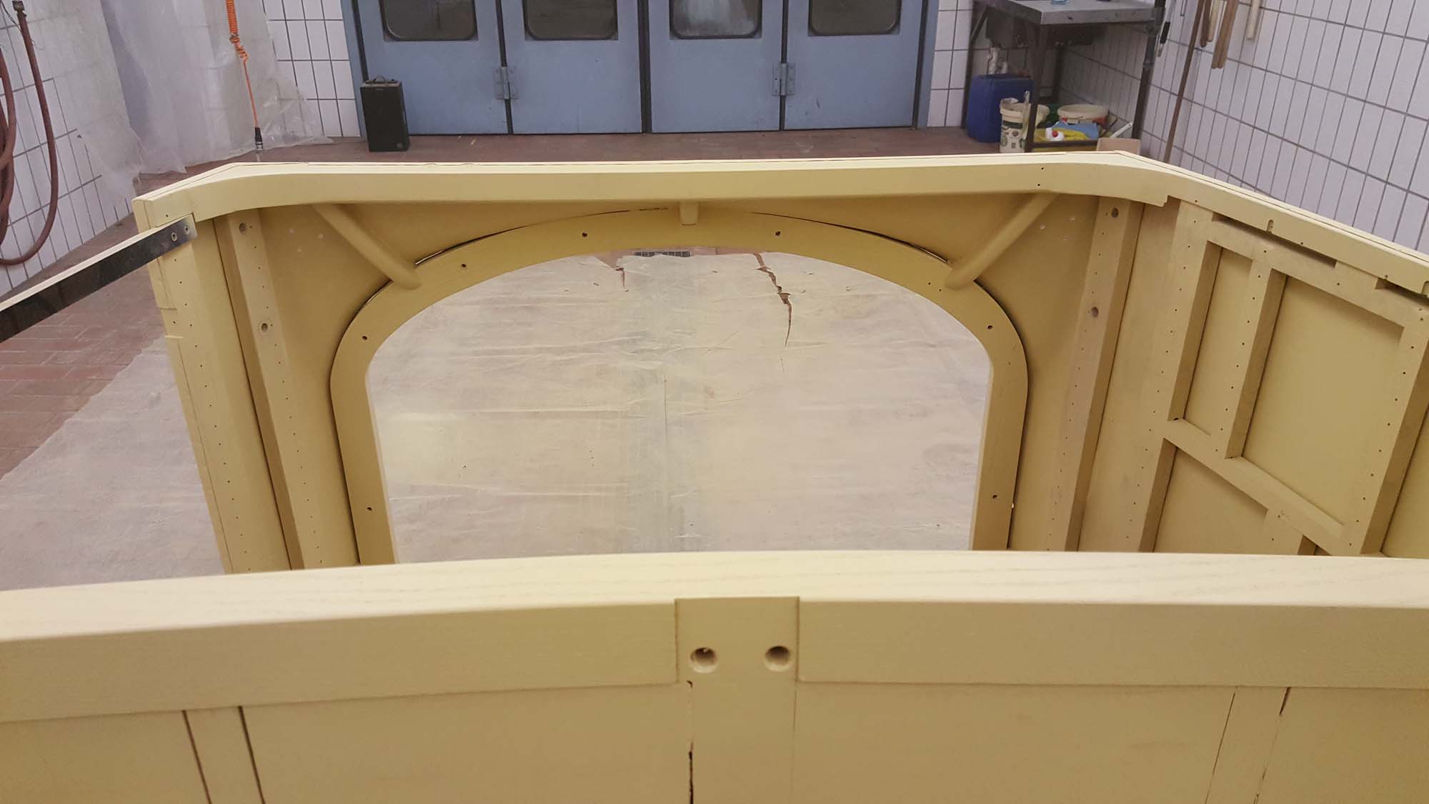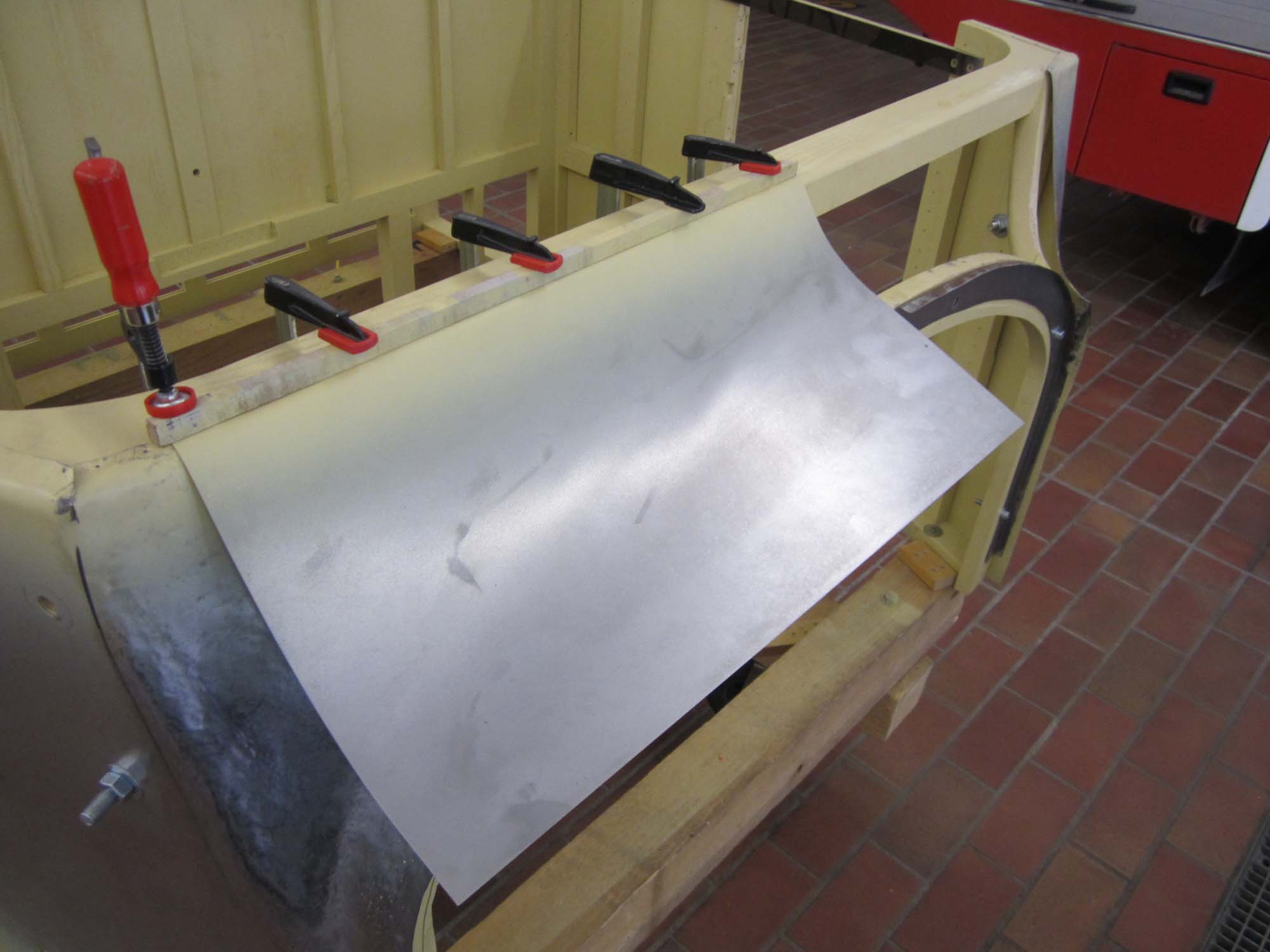 Dabei besteht der vordere Teil nicht nur aus einem Blech sondern aus zwei Teilen, die dann an den  beiden Seitenwände anschließen. So war es auch schon beim Originalblech gemacht. Das zuvor auf den Holzaufbau aufgenagelte Karosserieblech musste dazu erst einmal grob in Form gebracht werden. Dies wurde mit einem speziellen Holzhammer durchgeführt. Die vorderen Teile der Seitenwände wurden dabei grob in Richtung Mitte umgebördelt. Überschüssiges Blech konnte dann mit der Blechschere entfernt werden. Die Seitenbleche laufen dabei etwa 10 Zentimeter auf der Vorderseite in Richtung Aufbaumitte. Aufgrund der großen Formänderung des Blechs kann das seitliche Blech nicht bis in die Mitte geführt werden. In diesem Bereich sind dann zwei extra Blechteile eingesetzt. Auch diese wurden mit Hilfe des Holzhammers in die entsprechende Form gebracht. Besonders schwierig wird dies dadurch, dass das Blech hier in zwei Richtungen gebogen werden muss. Nach der Herstellung der groben Form, wurden die beiden mittleren Blechteile in der Mitte zusammengeschweißt und verschliffen. Im Anschluss daran folgte die Grundierung der Innenseite. Danach folgte noch einmal eine Bearbeitung mit dem Holzhammer um die Form weiter zu verbessern. Um das Blechteil zwischen die beiden Seitenteile einzusetzen wurde der überlappende Rand so abgeschnitten, dass die Bleche stumpf verschweißt werden können. Nach dem Punkten folgte dann das Schweißen, womit die Karosserie dann zu einem Stück zusammen gewachsen ist. Für die endgültige Form wurde das Blech dann noch einmal mit dem Holzhammer bearbeitet. Um die restlichen Unebenheiten zu entfernen und das Blech zu stabilisieren folgte dann die Verzinnung mit Karosseriezinn. Hierbei wird das Blech erwärm und mit dem zähflüssigen Zinn überzogen. Auch die Form kann dadurch noch etwas modelliert werden. Nachdem das Zinn erkaltet ist, folgte die mechanische Bearbeitung mit der Karosseriefeile. Die endgültige Oberfläche erhält man dann durch Schleifen. Nach dem Schleifen folgte dann die Grundierung der Karosserie. Kleine Unebenheiten wurden danach noch mit Spachtelmasse korrigiert, bevor dann die zweite und letzte Grundierschicht erfolgt.