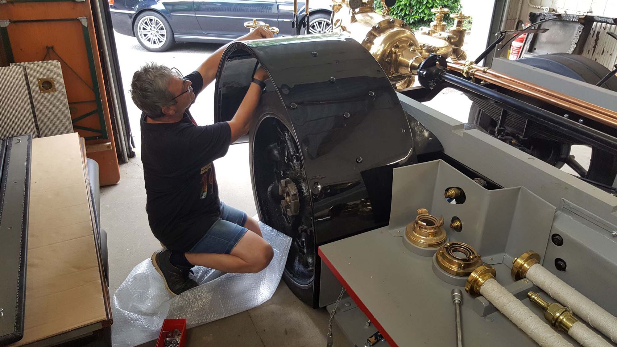 Es wurde nun auch mit der Montage der lackierten Kotflügel begonnen. Hier haben wir mit den beiden hinteren Kotflügeln begonnen. Aktuell sind wir als nächstes an den vorderen beiden Kotflügeln. Im Anschluss daran erfolgt dann der untere Teil der Gerätekästen.
