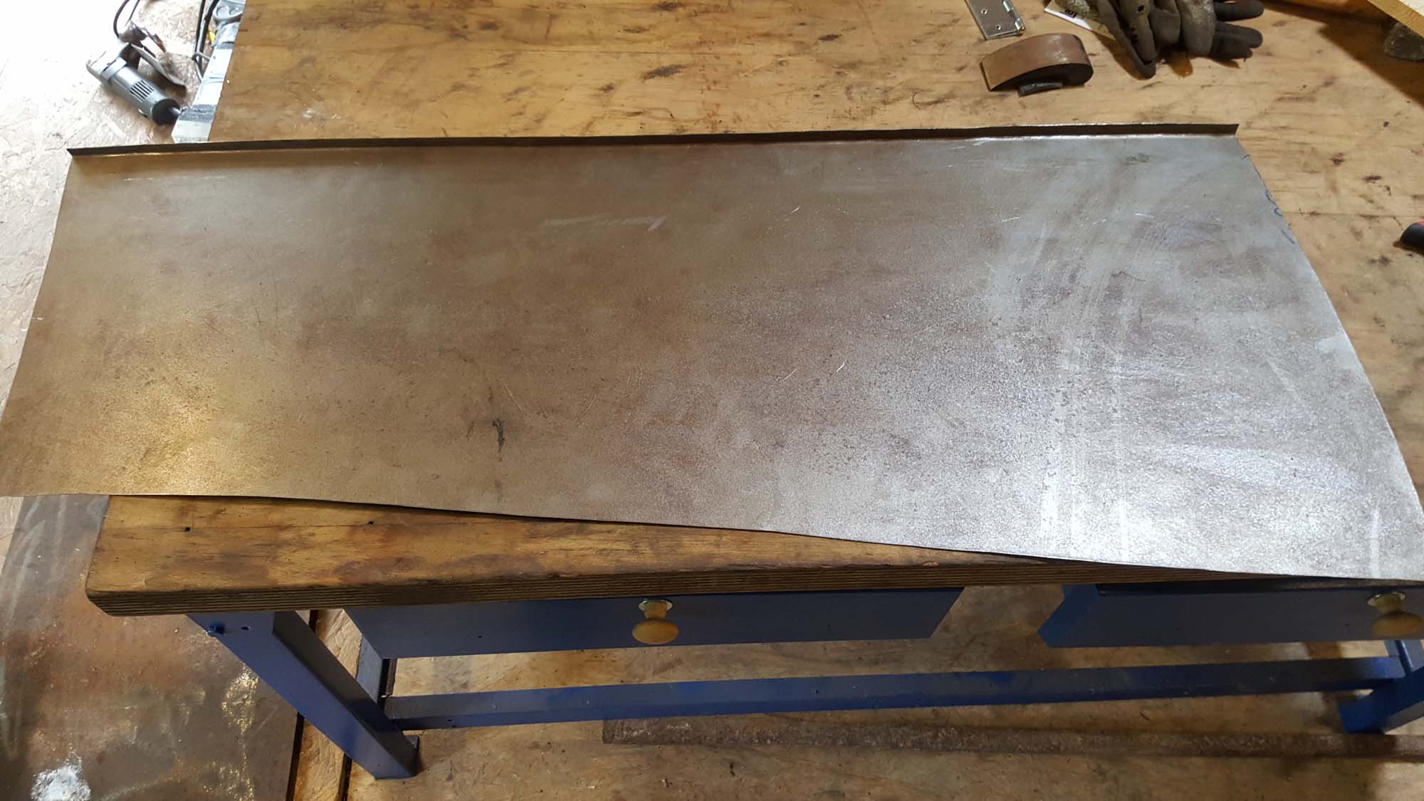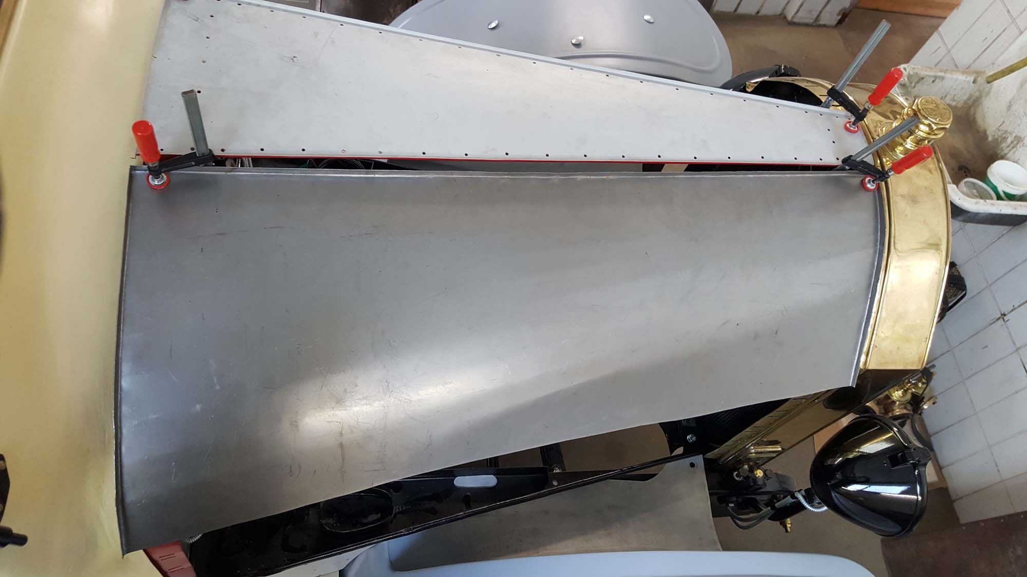 Nachdem der Aufbau nun nahezu fertig ist, sind wir nun daran die Motorhaube herzustellen. Da die alten Bleche ausgeglüht und zum Teil stark verformt sind, können diese nicht mehr verwendet werden. Die Haube wird nun mit 1mm Karosserieblech neu gefertigt. Hierbei unterstützt uns Karosseriebauer Andreas Göhring tatkräftig.