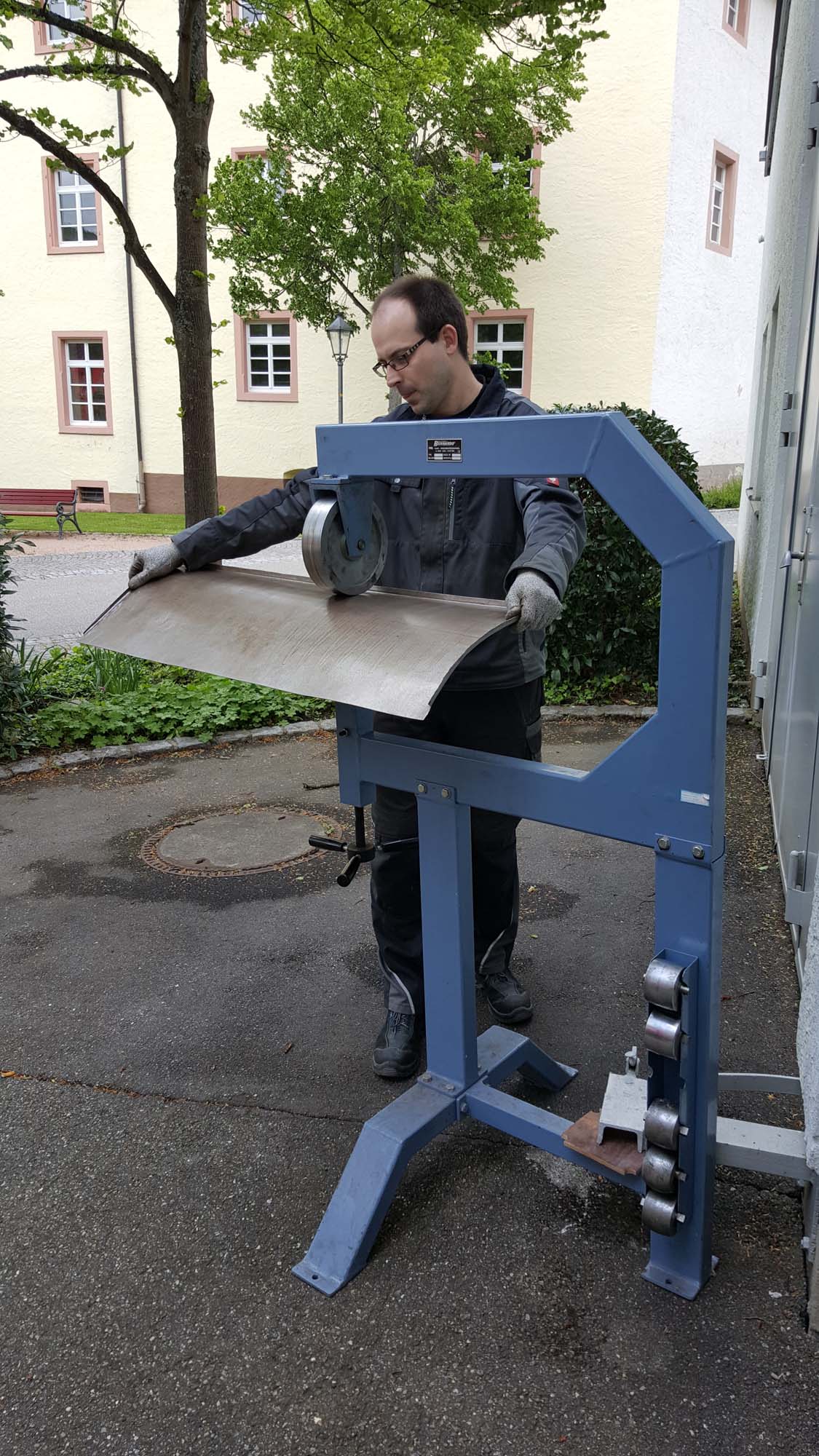 Im ersten Schritt werden die Rohbleche zugeschnitten. Hierbei können wir uns an den alten Haubenteilen orientieren. Die Rundung wird dann schon einmal grob in Form gebracht, bevor die Kanten zur Stabilität umgebördelt werden. Mit der Rollenstreckmaschine wird dann die Rundung der Haube weiter in Form gebracht. Immer wieder muss das Haubenteil dann direkt am Fahrzeug angepasst werden.