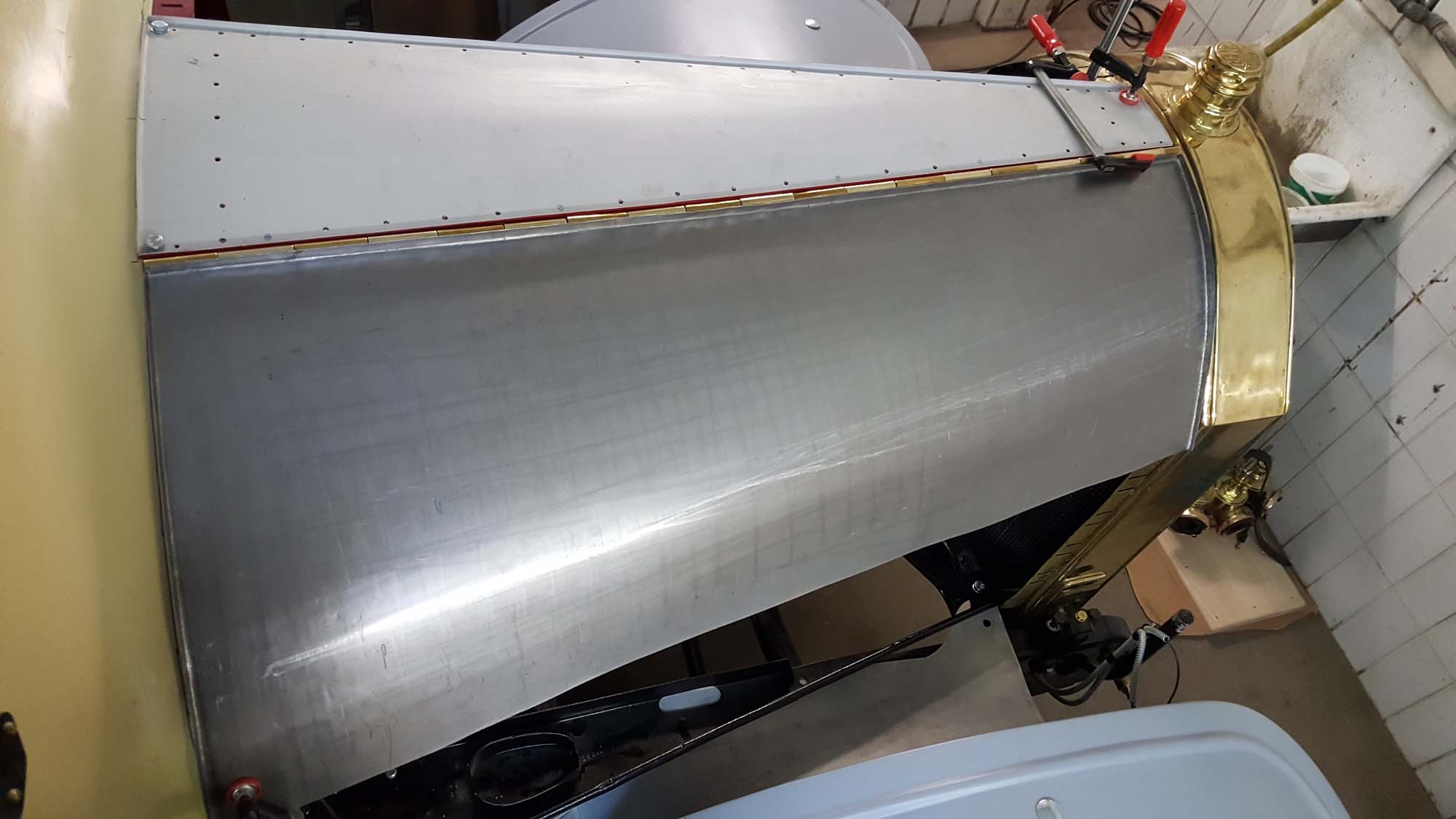 Insgesamt besteht die Motohaube aus 5 Einzelteilen, die mittels Scharniere zu einer aufklappbaren Motorhaube verbunden sind. Die Scharnierbänder aus Messing haben wir von der alten Haube entfernt, gereinigt und gerichtet. Sie werden bei der neuen Motorhaube wiederverwendet.