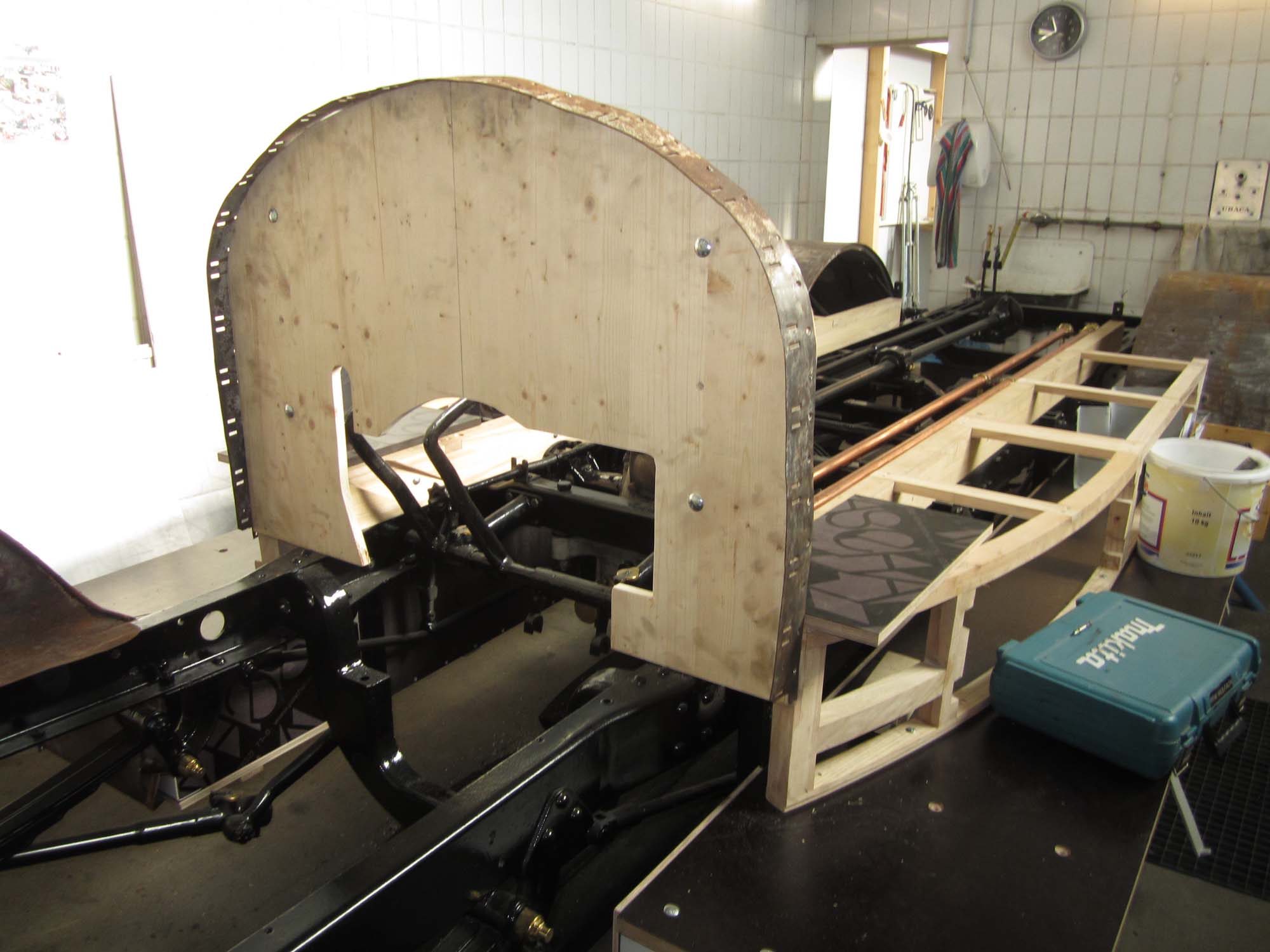 Im ersten Schritt werden hier das Spritzbrett (Armaturenbrett) sowie die Motorhaube fertig gestellt. Da das Armaturenbrett komplett verbrannt ist, haben wir an einem baugleichen Fahrzeug der Feuerwehr Überlingen diese Maße abgenommen und für uns ein Muster angefertigt. Hier ist auch schon das Metallband befestigt, auf dem später die Motorhaube aufliegen soll. Auch vom Kühler wurde ein Muster hergestellt um Anpassungen der Motorhaube nicht am frisch restaurierten Kühler durchführen zu müssen. Mit diesen beiden Formen kann nun die alte Motorhaube wieder in die richtige Form gebracht werden. Da das Blech recht stark ausgeführt ist und nur leichte Verformungen aufweist, wird hier die alte Motorhaube wieder verwendet. Es ist zudem einfacher diese Teile zu richten als eine neue Haube herzustellen. Wir sind außerdem bestrebt möglichst viele Originalteile wieder zu verwenden.
