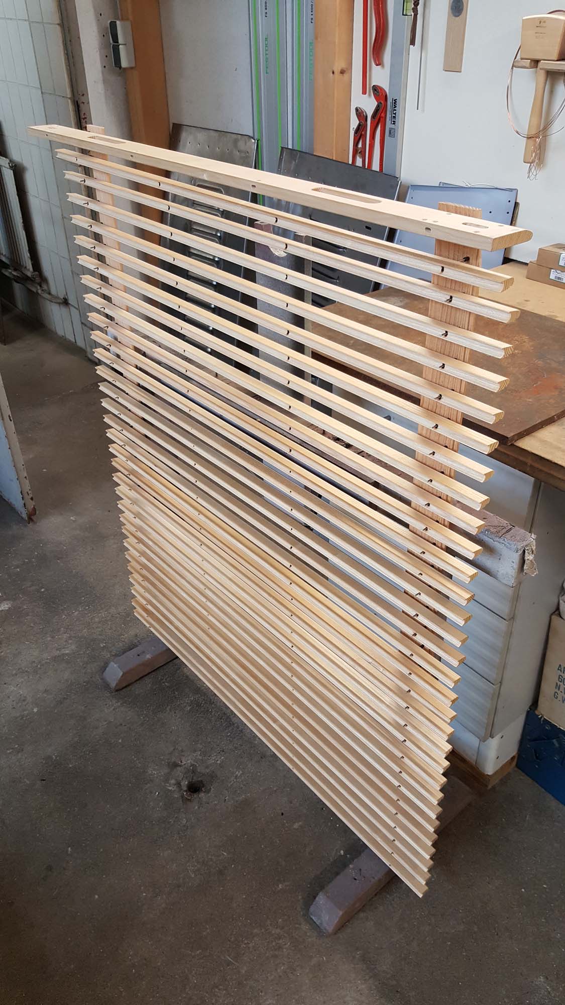 Parallel dazu wurde mit der Fertigstellung des ersten Rollladens begonnen. Hierzu werden die Rollladenlamellen einzeln mit Holzbeize behandelt. Im Anschluss daran erfolgt noch eine Lackierung mit einem klaren Schutzlack um den Rollladen gegen äußere Einflüsse zu schützen.