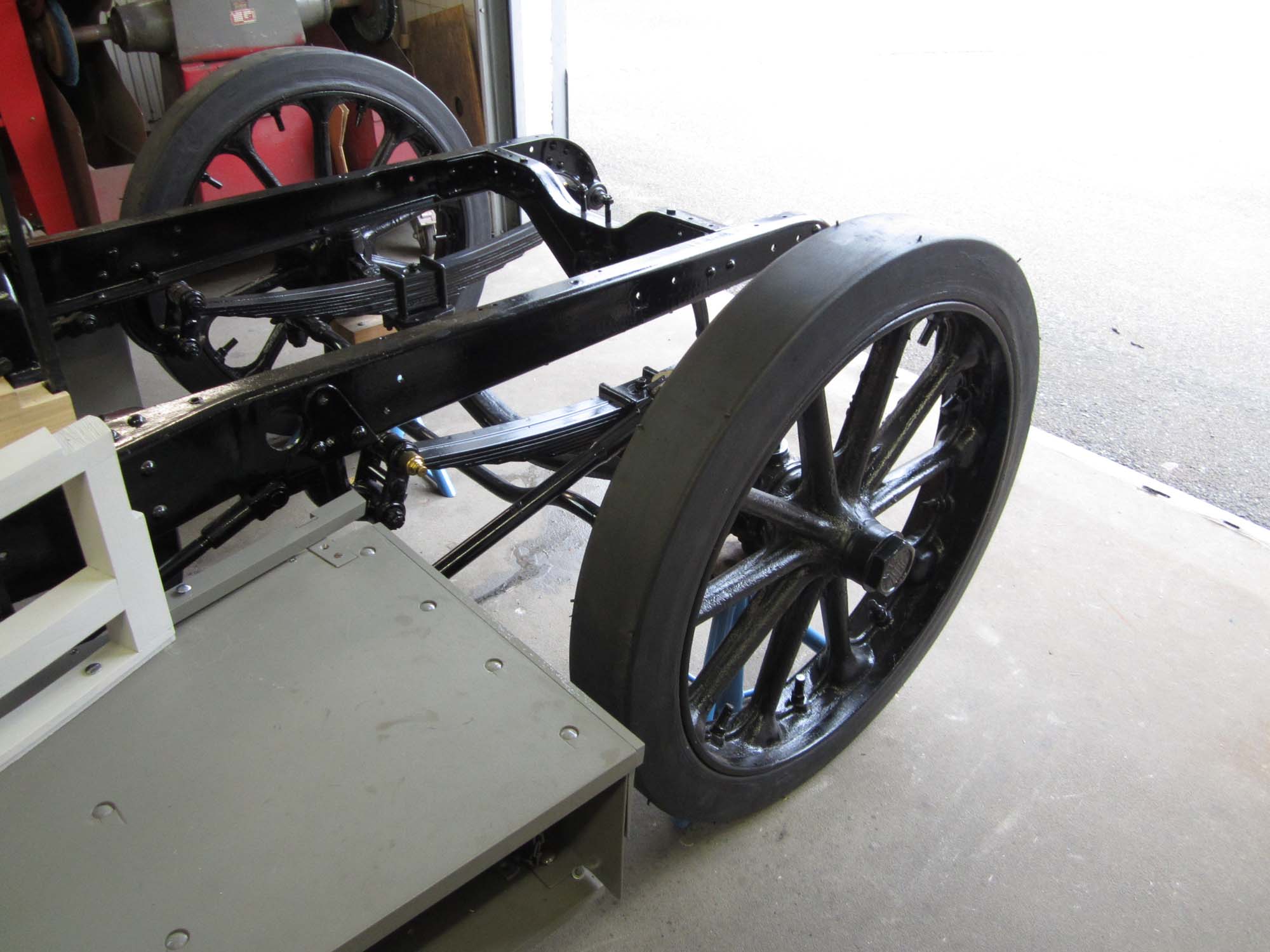 Alles wurde noch einmal gereinigt und die beweglichen Teile haben wir geschmiert. Mit einem Hubwagen haben wir dann die Räder auf die Achsen geschoben und mit gezielten Hammerschlägen in die Endposition gebracht. Nach 22 Monaten stand der Benz dann zum ersten Mal wieder auf den eigenen Rädern. Während der restlichen Arbeiten wird er aber trotzdem noch auf den Unterstellböcken sitzen, um die Vollgummireifen zu schonen.