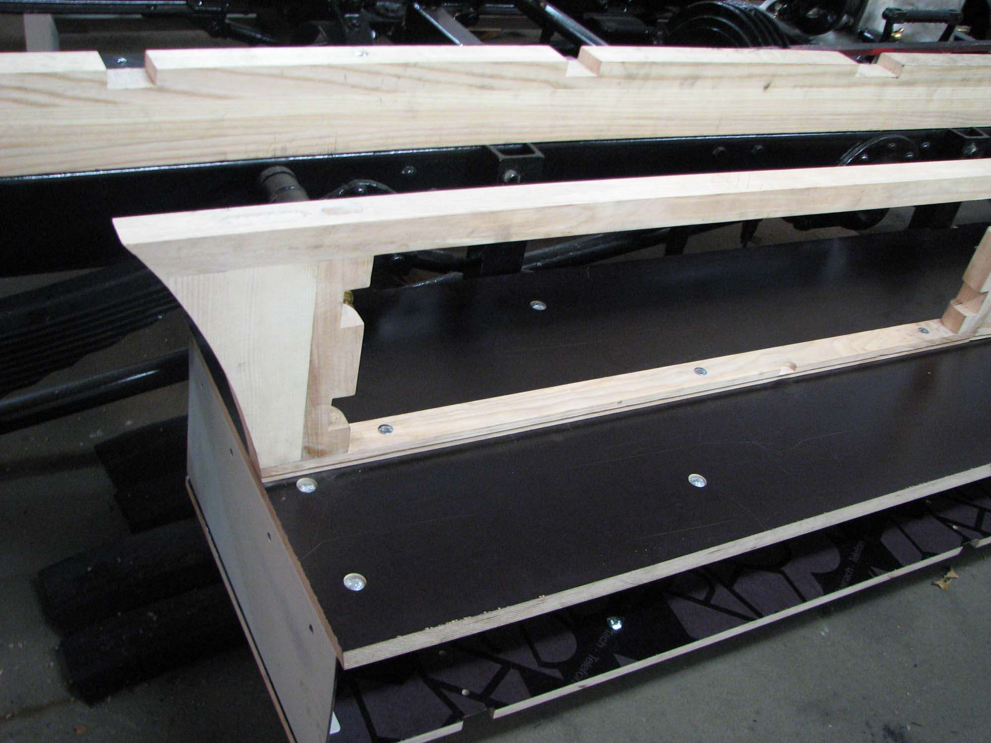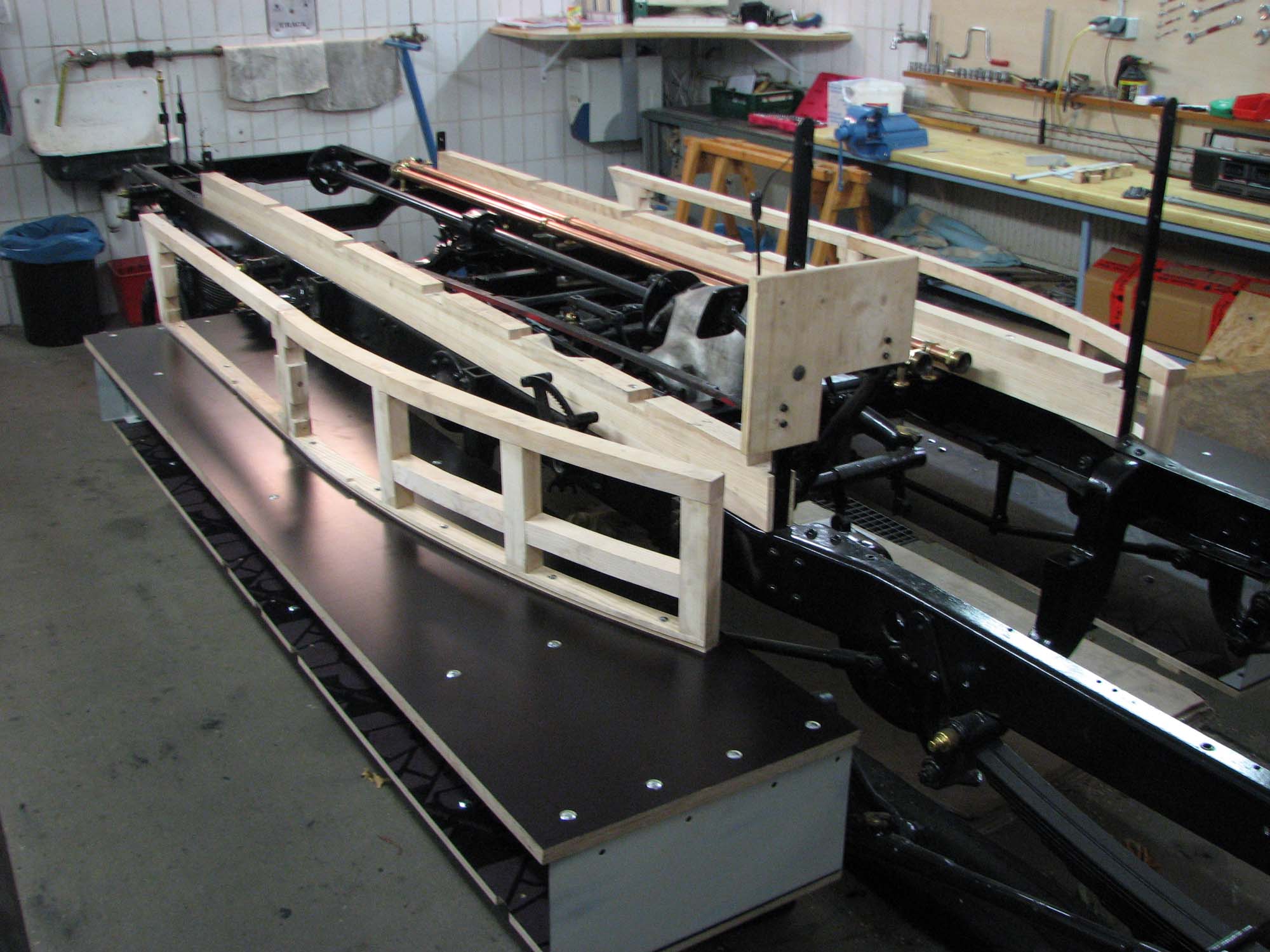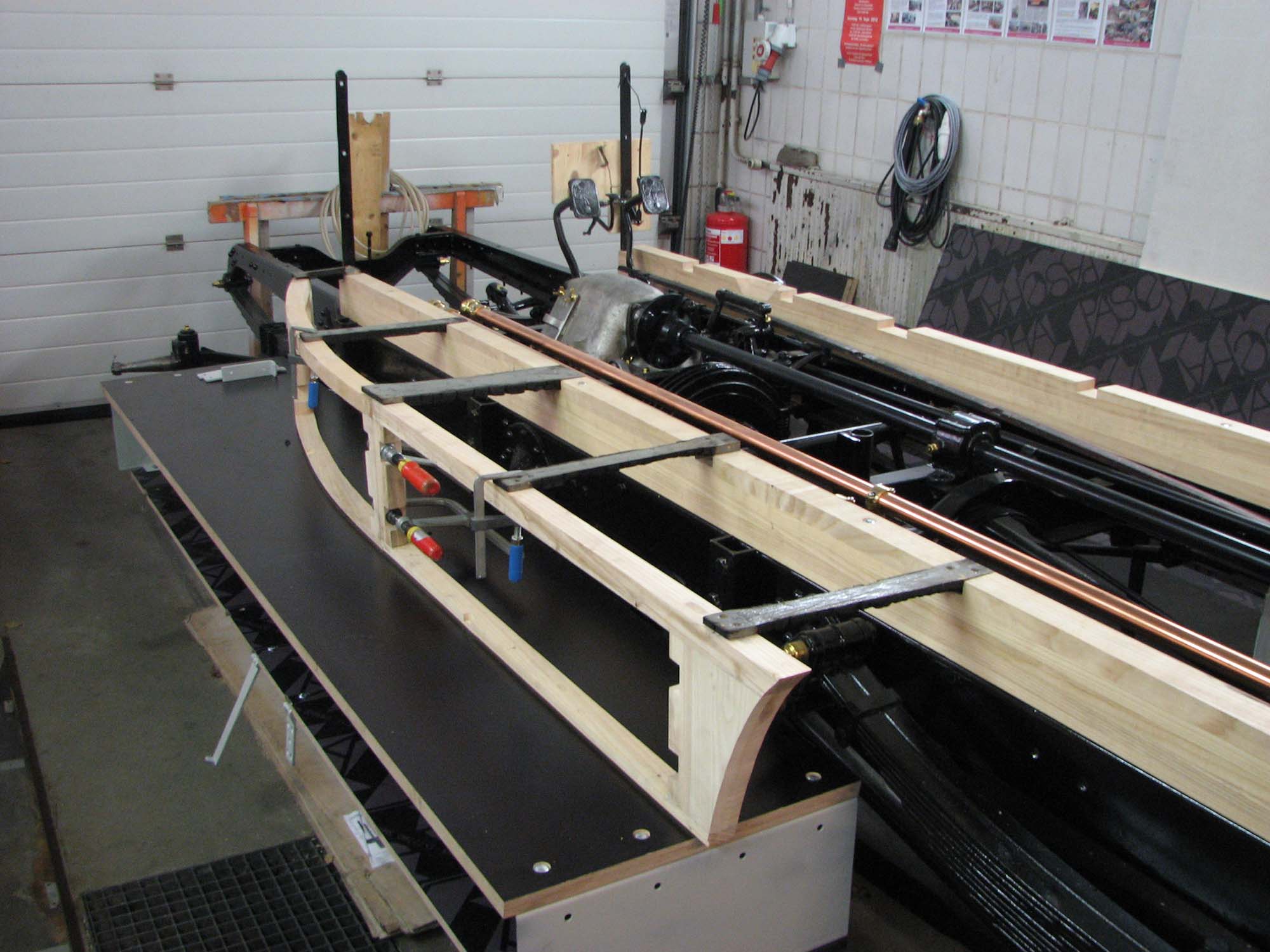 Später wird hier dann der obere Teil des Aufbaus für die Mannschaft aufgesetzt. Die Holzkonstruktion im unteren Bereich ist glücklicherweise soweit erhalten, das die wichtigsten Maße noch abgenommen werden können. Es müssen aber trotzdem alle Teile nachgebaut werden. Begonnen wurde mit dem Übertragen der Grundmaße auf die neuen Platten. Erschwerend kam hinzu, dass diese auf beiden Fahrzeugseiten unterschiedliche Ausmaße haben und auch die Ränder teilweise abgebrannt sind, was das exakte Messen nicht gerade vereinfacht. Aussparungen für Halterung und Scharniere folgten im zweiten Schritt. Die genaue Positionierung der Kästen musste besonders sorgfältig durchgeführt werden, da diese später genau mit den Kotflügeln abschließen sollen. Die mittleren Teile des Aufbaus bauten wir nach Original Vorbild nach. Die gebogene Form und die Verzapfungen der Teile waren hier eine besondere Herausforderung. Um späteres „Arbeiten“ des Holzes so gut wie möglich auszuschließen, kam hierfür über lange Jahre getrocknetes Eschenholz zum Einsatz. In montiertem Zustand können nun auch die Klappen und Türen gebaut und angepasst werden.