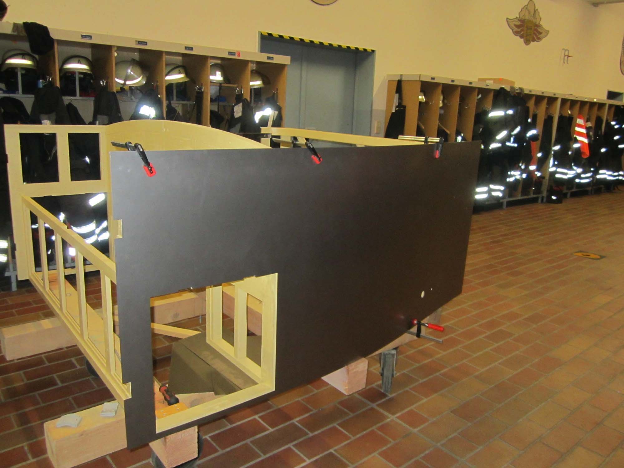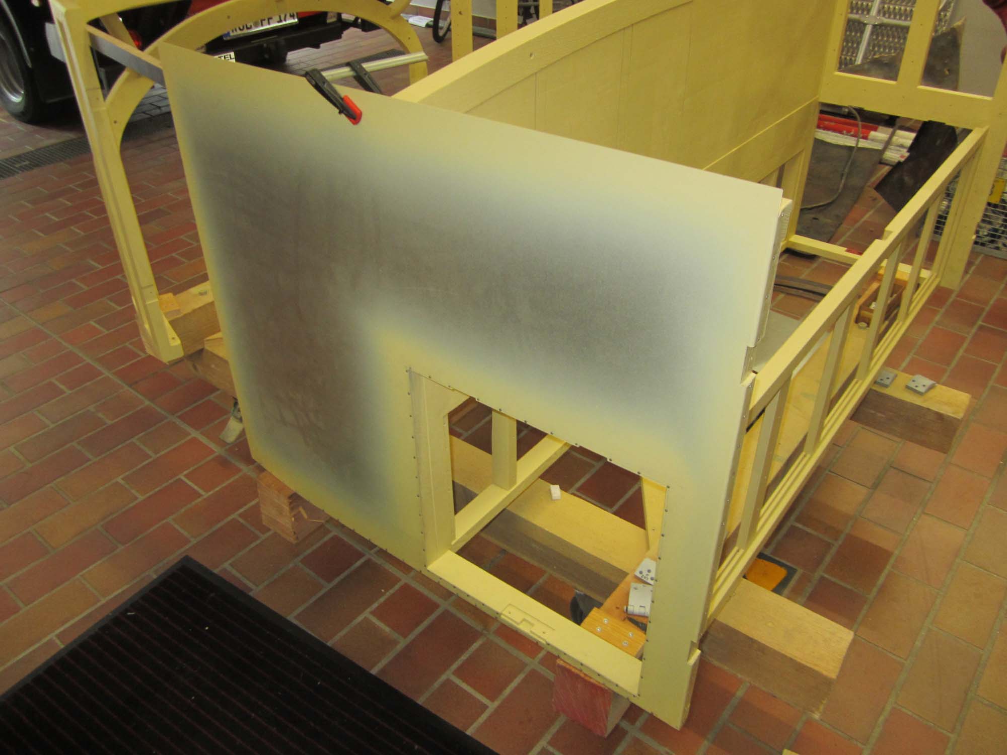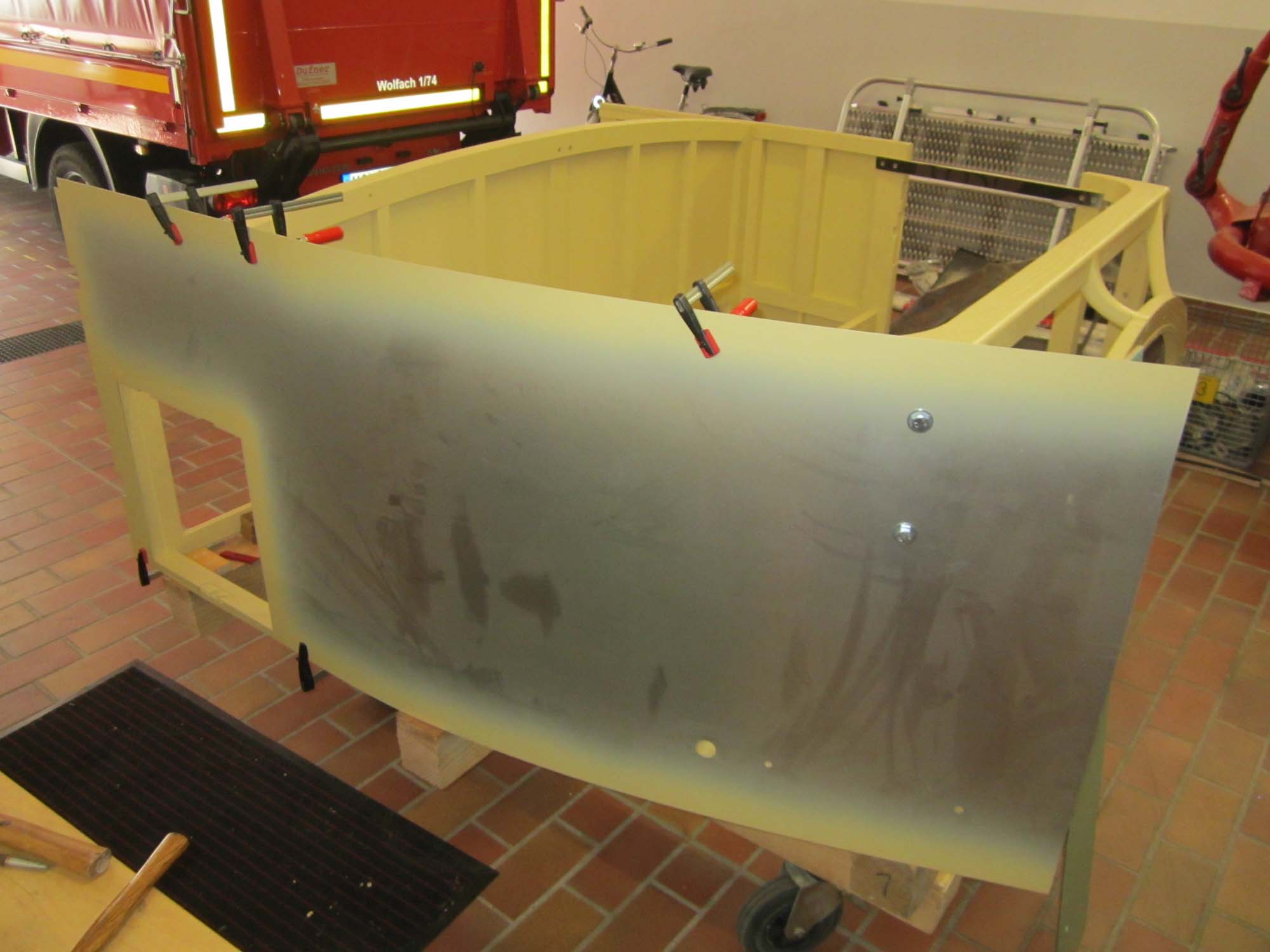 Nachdem die Türen und Klappen bereits mit Blech versehen sind, sind nun auch die Blecharbeiten am eigentlichen Aufbau in vollem Gange.
