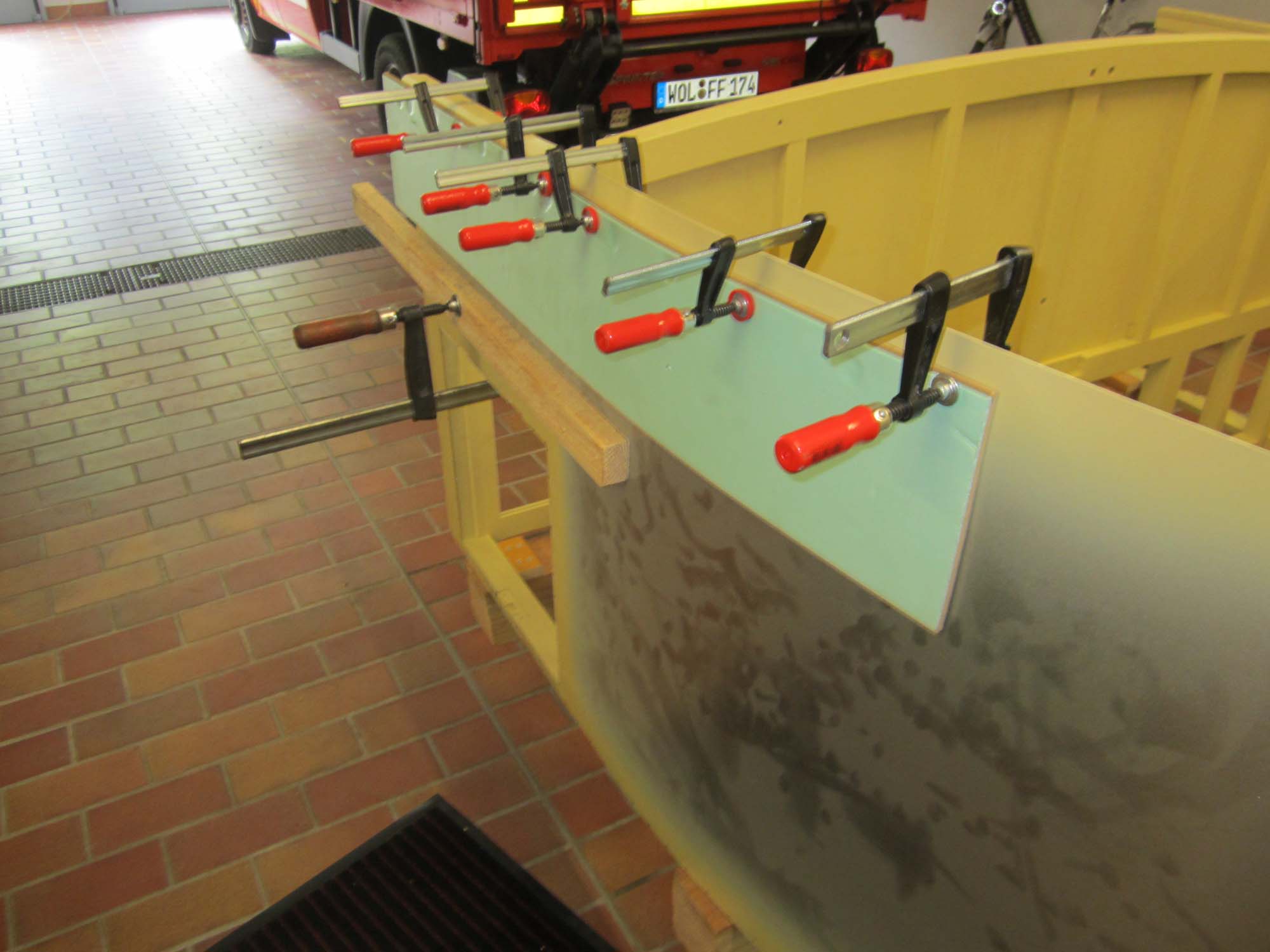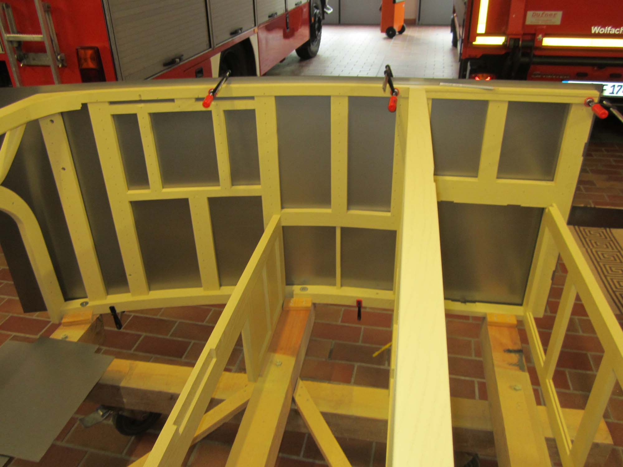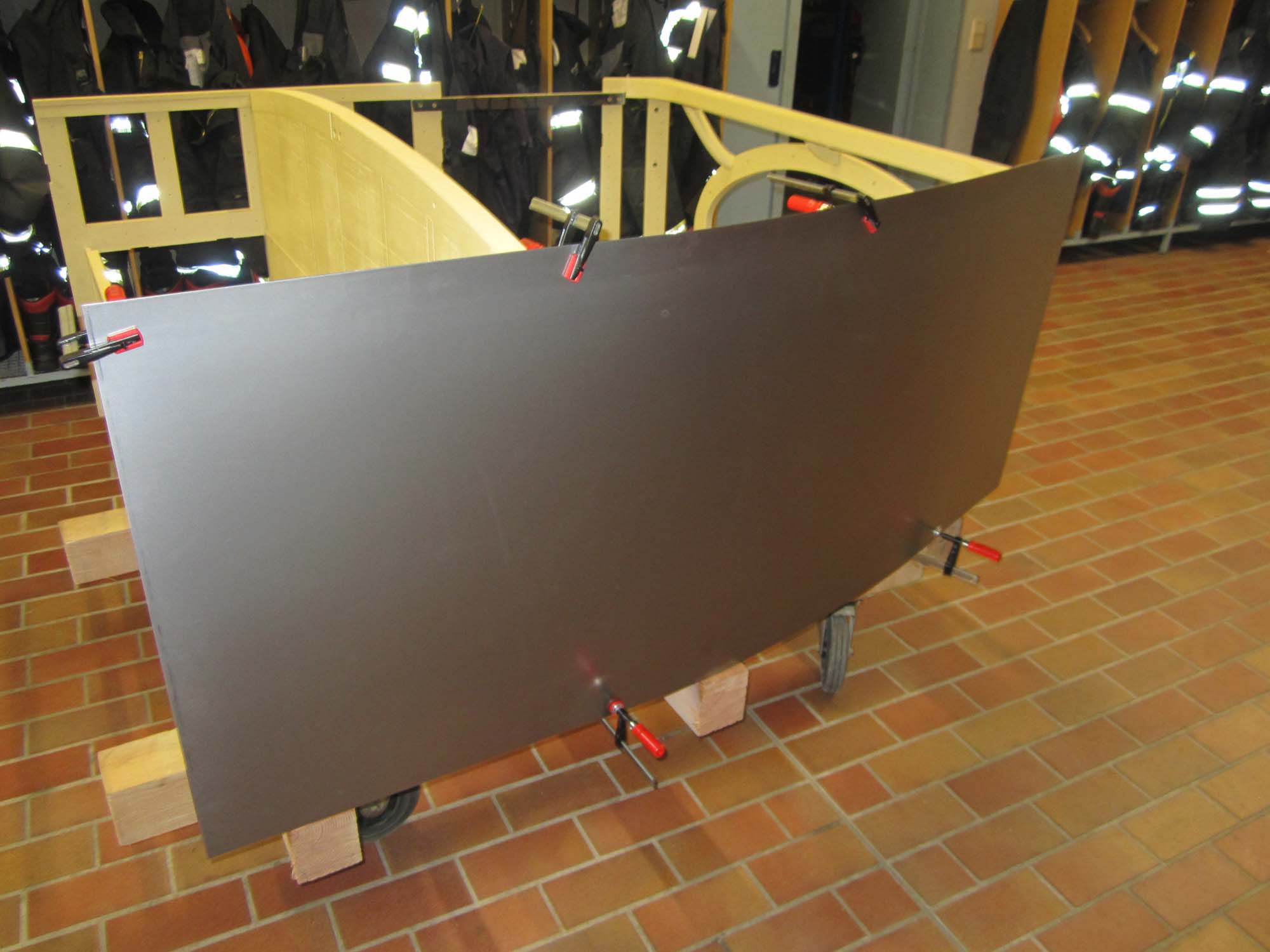 Nachdem die Türen und Klappen bereits mit Blech versehen sind, sind nun auch die Blecharbeiten am eigentlichen Aufbau in vollem Gange.
