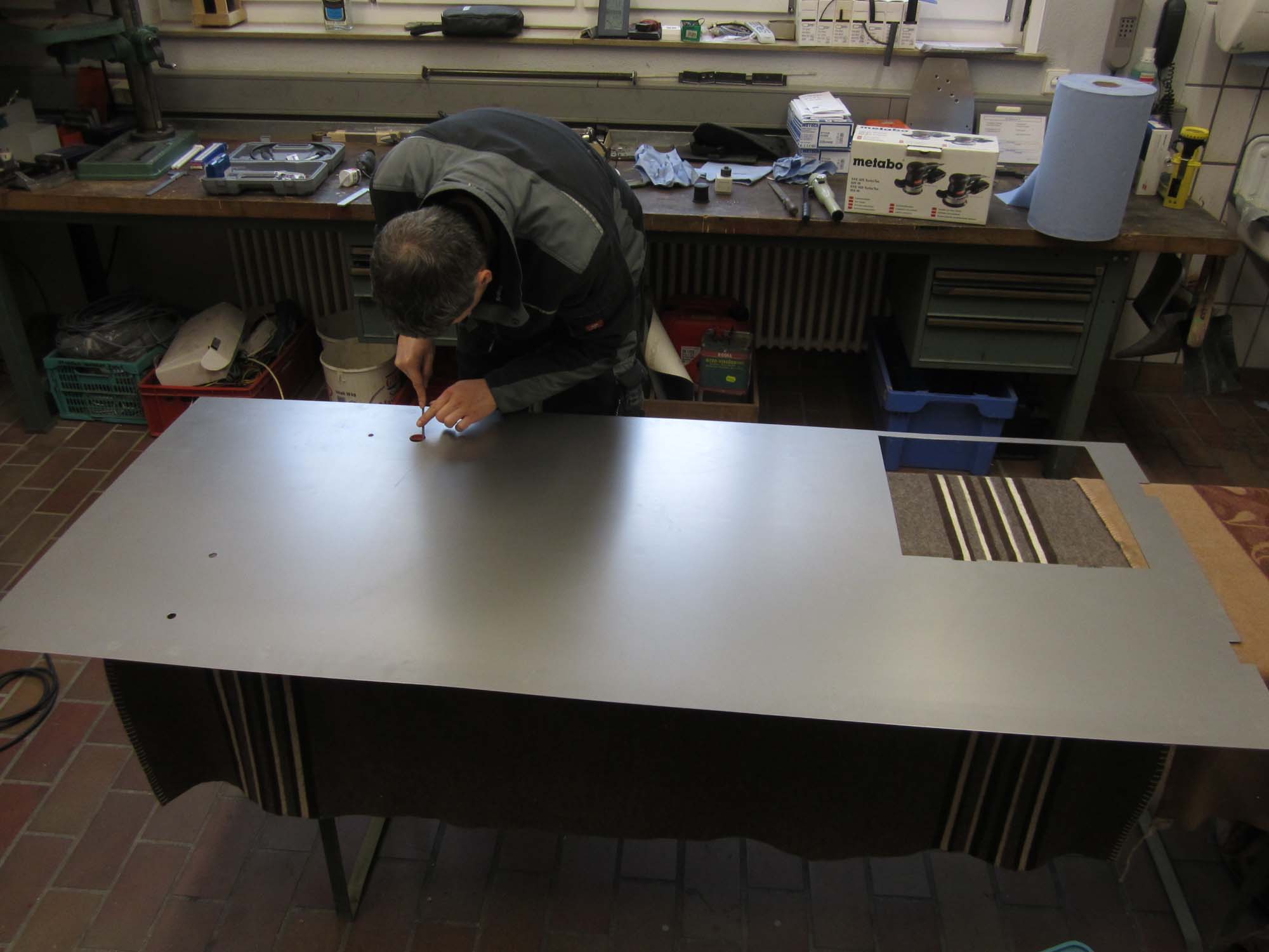 Die Bleche wurden vorher auf die entsprechenden Maße zugeschnitten und danach haben wir dann die Aussparungen für die Türen und Klappen herausgetrennt. Nach der ersten Grundierung auf der späteren Blechinnenseite, folgte das Aufnageln der vorbereiteten Blechtafeln. Mit einem Vorstecher wurden hierzu in vorher angezeichnetem Abstand die Löcher ins Blech gestochen. Dann erfolgt das Festnageln des Bleches mit kleinen Spezialnägeln. Wie an den Türen auch, ist das Blech an der Oberseite über den Radius gekantet und dann von der Oberseite genagelt. Nach dem alle Seitenteile nun aufgenagelt sind, fehlt noch die vordere Anpassung an die Motorhaube.