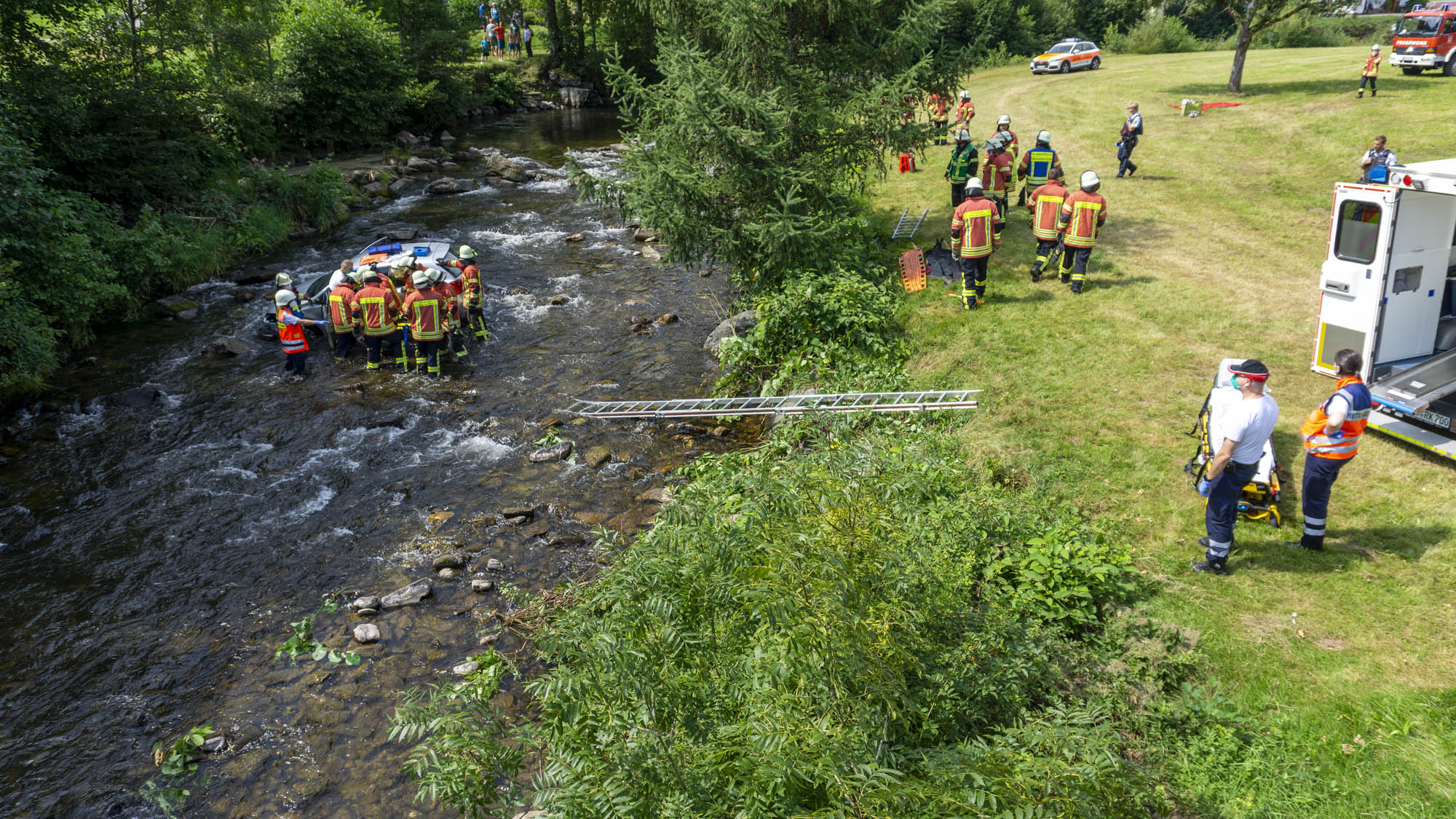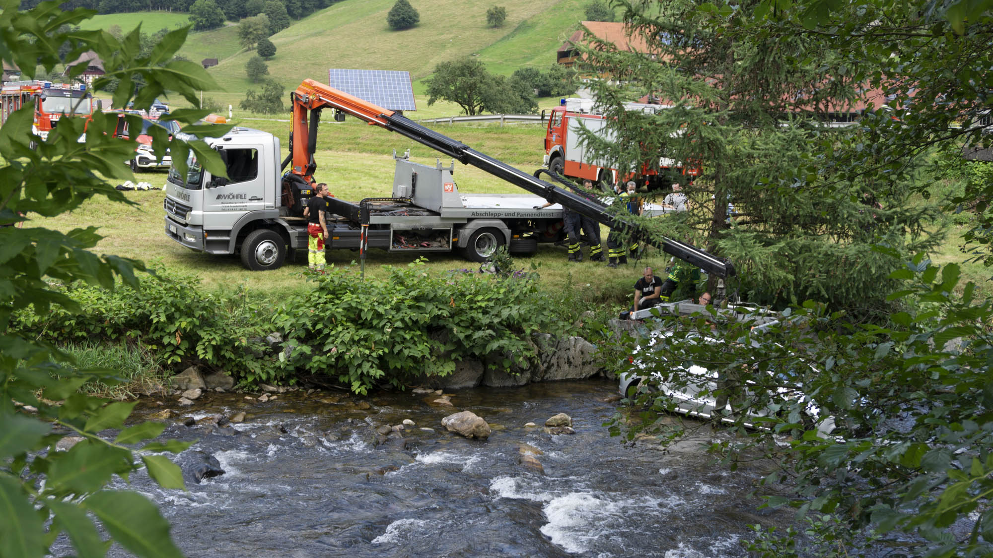Im Mitteltal in Oberwolfach kam ein Kleinwagen von der Landstraße ab, sodass er über eine Wiese fuhr und erst im Bachbett der "Wolf" zum Stehen kam. Die Fahrerin des Wagens befand sich zum Zeitpunkt der Alarmierung noch im Fahrzeug, sodass neben der Feuerwehr Oberwolfach auch Unterstützung aus Wolfach zur Einsatzstelle entsandt wurde. An der Einsatzstelle konnten wir bei der Rettung der Verunfallten unterstützen und das Fahrzeug mit der Seilwinde des Rüstwagens sichern.