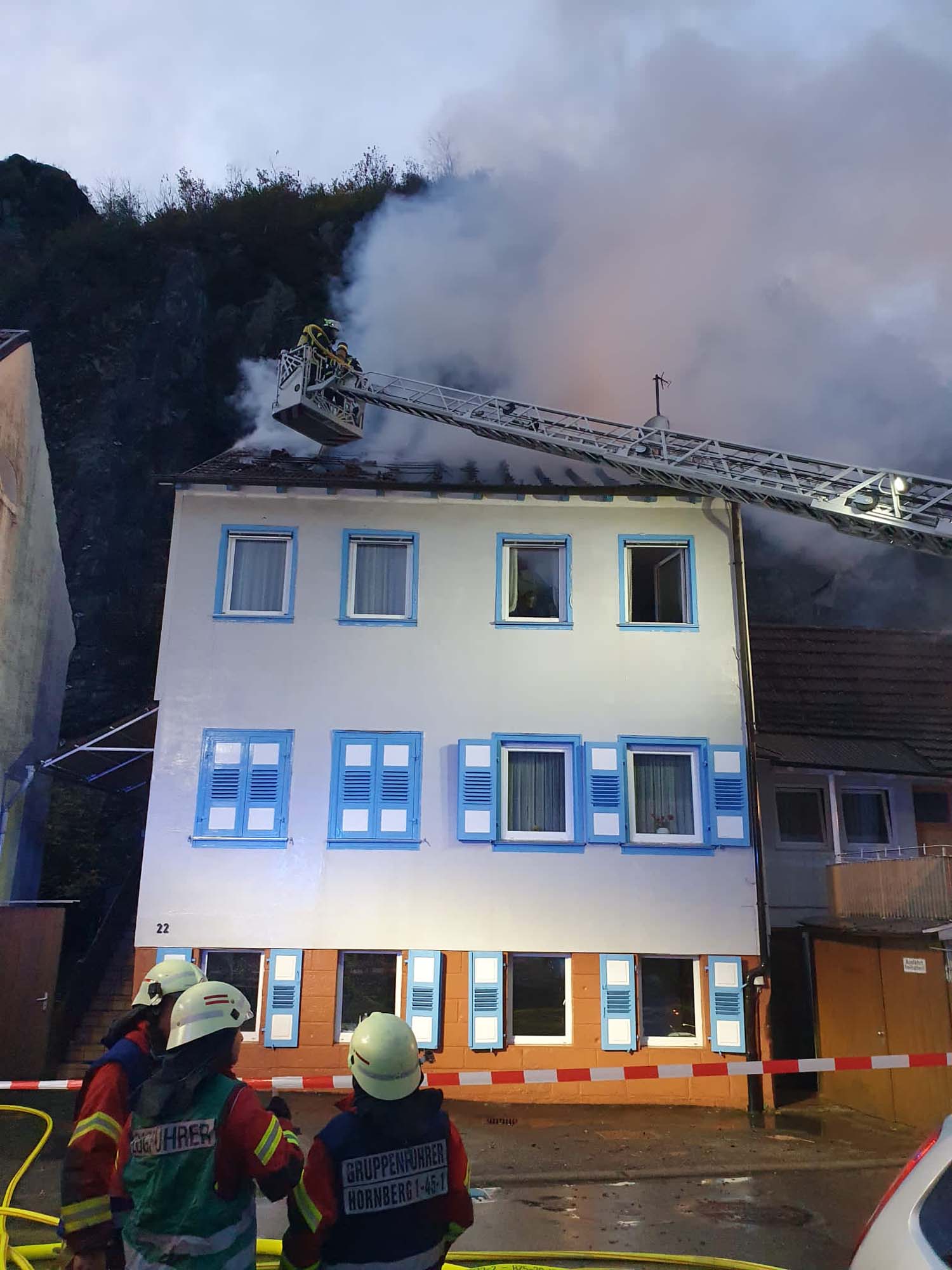 Bei einem Dachstuhlbrand in der Hornberger Altstadt wurde die Führungsgruppe Kinzigtal zur Unterstützung des Einsatzleiters der Feuerwehr Hornberg hinzugezogen. Die Mitglieder der Führungsgruppe, darunter auch zwei Einsatzkräfte aus Wolfach, unterstützten vor Ort die Einsatzleitung, welche für die Dokumentation und die Kommunikation zwischen den zahlreichen Einsatzkräften zuständig war.