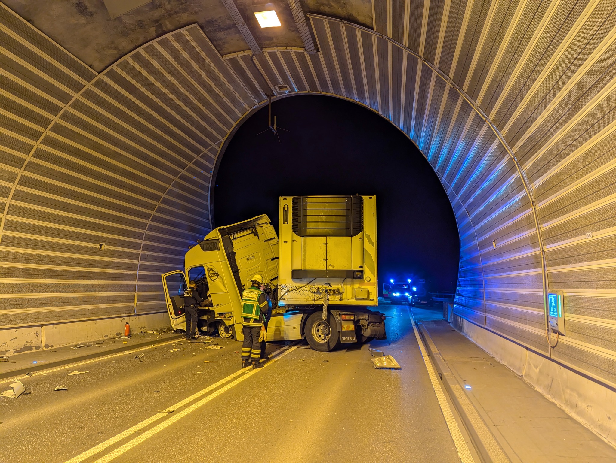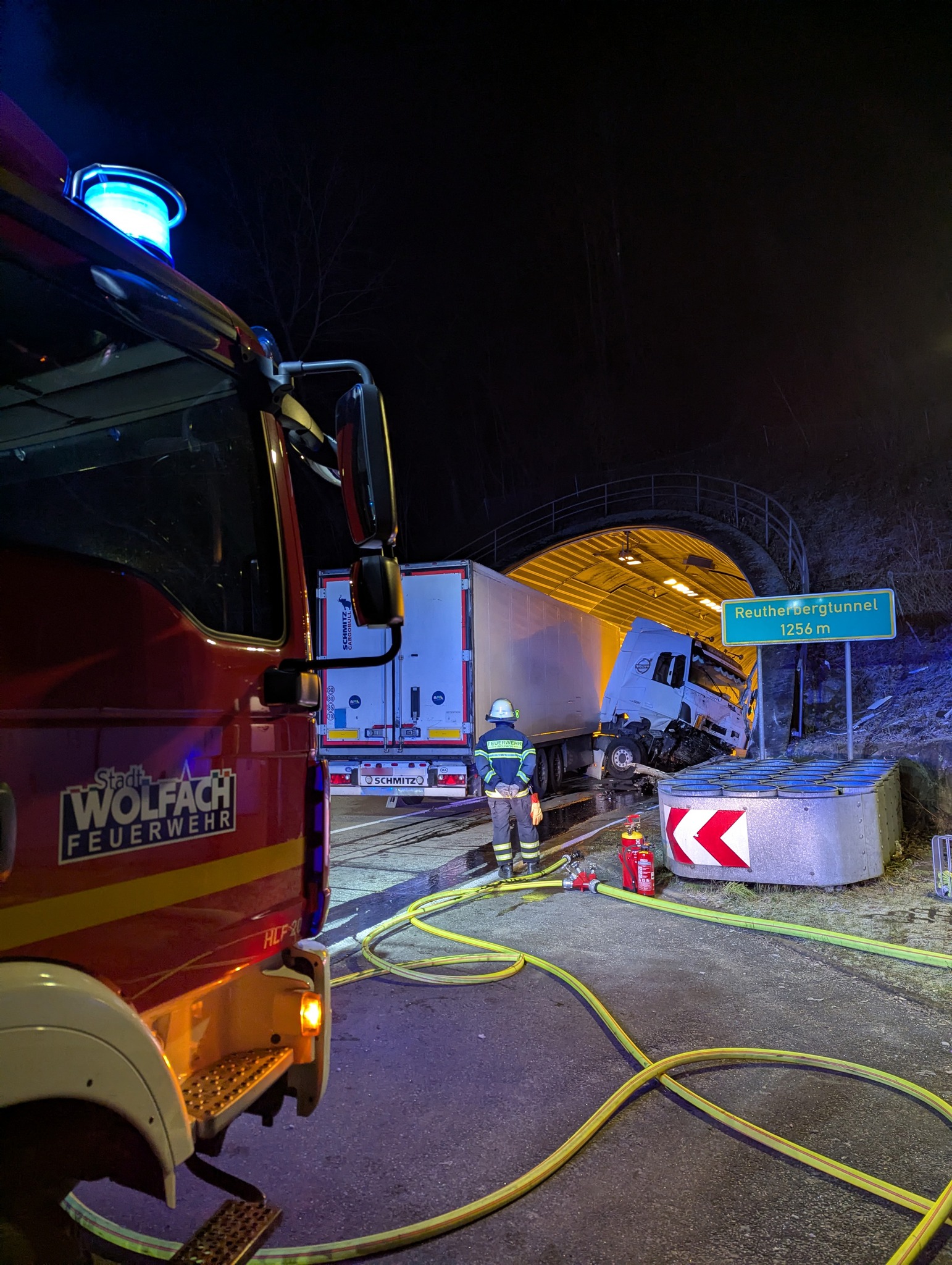 | In der Nacht kollidierte ein unbeladener Sattelzug mit dem Westportal des Reutherbergtunnels. Der Fahrer des LKWs konnte diesen jedoch selbstständig verlassen und wurde durch den Rettungsdienst versorgt. Durch die Feuerwehr wurde der Brandschutz sichergestellt und mit Bindemittel konnten auslaufende Betriebsstoffe aufgenommen werden. |