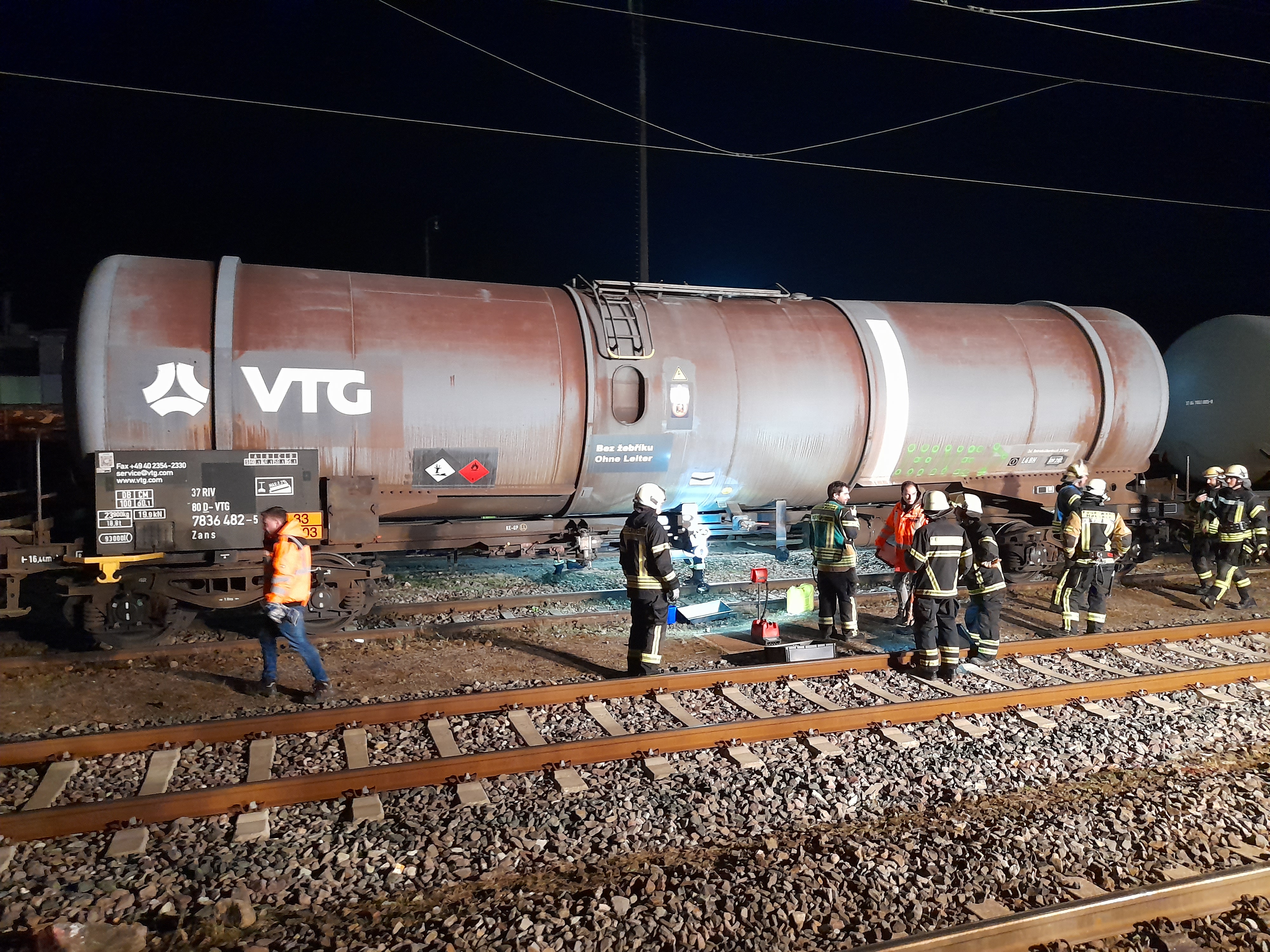 Nachdem im Bahnhof Hausach geringe Mengen Kraftstoff aus einem Kesselwagen ausliefen, wurde die ABC Einheit Kinzigtal alarmiert. Das betroffene Ventil wurde gereinigt und konnte danach dicht verschlossen werden. Bild: @Feuerwehr Haslach |