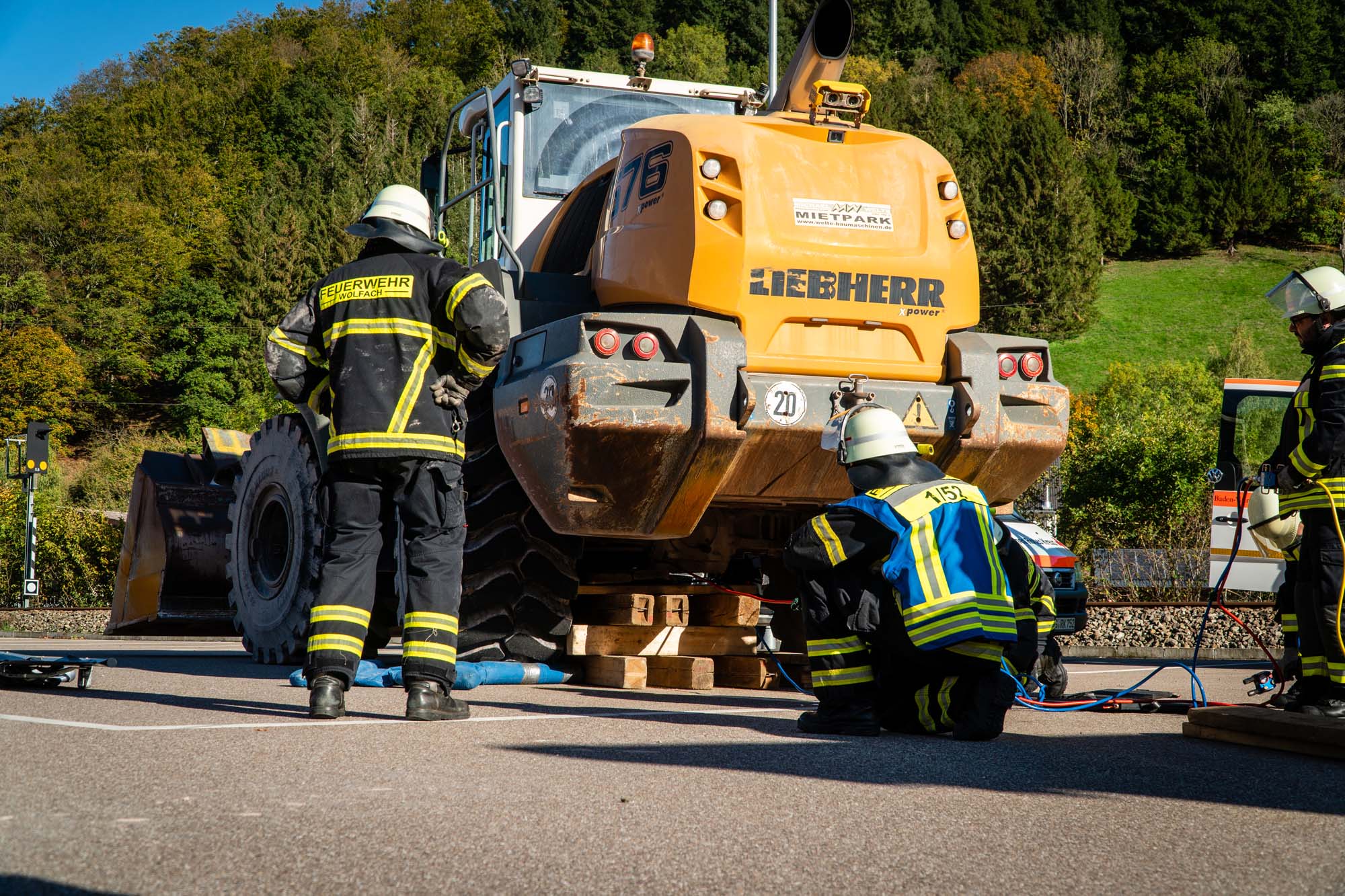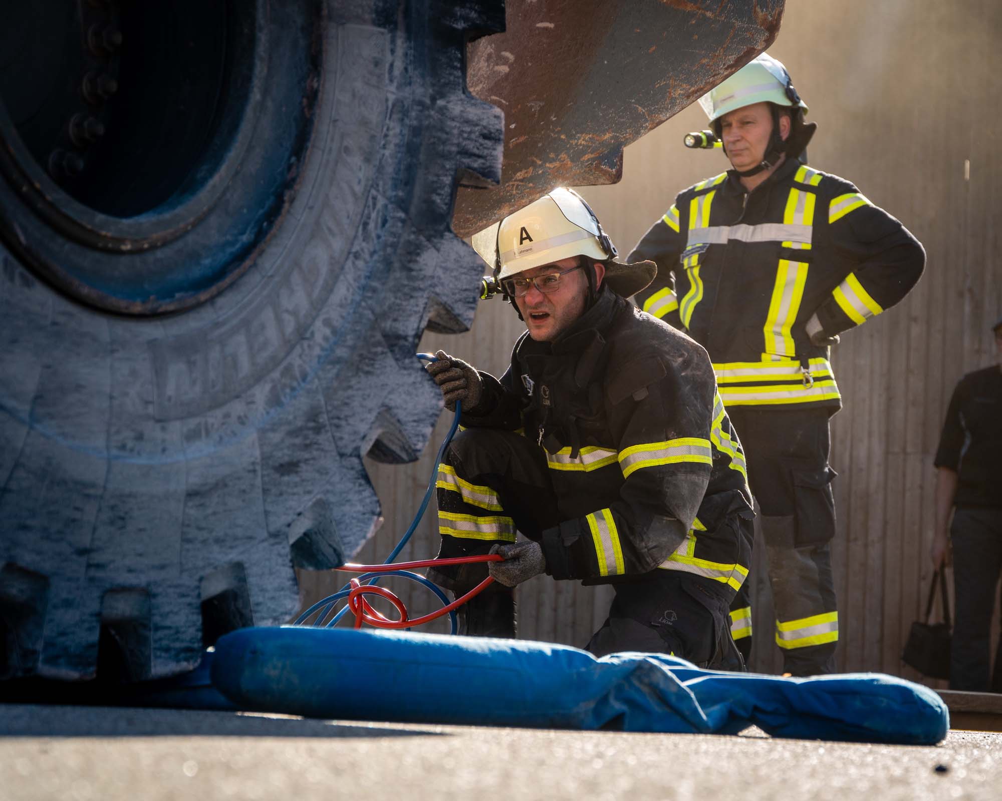 Währenddessen war der Blick der anwesenden Zuschauer aber auch häufig auf den großen Radlader gerichtet. Denn dort galt es zeitgleich einen Patienten zu retten, der unter einem Rad des 25-Tonnen-Giganten eingeklemmt war. Sorgsam wurde die schwere Baumaschine mit Hebekissen und Druckluft angehoben, bis das Bein befreit war.