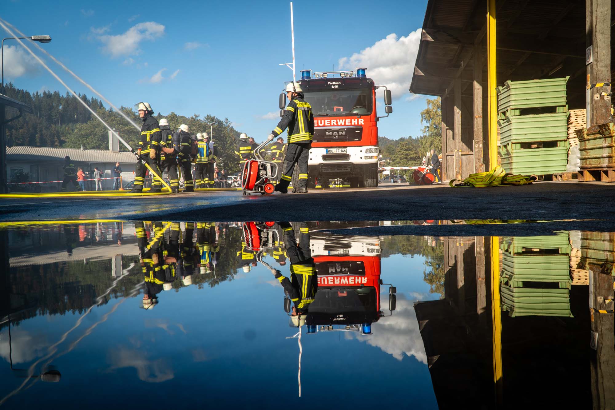 In einem Industriekomplex auf dem Gelände der Firma Sachtleben war ein fiktives Feuer ausgebrochen und der Hausmeister äußerte den zuerst eintreffenden Einsatzkräften den Verdacht, dass sich noch sieben seiner Kollegen im Gebäude befänden. Bereits nach kurzer Zeit konnten die vorrückenden Atemschutzgeräteträger die Vermissten retten und dem DRK OV Wolfach zur Betreuung übergeben.