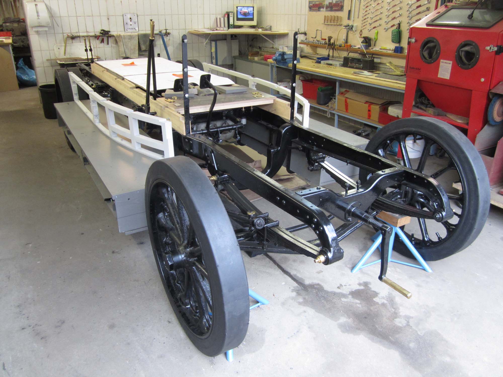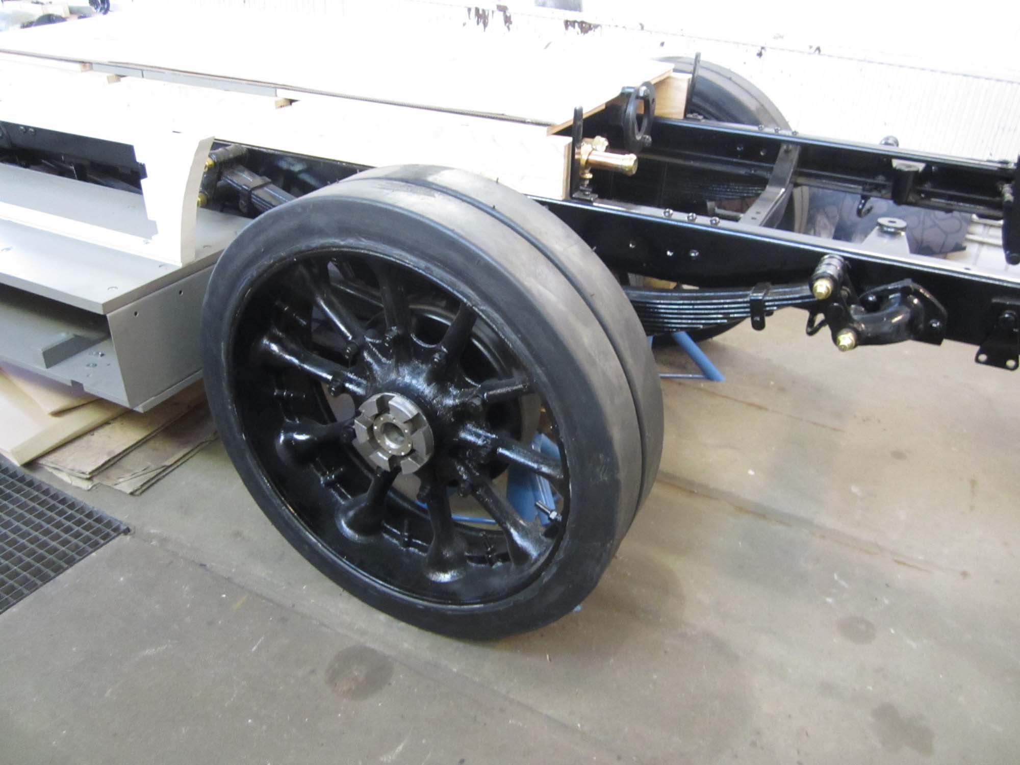 Alles wurde noch einmal gereinigt und die beweglichen Teile haben wir geschmiert. Mit einem Hubwagen haben wir dann die Räder auf die Achsen geschoben und mit gezielten Hammerschlägen in die Endposition gebracht. Nach 22 Monaten stand der Benz dann zum ersten Mal wieder auf den eigenen Rädern. Während der restlichen Arbeiten wird er aber trotzdem noch auf den Unterstellböcken sitzen, um die Vollgummireifen zu schonen.