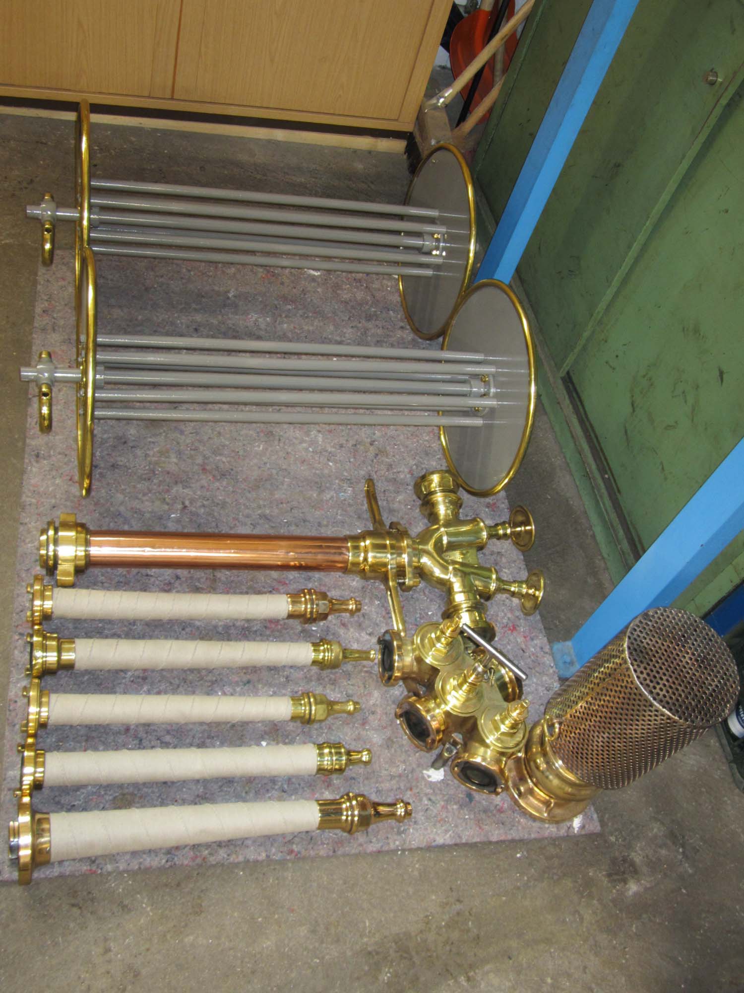 Auch die Beladung des Fahrzeuges ist schon fast wieder komplett. Alle Teile sind noch Originalteile und wurden gereinigt, aufpoliert und mit neuen Dichtungen versehen. Zum Teil mussten die Strahlrohre nachgelötet werden. Bei alle Strahlrohren wurde das Griffstück wieder mit Hanfschnur eingebunden.