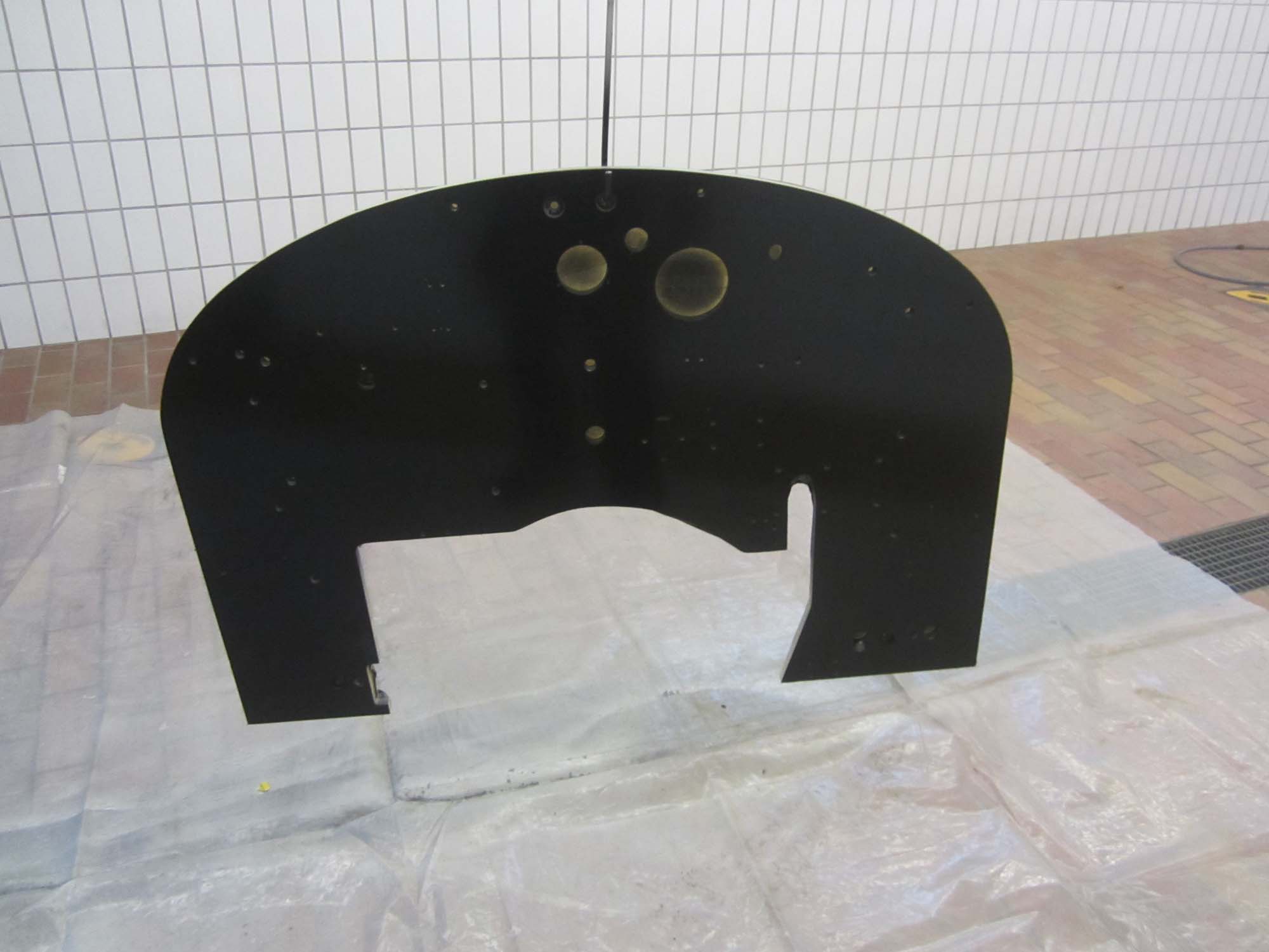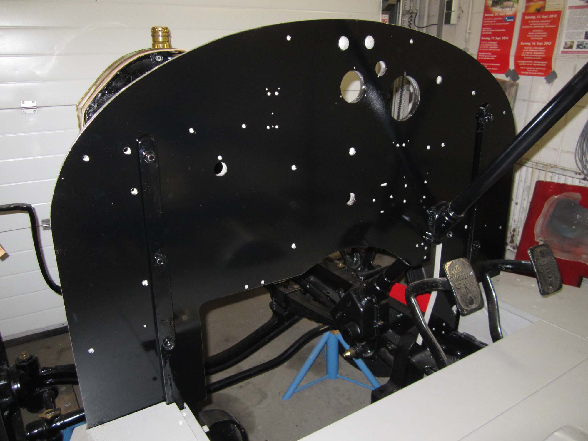 Nachdem nun alle Teile an das Armaturenbrett angepasst und alle Löcher gebohrt wurden, ist es nun soweit, dass das Armaturenbrett seine endgültige Farbgebung erhält. Die Motorseite ist nun in Grau lackiert und die Seite der Mannschaft hat eine schwarze Lackierung erhalten. Nach dem Einbau wird dann nach und nach mit der Installation der Elektrik begonnen. Im ersten Schritt sind schon alle Befestigungsschellen für die elektrischen Leitungen gesetzt worden.