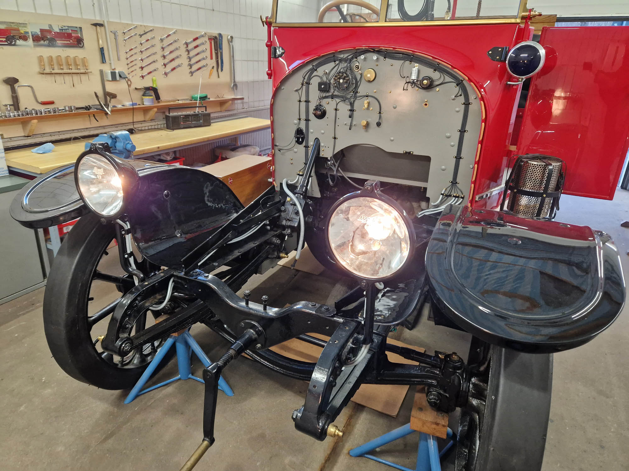 Außerdem wurden die Anschlussleitungen für die Scheinwerfer gerichtet und es erfolgte schonmal ein erster Lichttest.