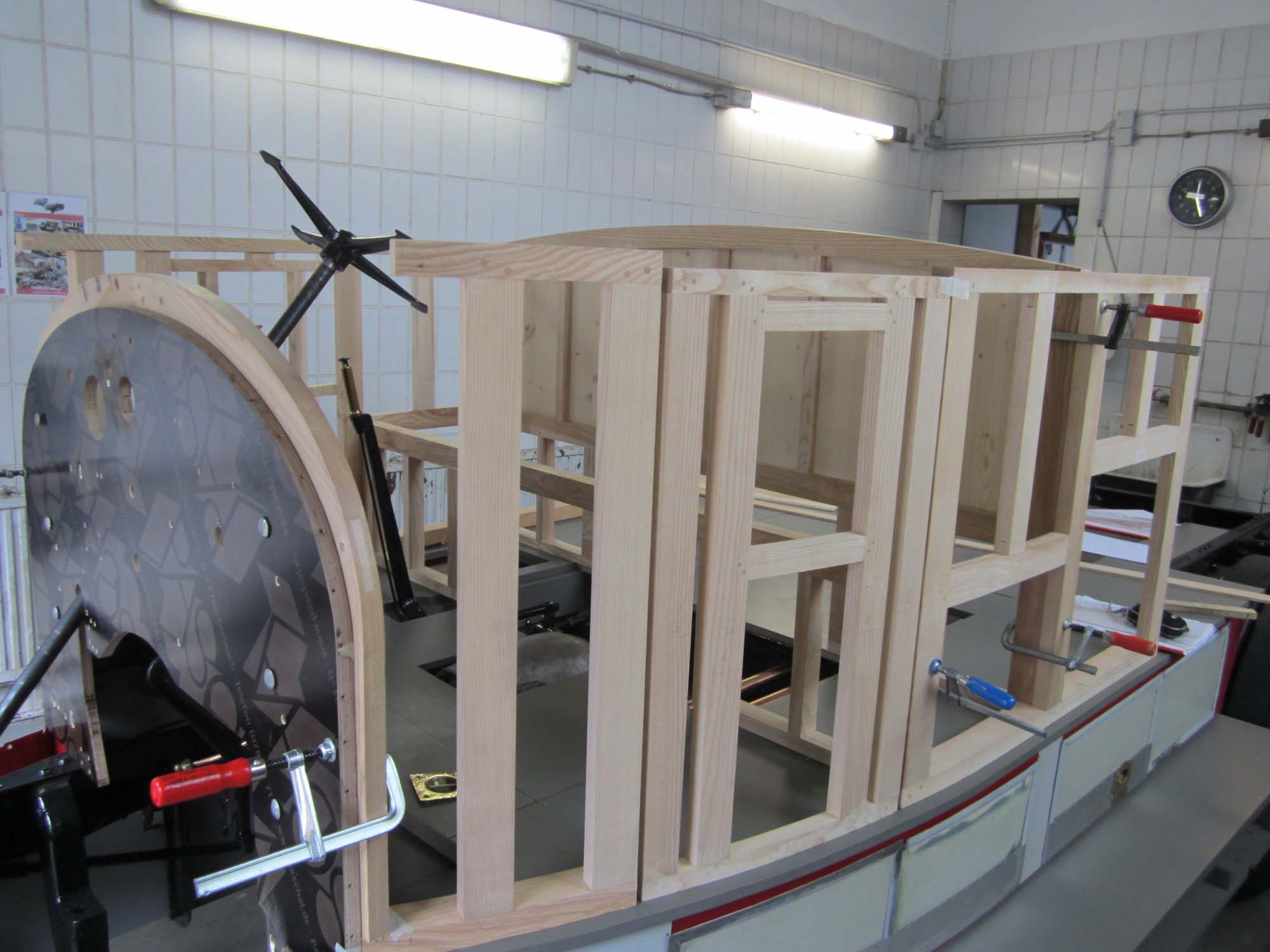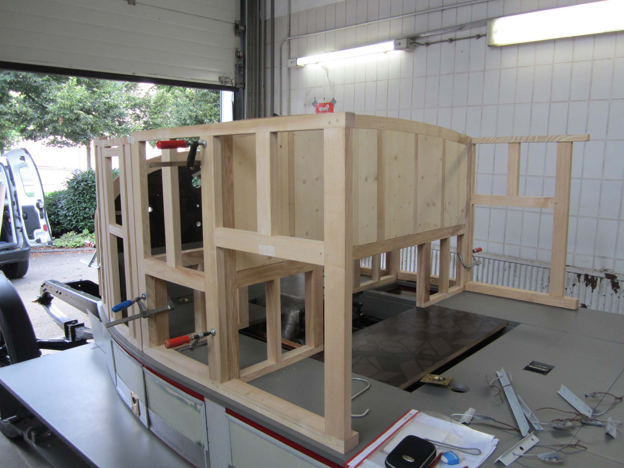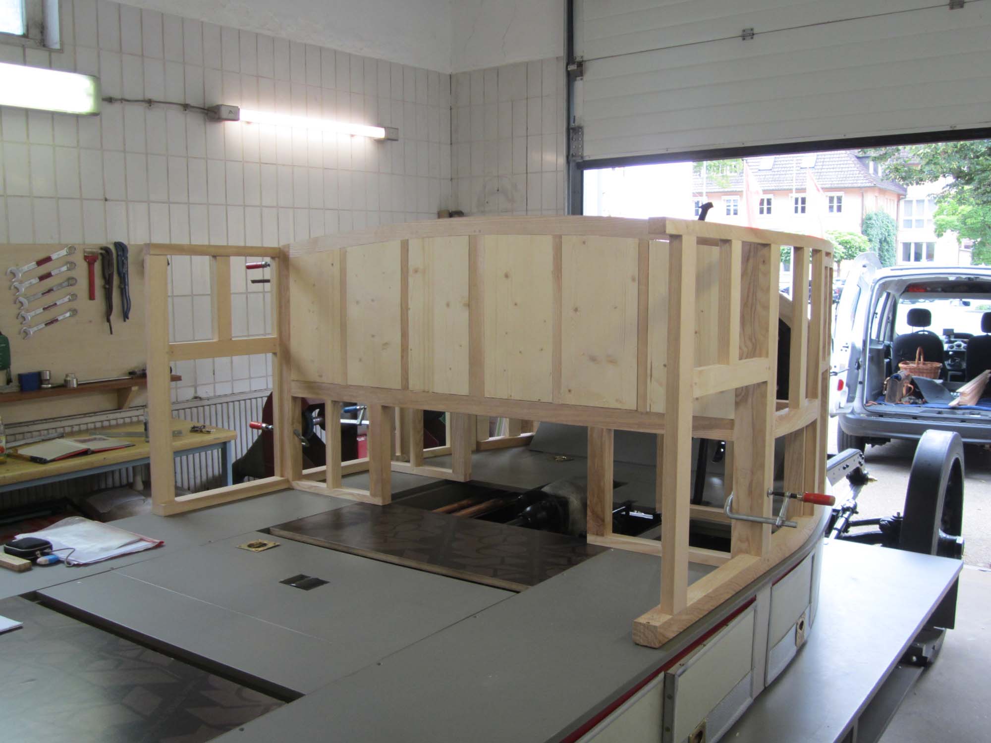 So langsam nimmt der Holzaufbau auch schon konkrete Formen an. In einem ersten Test wurde dieser schon einmal auf das Fahrzeug aufgesetzt. Dies diente zur Kontrolle der bisherigen Arbeiten und um noch einige Anpassungen im Bereich des Armaturenbretts durchzuführen.