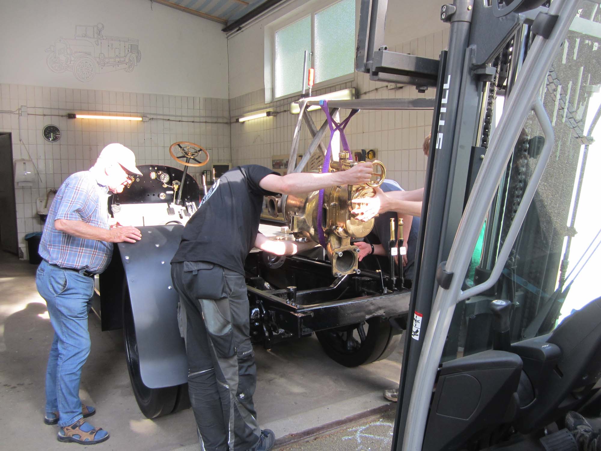 Um die dreistufige Feuerlöschkreiselpumpe im Heck einzubauen, haben wir das Fahrzeug gedreht. So konnte der Benz die Halle das erste Mal auf eigenen Räder verlassen – allerdings noch durch Muskelkraft angetrieben.