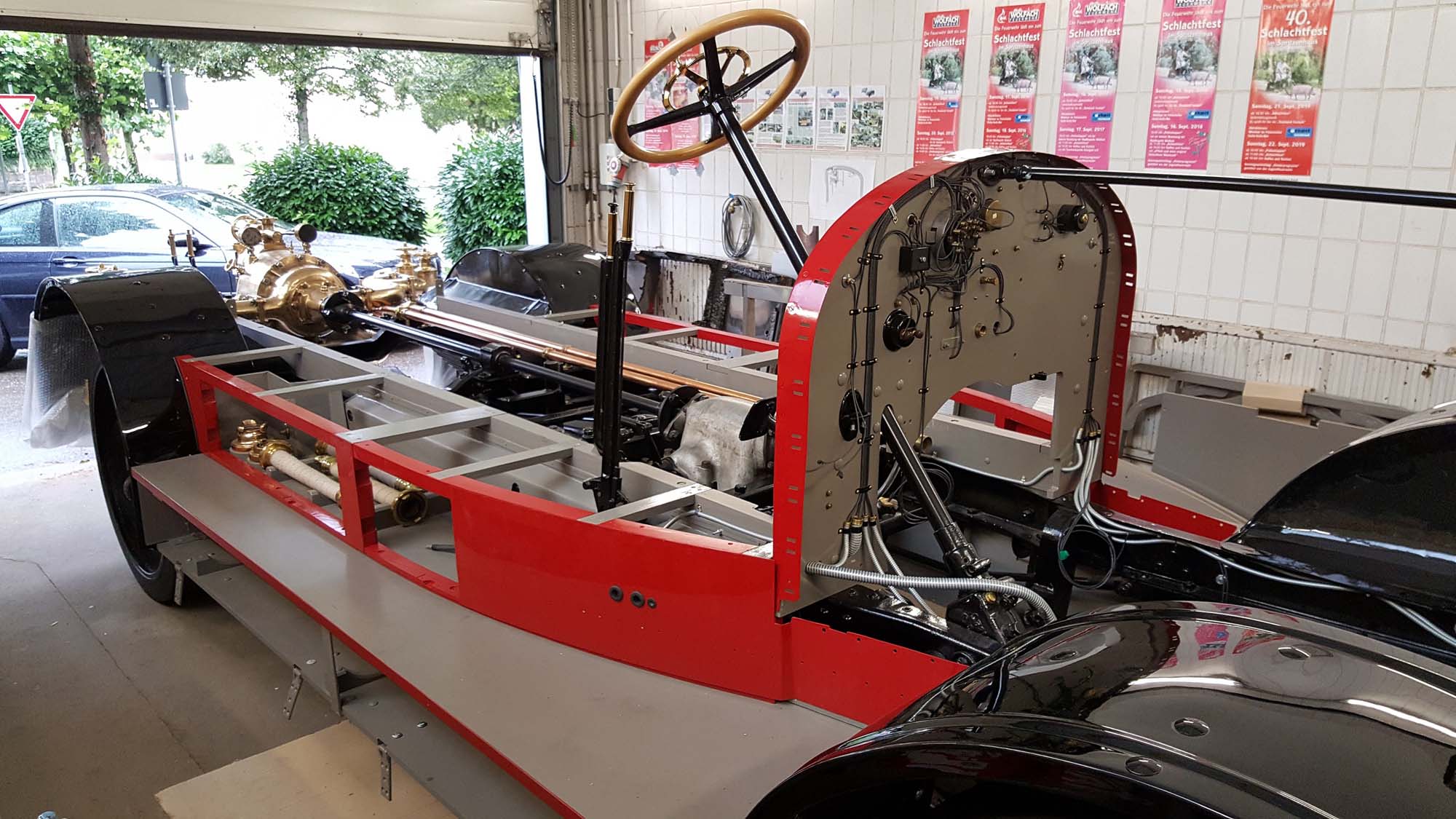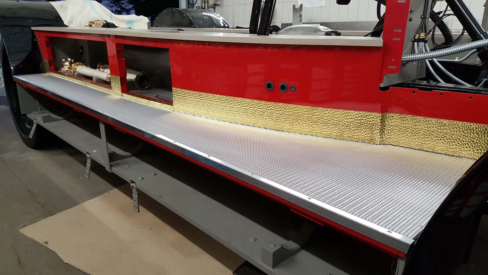 Nach und nach treffen die fertigen Teile vom Lackierer ein. Somit wächst auch der Aufbau wieder in die Höhe. Nach den Kotflügeln wurden nun auch die Gerätekästen endgültig montiert. Somit sind nun auch die ersten roten Teile wieder am Fahrzeug zu erkennen.