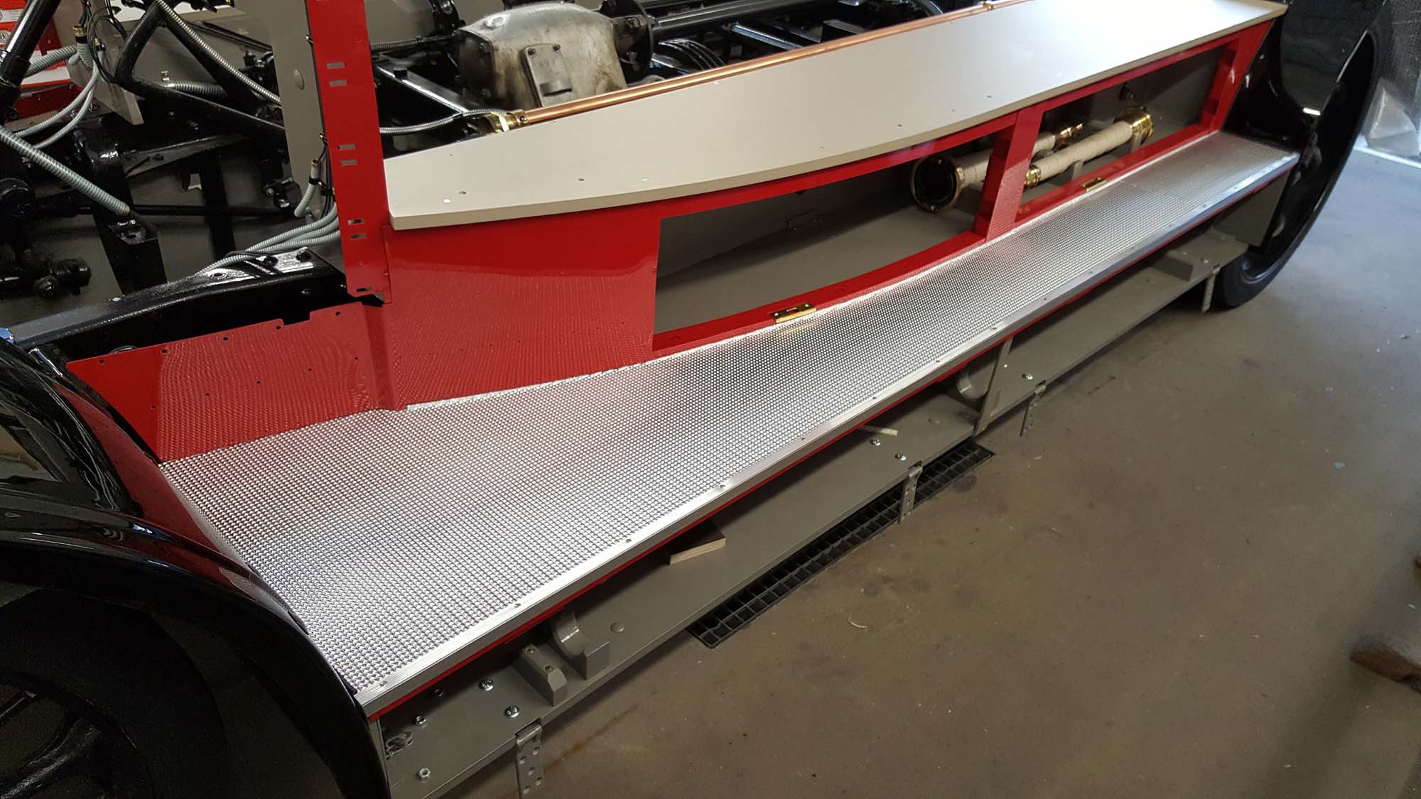 Im weiteren Schritt erfolgte die Fertigstellung der Trittbretter, die mit Pyramidenblech und einer Abschlussleiste versehen wurde. Hierzu wurde im Voraus eine Schablone aus Karton angefertigt, mit der dann letztendlich die Form auf das Blech übertragen wurde. So gestaltete sich Anpassung an den Aufbau einfacher. Eine kleine Abkantung des Bleches entlang des Aufbaus schützt diesen später vor dem Regenwasser. Die Kante verschwindet in einer Nut und wird später von Messingblech verdeckt sein. Dieses Messingblech, das als Hammerschlagblech ausgeführt ist, schützt die Lackierung im unteren Bereich vor Schäden durch das Ein- und Aussteigen. Der Blechstreifen ist auf der gesamten Länge auf den Aufbau aufgenagelt.