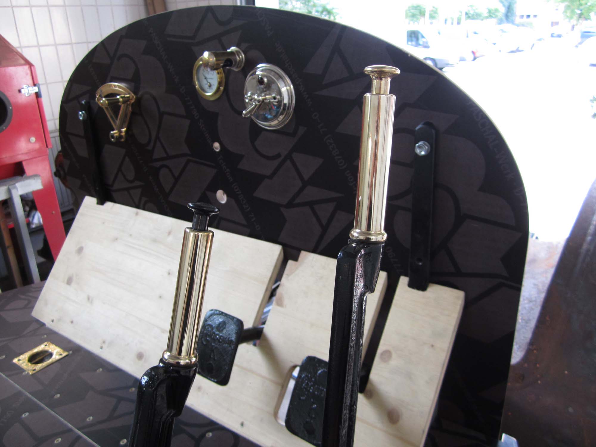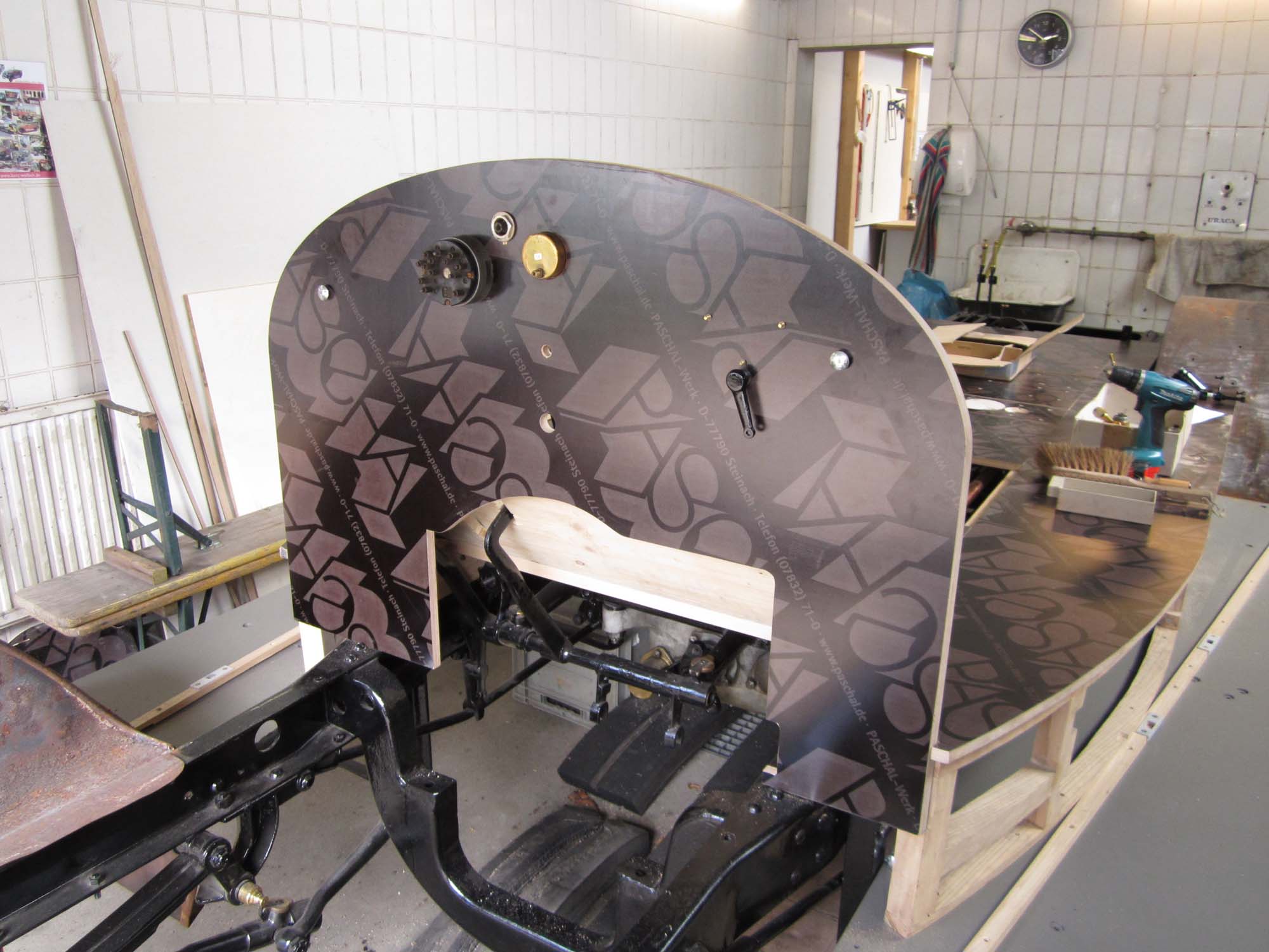 Auch das Armaturenbrett nimmt langsam Formen an. Die Außenkonturen sind fertiggestellt und die Aussparungen für die Armaturen sind auch gefräst. Da vom alten Armaturenbrett nach dem Brand nichts übrig blieb mussten die gesamten Maße neu konstruiert werden. Die Position der Instrumente ließ sich nur anhand vorhandener Fotos ermitteln. Diese Teile mussten übrigens alle neu beschafft oder nachgefertigt werden. Arbeiten an einzelnen Teilen, wie zum Beispiel dem Ölschauglas sind noch im Gange.