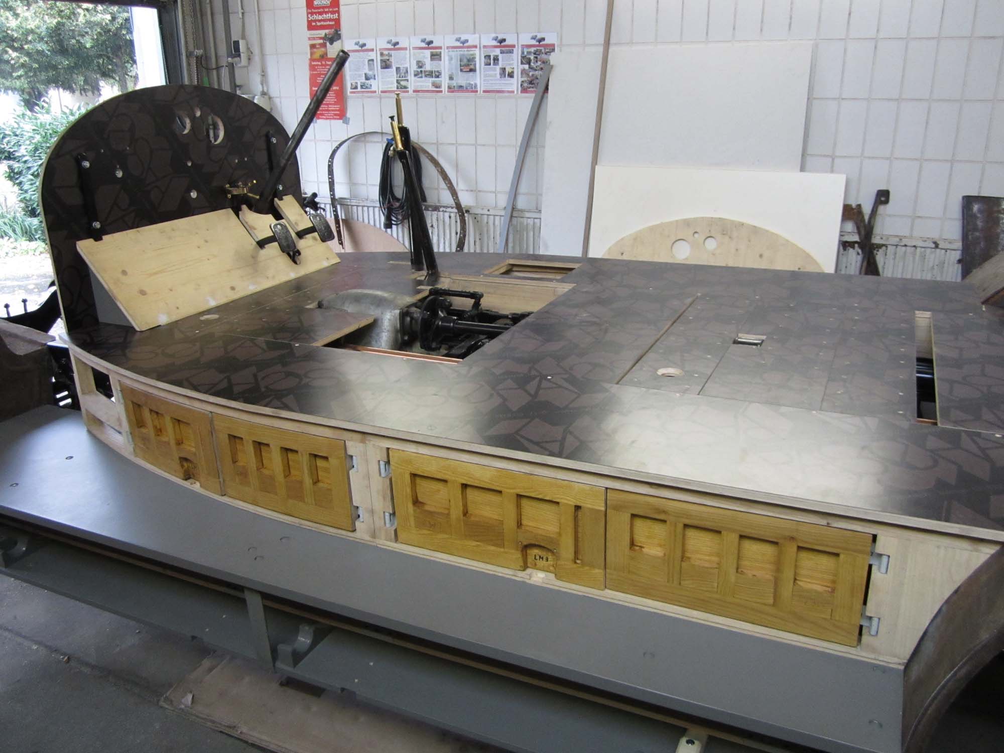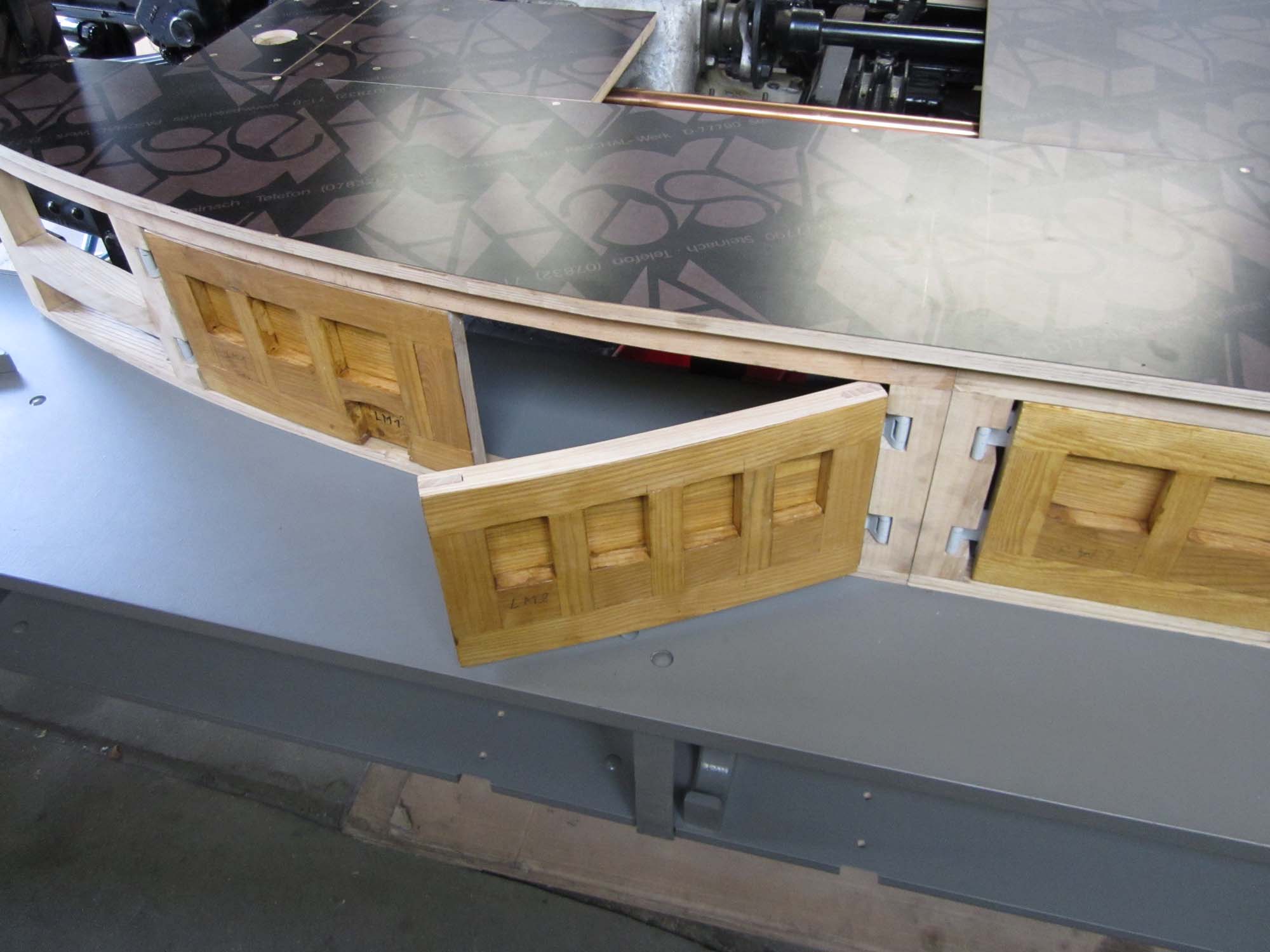 Wie schon die Klappen der Saugschlauchkästen sind auch diese Klappen in aufwendiger Rahmenbauweise erstellt worden. Die leichte Biegung der Klappen erschwerte diese Arbeiten zusätzlich. Die Abmessungen konnten mit den alten Blechen und den umlaufenden Leisten gut rekonstruiert werden. Auch deshalb ließen sich die Türen auch recht gut in den Holzrahmen einpassen. Es kamen hier wieder die Originalscharniere zum Einsatz, die aus dem Brandschutt gerettet wurden. Nun werden die Türen der Geräteräume noch mit Blech beplankt und die Leisten müssen noch angeschraubt werden. Es folgen dann noch eventuelle Korrekturen an der Einpassung und das Setzen der Schließbleche und Anschlagwinkel.