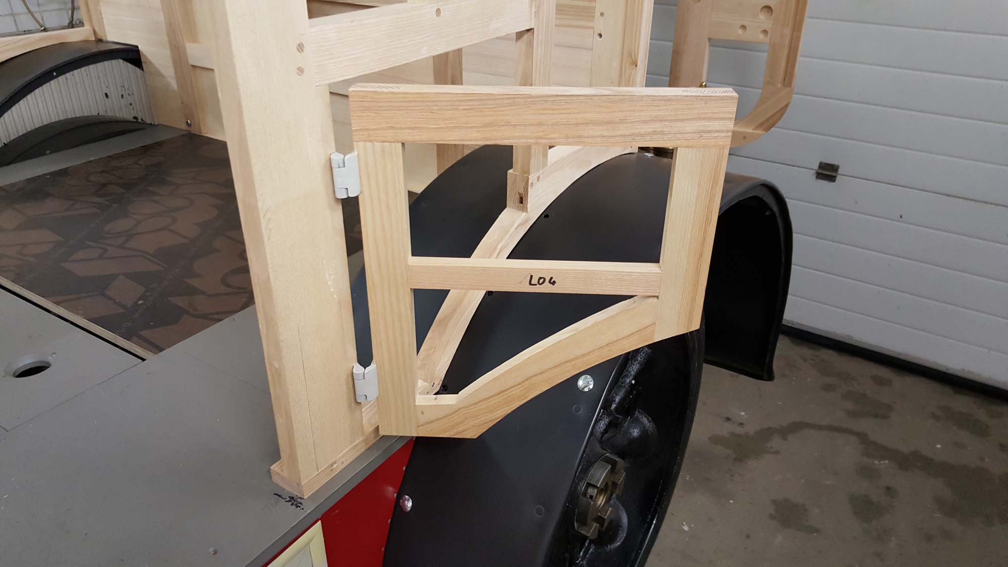 In den Seitenwänden wurden die ersten Türen angepasst. Dabei müssen die Ausschnitte für die Scharniere und Schloss gefräst werden. Die Türen haben dabei auch eine hölzerne Innenverkleidung erhalten. Auf der Außenseite werden diese dann nach der Grundierung mit Blech beplankt.