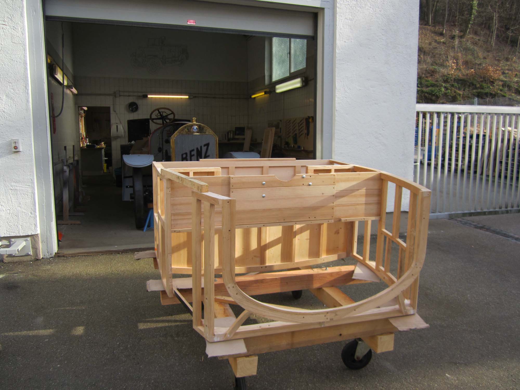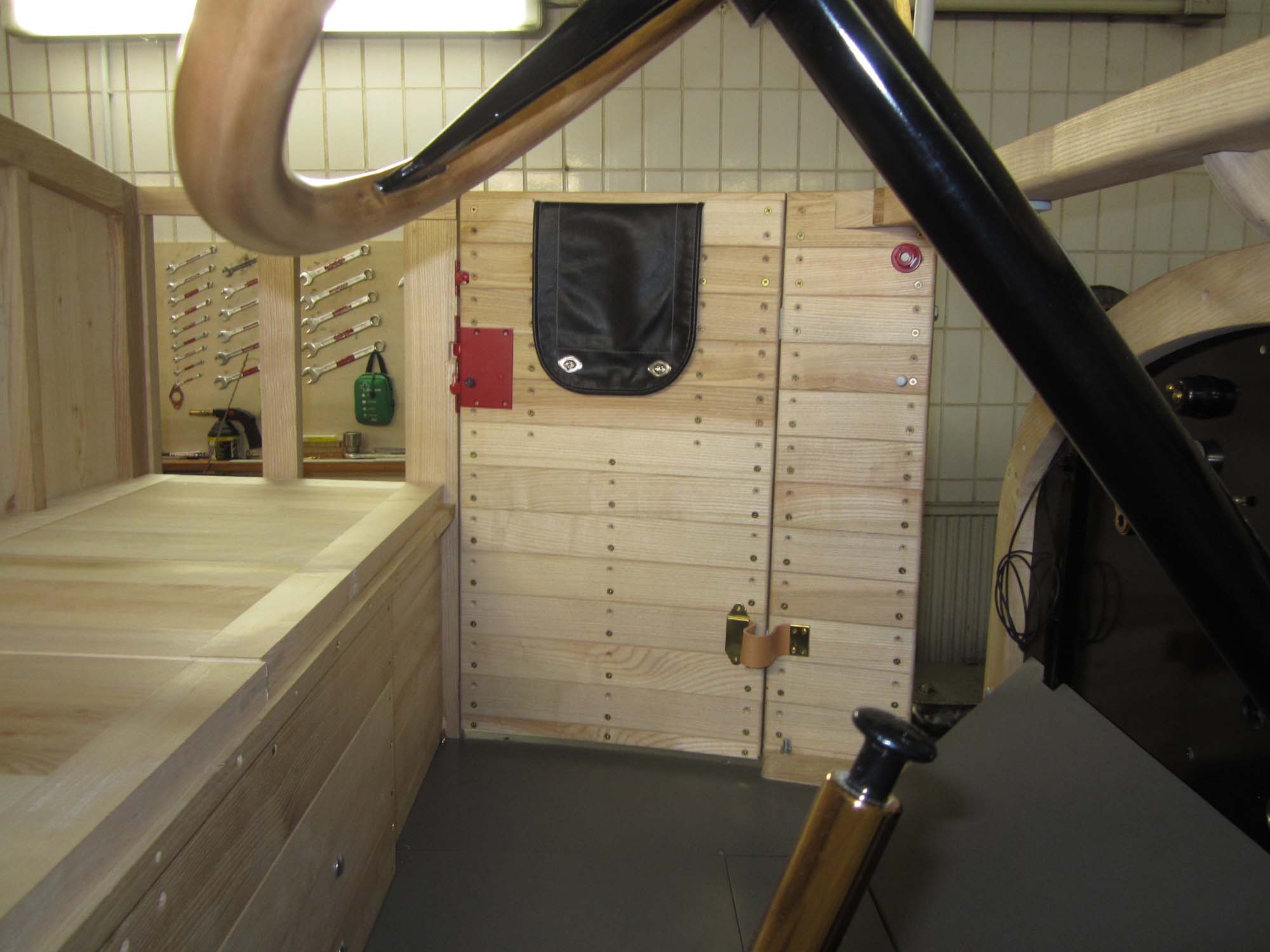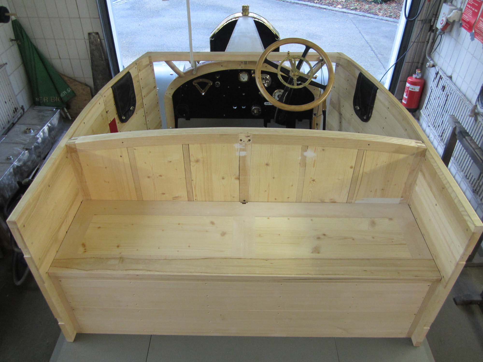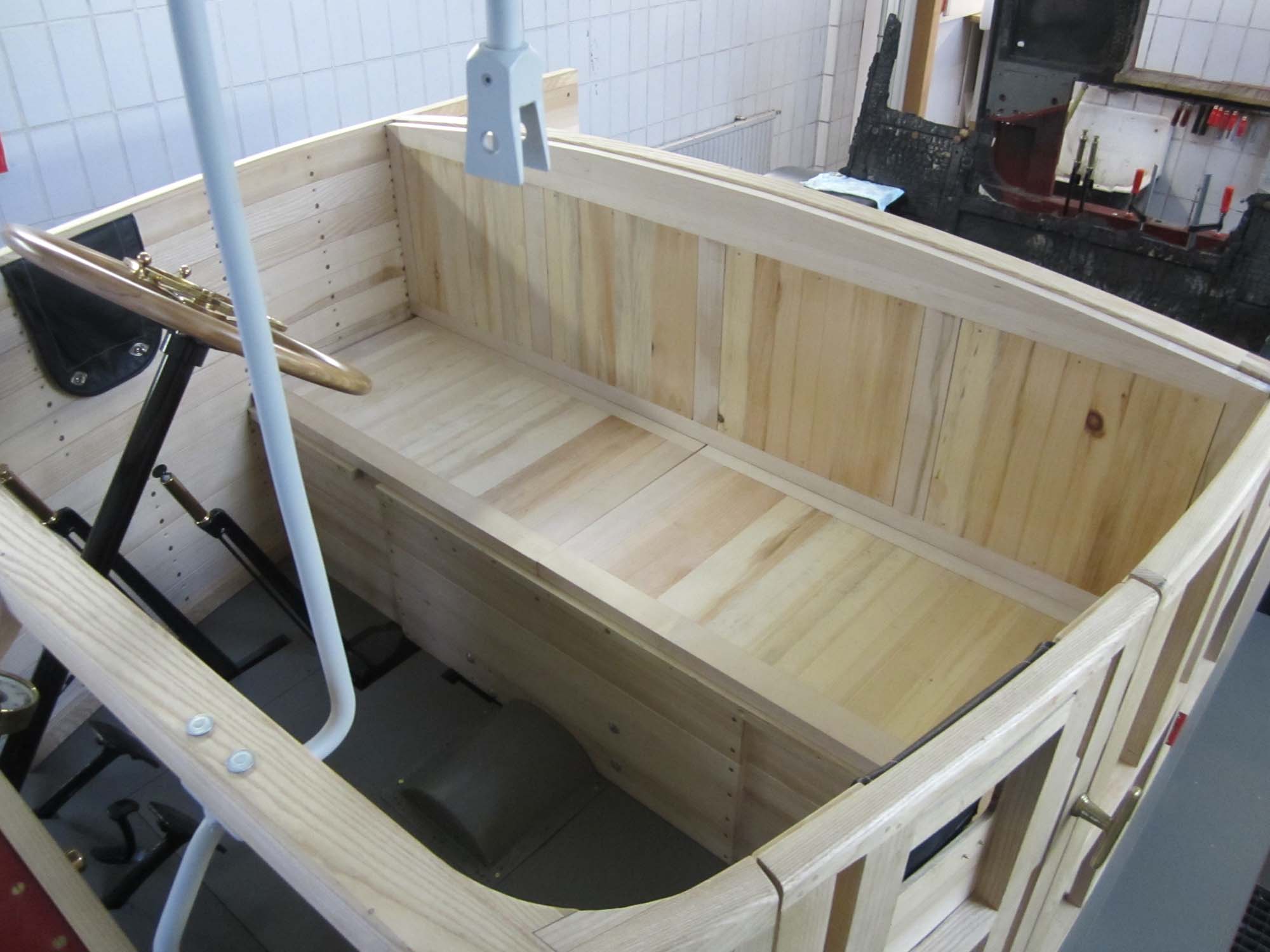 Die Innenverkleidung ist komplett angebracht und auch alle Schlösser und Anbauteile sind angepasst. Auch die Haltebänder der Türen mit den Messingbeschlägen sind fertig. Die Holzteile werden jetzt nach und nach grundiert und somit für die Beplankung mit Blech vorbereitet. Für diese Aufgaben wurde ein Montagegestell gebaut, auf dem der Aufbau transportiert werden kann.