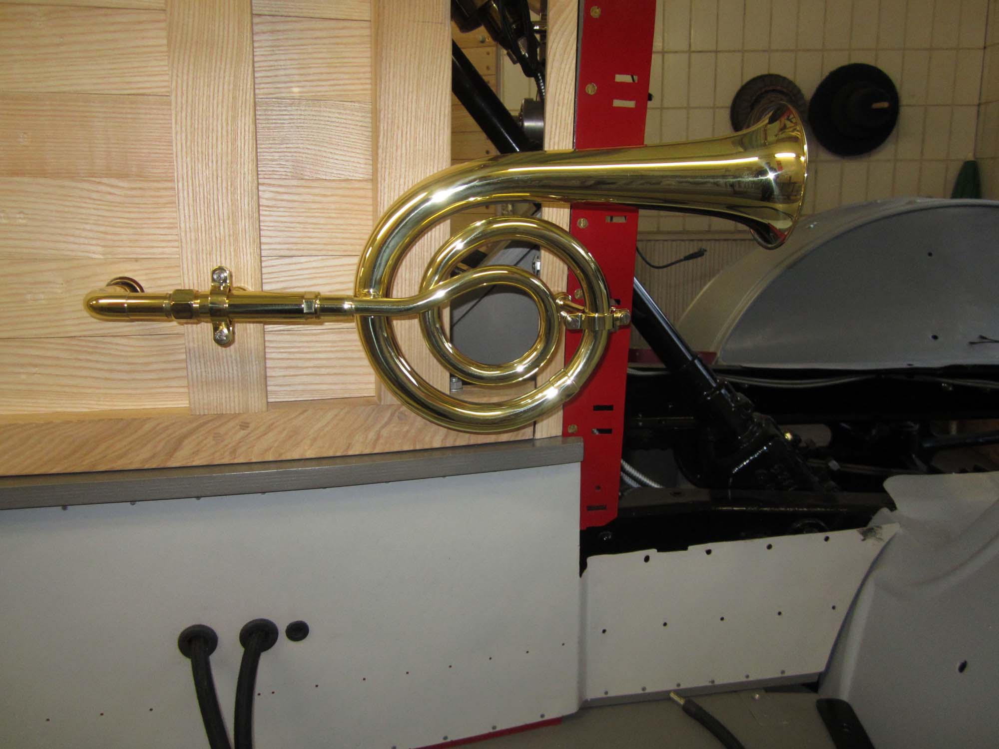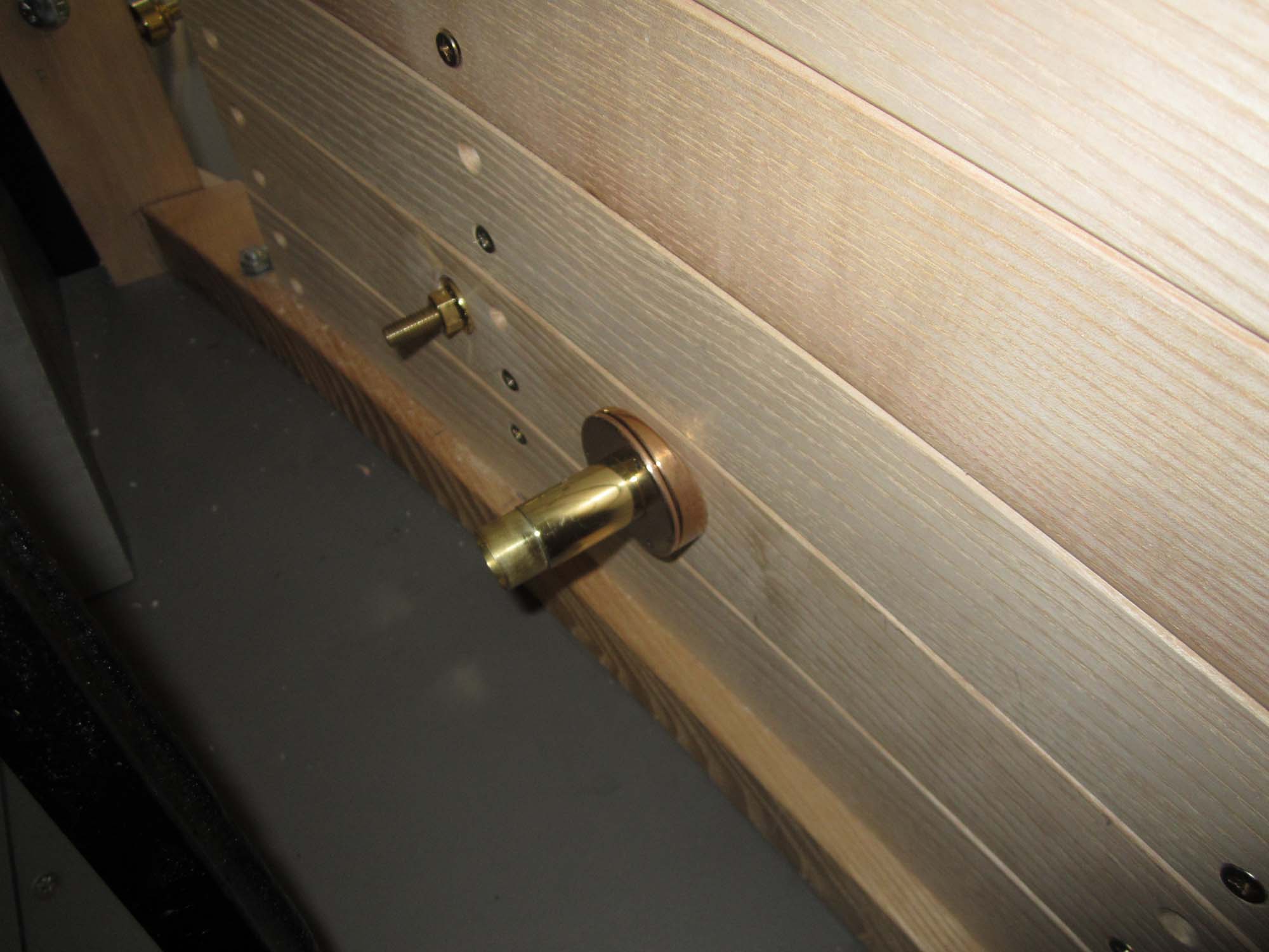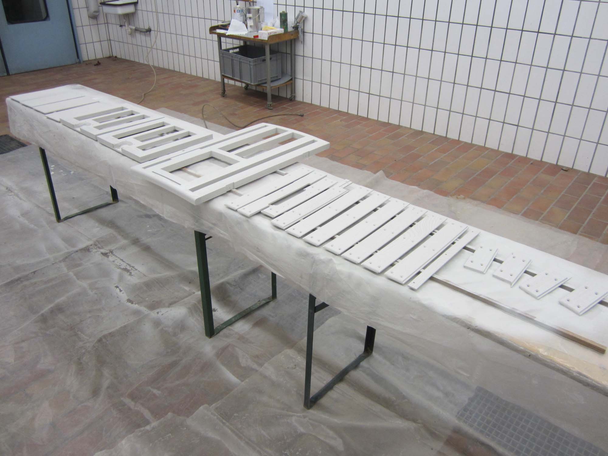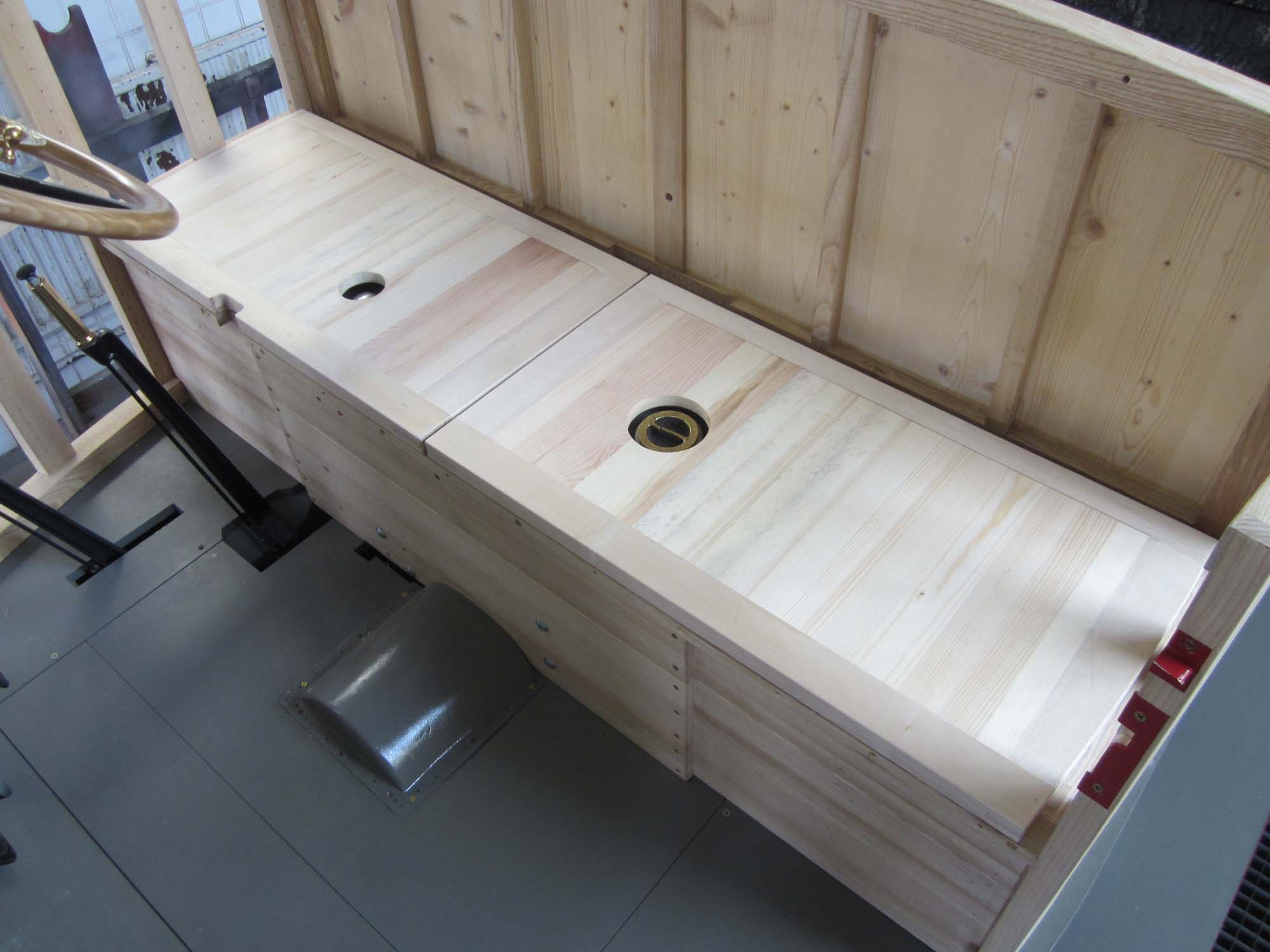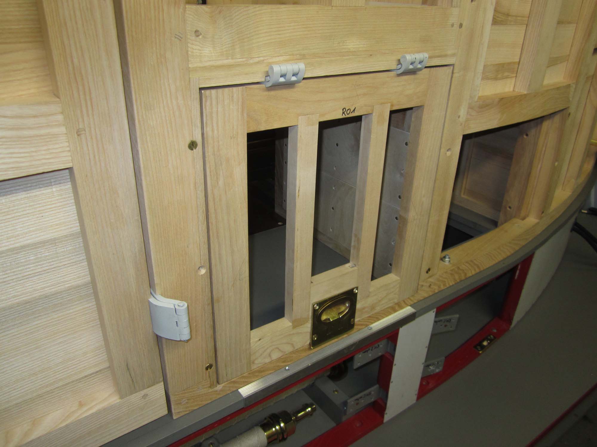 Die Innenverkleidung ist komplett angebracht und auch alle Schlösser und Anbauteile sind angepasst. Auch die Haltebänder der Türen mit den Messingbeschlägen sind fertig. Die Holzteile werden jetzt nach und nach grundiert und somit für die Beplankung mit Blech vorbereitet. Für diese Aufgaben wurde ein Montagegestell gebaut, auf dem der Aufbau transportiert werden kann.
