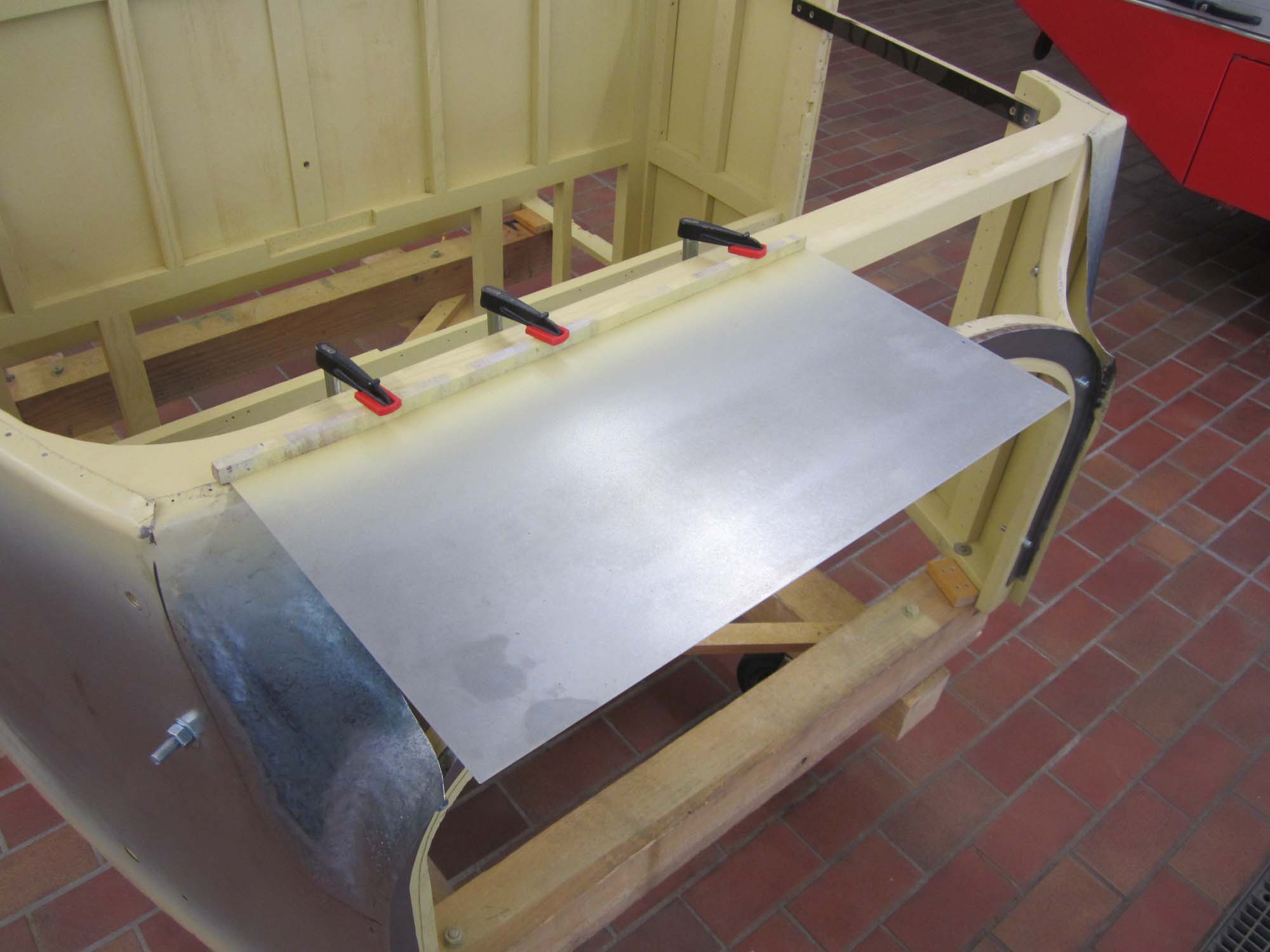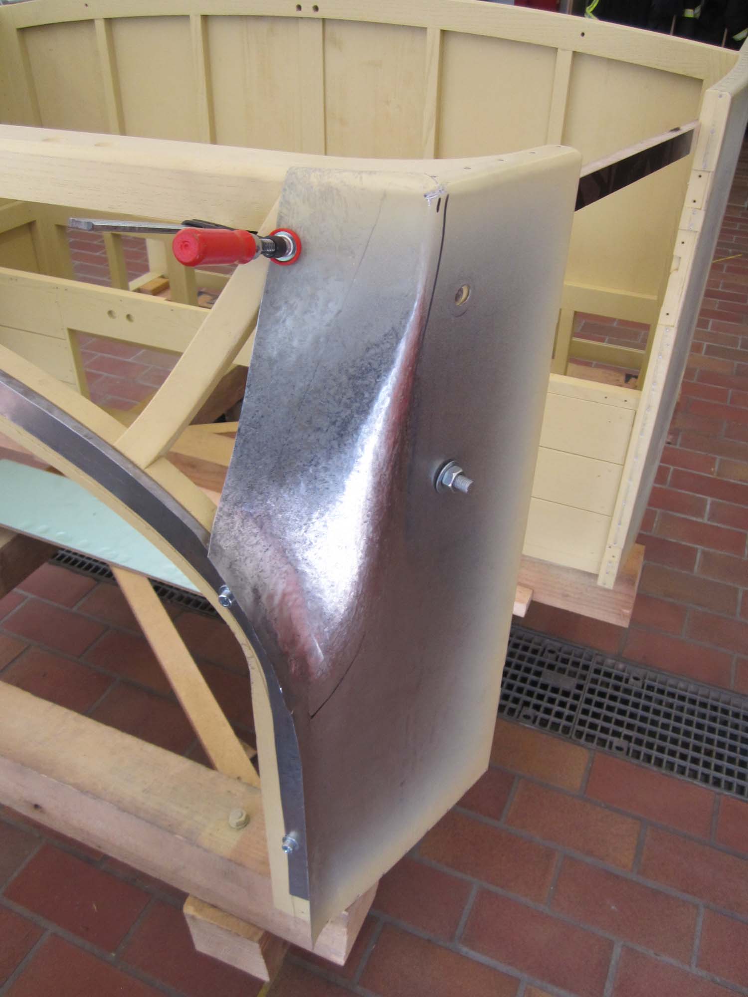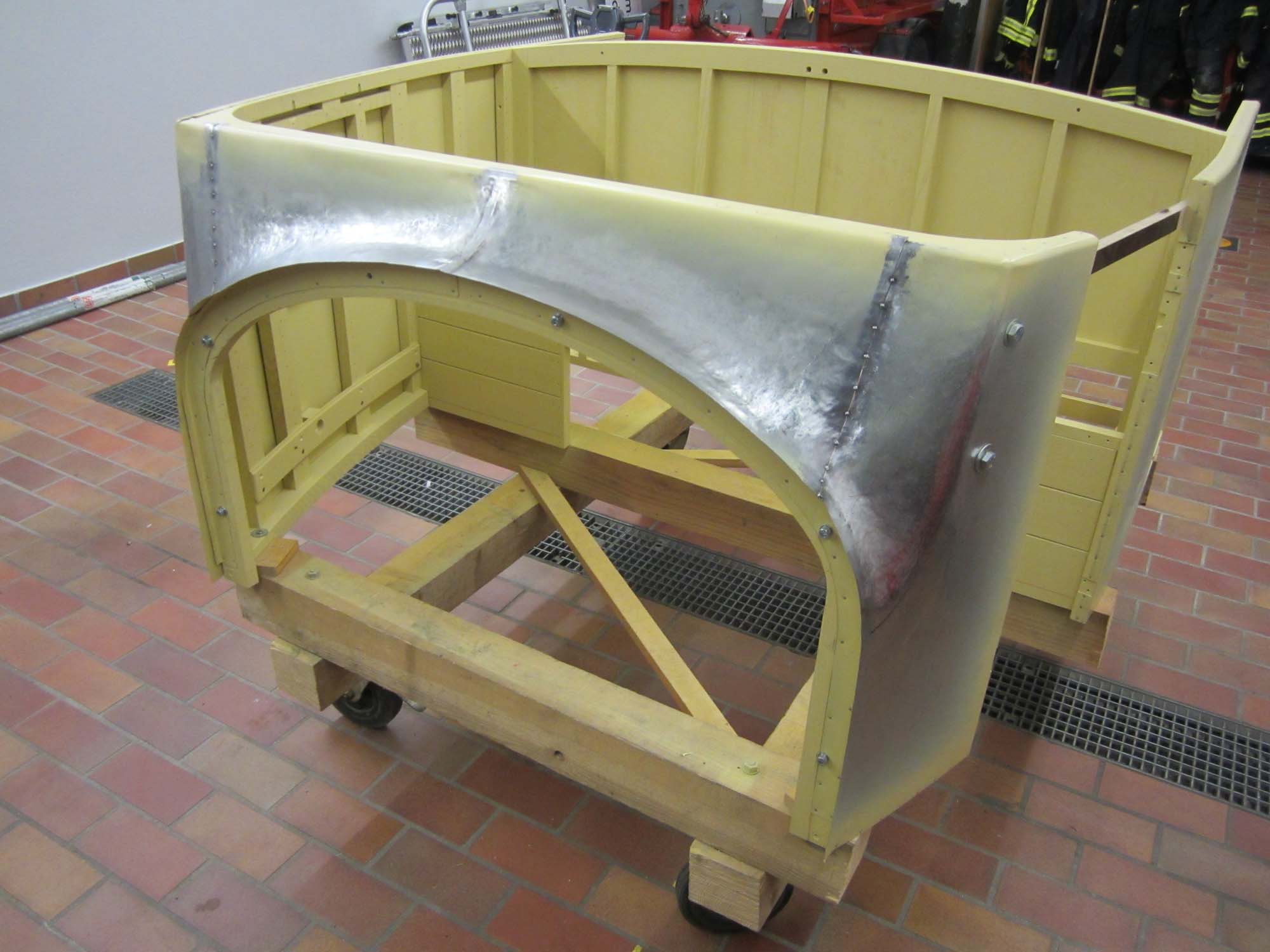 Dabei besteht der vordere Teil nicht nur aus einem Blech sondern aus zwei Teilen, die dann an den  beiden Seitenwände anschließen. So war es auch schon beim Originalblech gemacht. Das zuvor auf den Holzaufbau aufgenagelte Karosserieblech musste dazu erst einmal grob in Form gebracht werden. Dies wurde mit einem speziellen Holzhammer durchgeführt. Die vorderen Teile der Seitenwände wurden dabei grob in Richtung Mitte umgebördelt. Überschüssiges Blech konnte dann mit der Blechschere entfernt werden. Die Seitenbleche laufen dabei etwa 10 Zentimeter auf der Vorderseite in Richtung Aufbaumitte. Aufgrund der großen Formänderung des Blechs kann das seitliche Blech nicht bis in die Mitte geführt werden. In diesem Bereich sind dann zwei extra Blechteile eingesetzt. Auch diese wurden mit Hilfe des Holzhammers in die entsprechende Form gebracht. Besonders schwierig wird dies dadurch, dass das Blech hier in zwei Richtungen gebogen werden muss. Nach der Herstellung der groben Form, wurden die beiden mittleren Blechteile in der Mitte zusammengeschweißt und verschliffen. Im Anschluss daran folgte die Grundierung der Innenseite. Danach folgte noch einmal eine Bearbeitung mit dem Holzhammer um die Form weiter zu verbessern. Um das Blechteil zwischen die beiden Seitenteile einzusetzen wurde der überlappende Rand so abgeschnitten, dass die Bleche stumpf verschweißt werden können. Nach dem Punkten folgte dann das Schweißen, womit die Karosserie dann zu einem Stück zusammen gewachsen ist. Für die endgültige Form wurde das Blech dann noch einmal mit dem Holzhammer bearbeitet. Um die restlichen Unebenheiten zu entfernen und das Blech zu stabilisieren folgte dann die Verzinnung mit Karosseriezinn. Hierbei wird das Blech erwärm und mit dem zähflüssigen Zinn überzogen. Auch die Form kann dadurch noch etwas modelliert werden. Nachdem das Zinn erkaltet ist, folgte die mechanische Bearbeitung mit der Karosseriefeile. Die endgültige Oberfläche erhält man dann durch Schleifen. Nach dem Schleifen folgte dann die Grundierung der Karosserie. Kleine Unebenheiten wurden danach noch mit Spachtelmasse korrigiert, bevor dann die zweite und letzte Grundierschicht erfolgt.