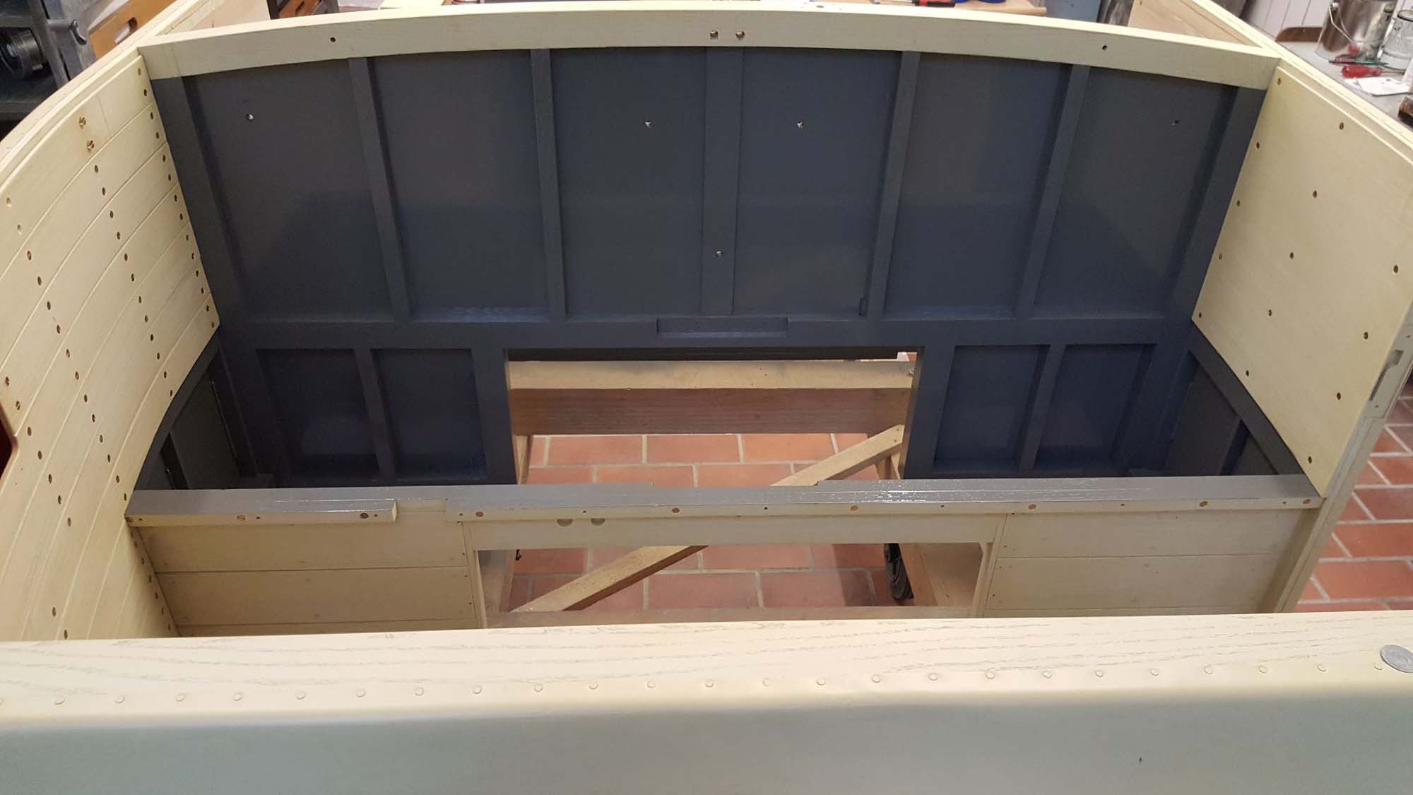 Nach dem vorderen Teil des Aufbaus wurde nun auch der hintere Teil von Innen lackiert, während der vordere Teil schon seine rote Lackierung beim Lackierer bekommt.
