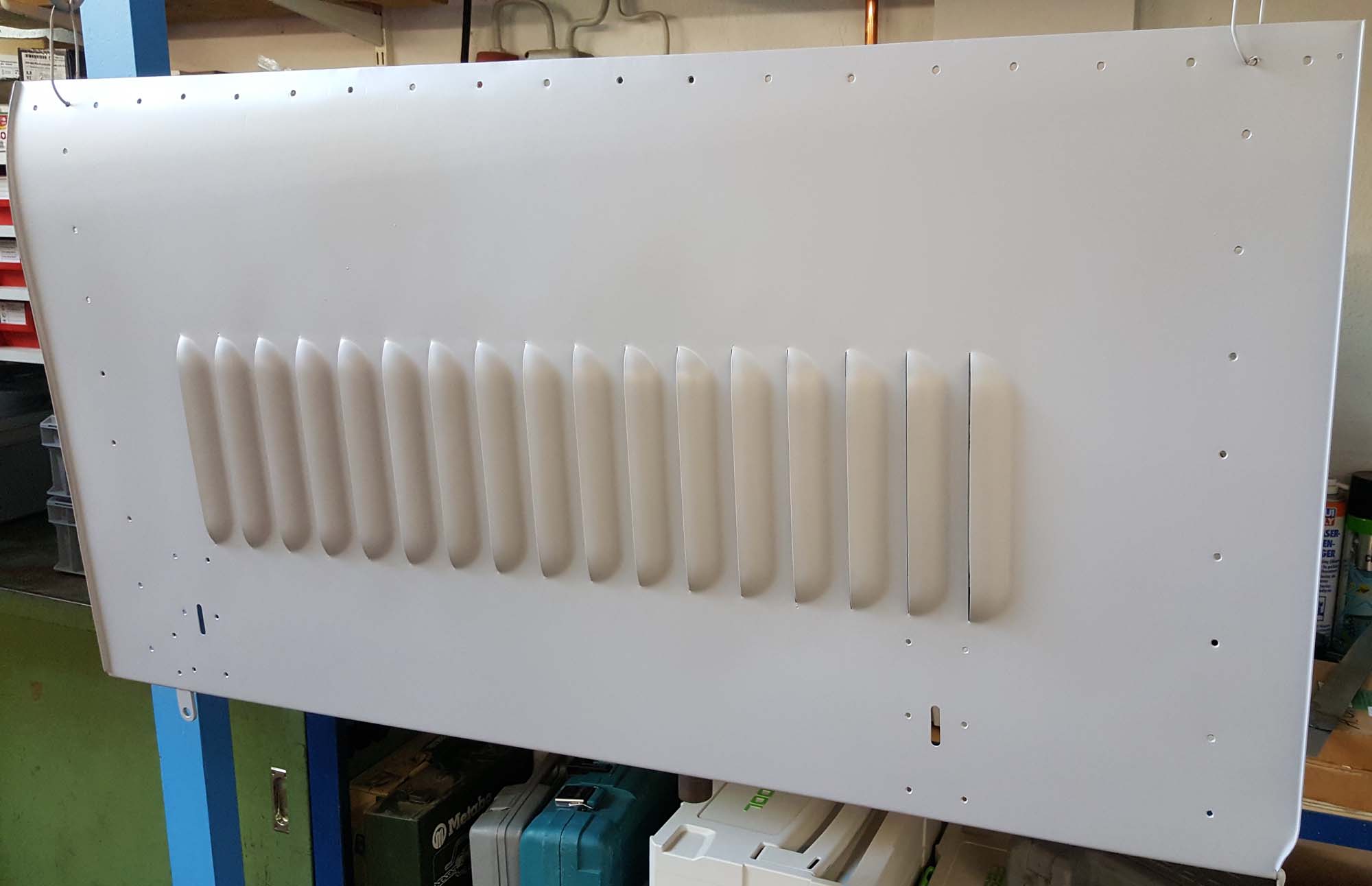 Die Blecharbeiten an der Motorhaube sind nun abgeschlossen und die letzten beiden Teile wurden grundiert. Jetzt können die Haubenteile genietet werden. Befestigt werden so die Scharnierbänder, die Verstärkungsleisten sowie die Verschlüsse der Motorhaube.