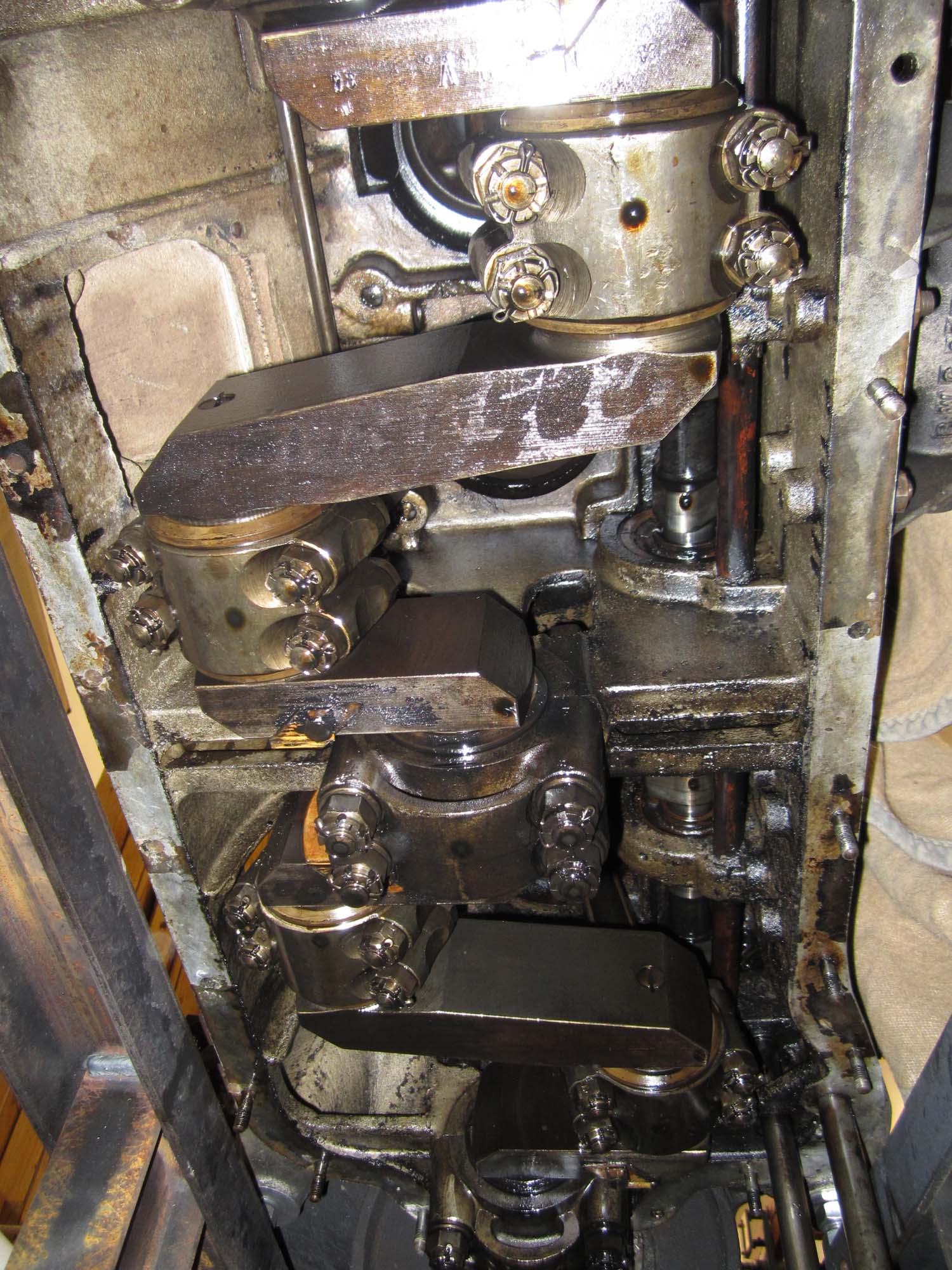 So können wir zum einen den Motor auf Schäden überprüfen und auch die Ölwanne gründlich reinigen. Kurbelwelle, Pleuel und Nockenwelle sind nach ersten Untersuchungen in einwandfreiem Zustand. Der Brand konnte dem soliden Aufbau des Motors nichts anhaben. Die fast 90 Jahre sieht man der Mechanik des Motors nicht an, was mit Sicherheit auch der geringen Laufleistung bisher zu verdanken ist. Die Ölwanne wurde innen komplett gereinigt und wird beim Zusammenbau später mit neuen Dichtungen versehen.
