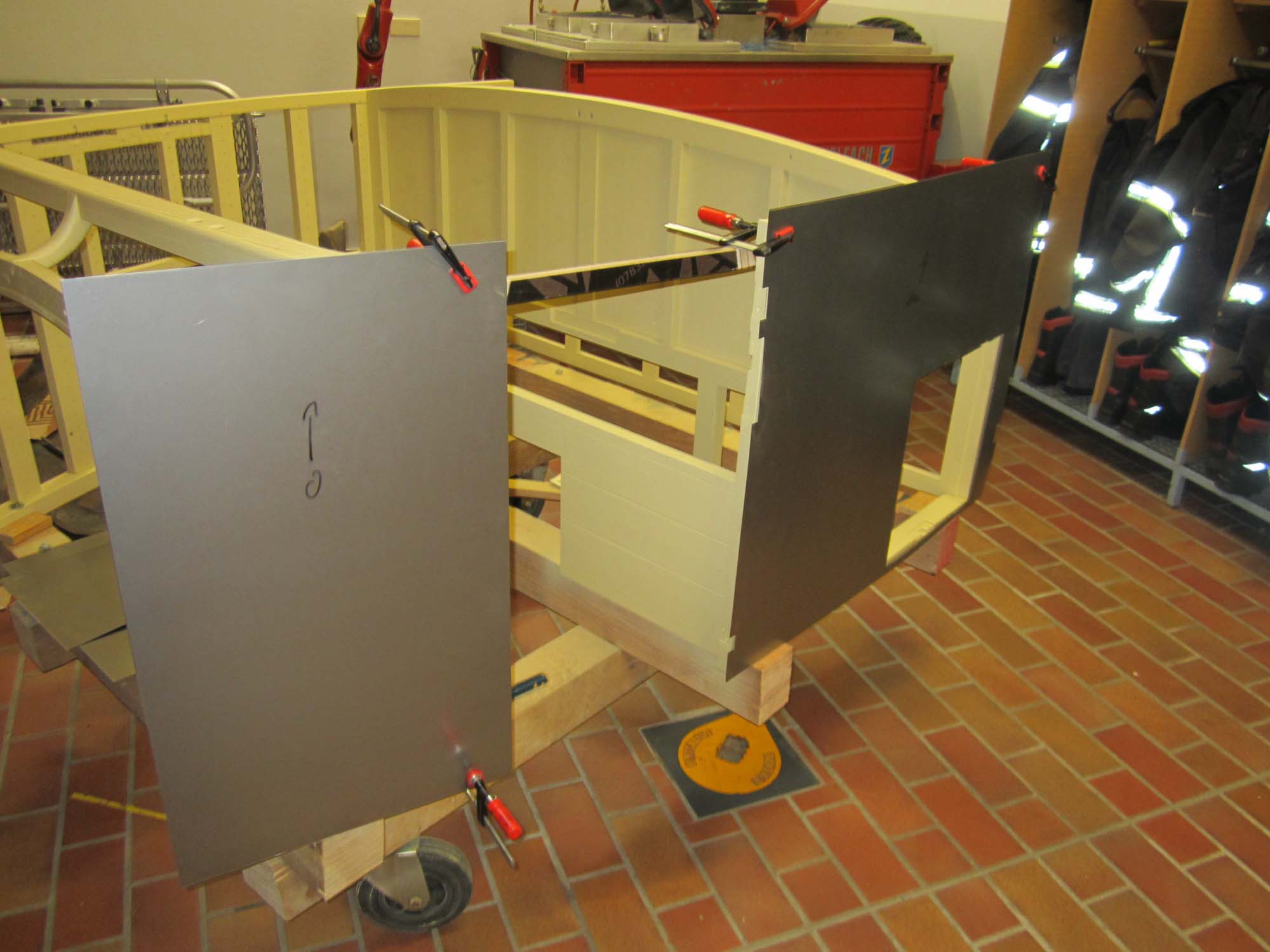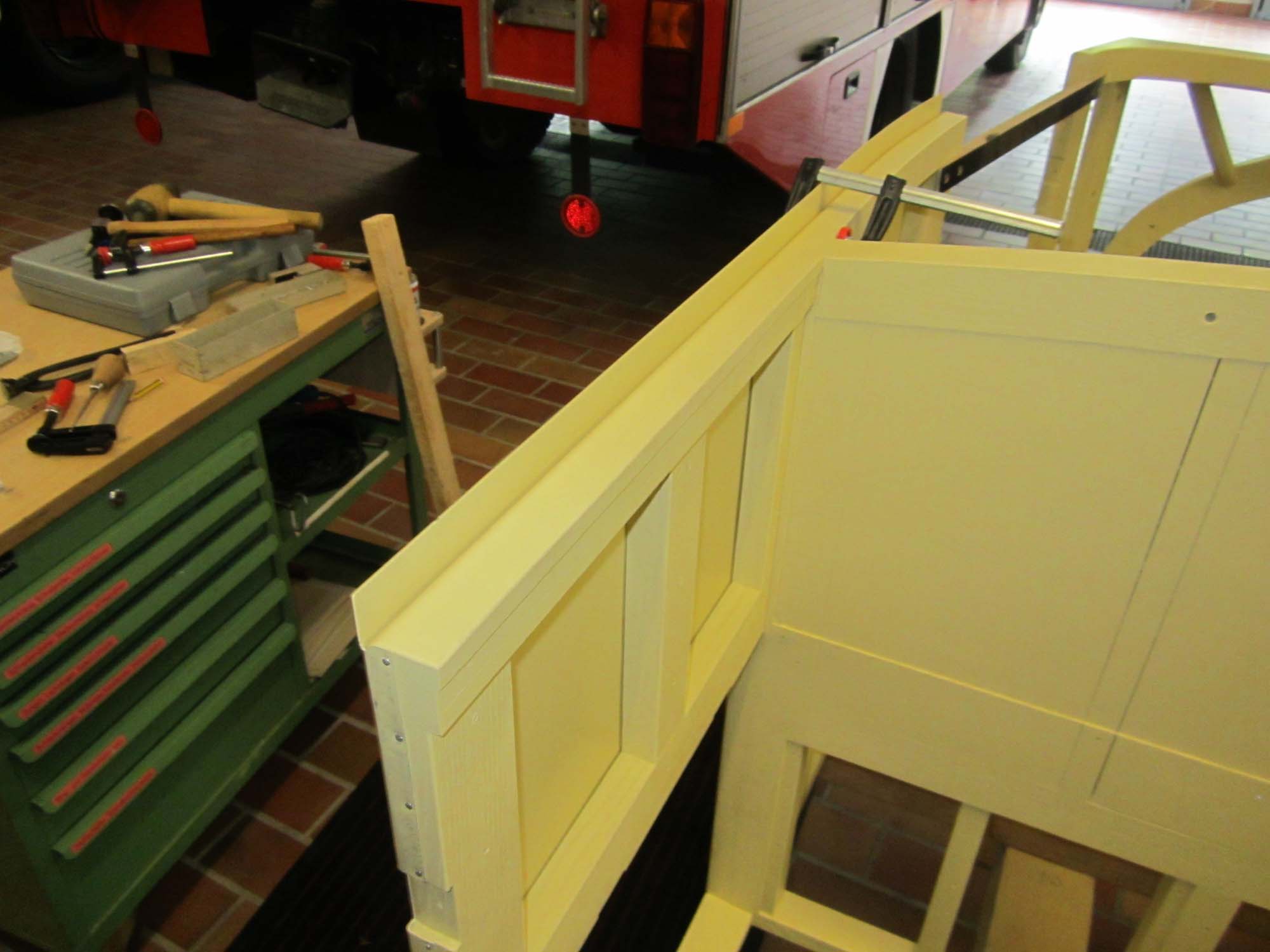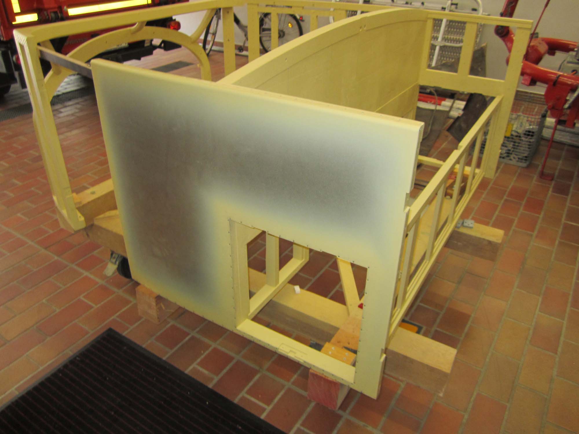 Nachdem die Türen und Klappen bereits mit Blech versehen sind, sind nun auch die Blecharbeiten am eigentlichen Aufbau in vollem Gange.